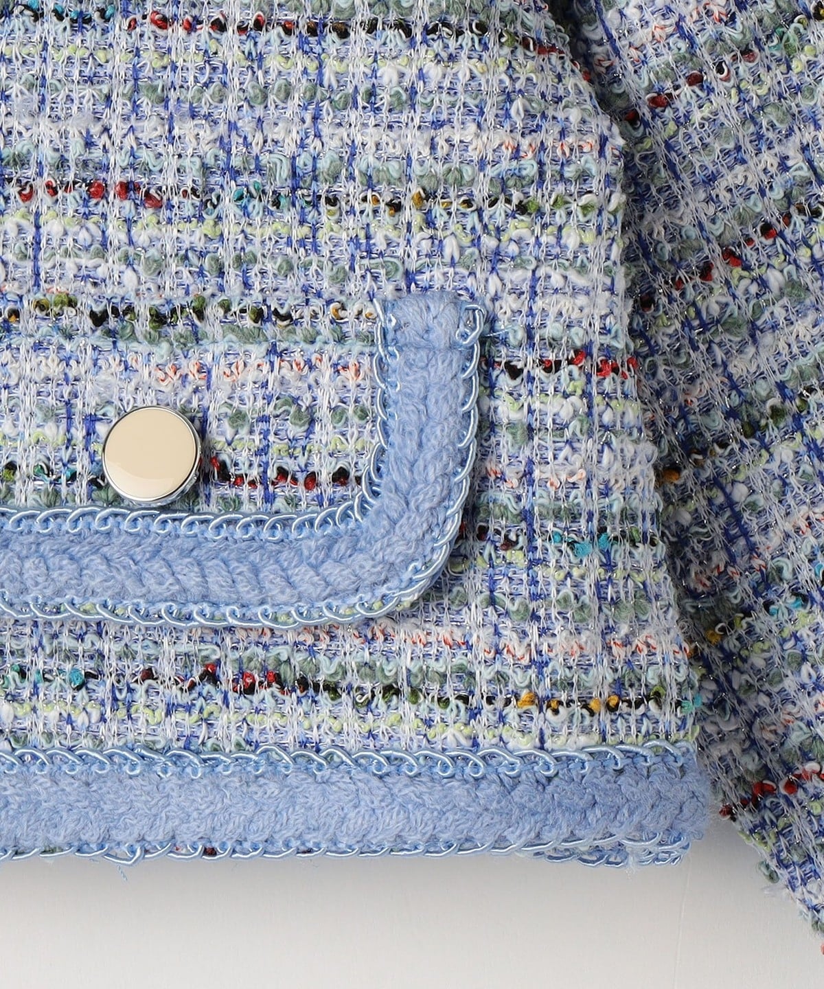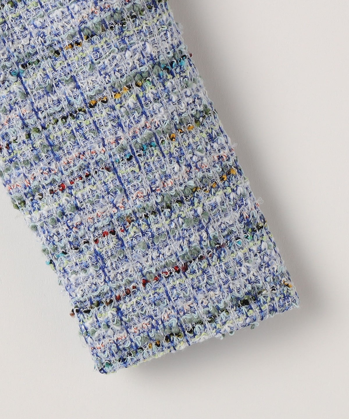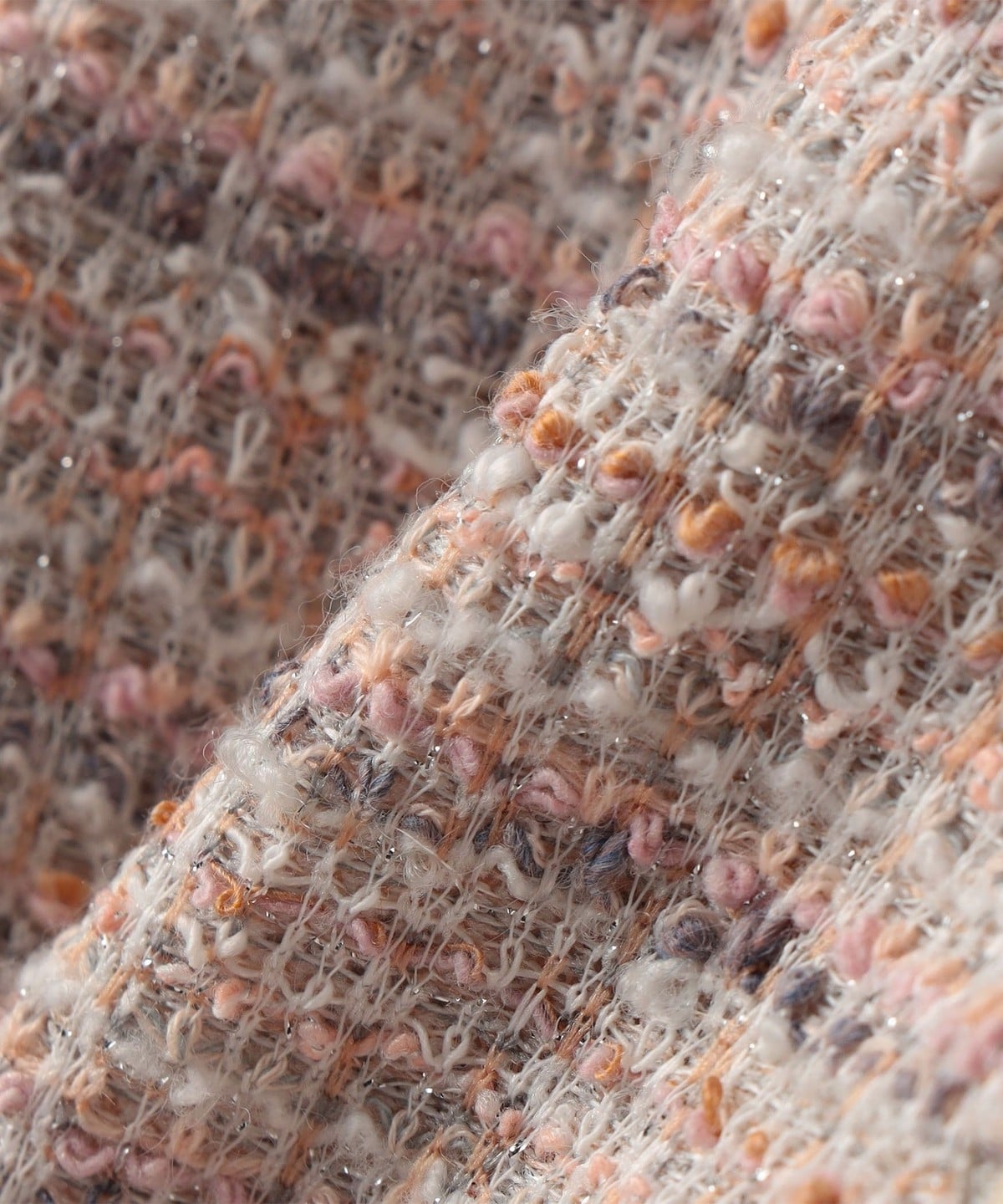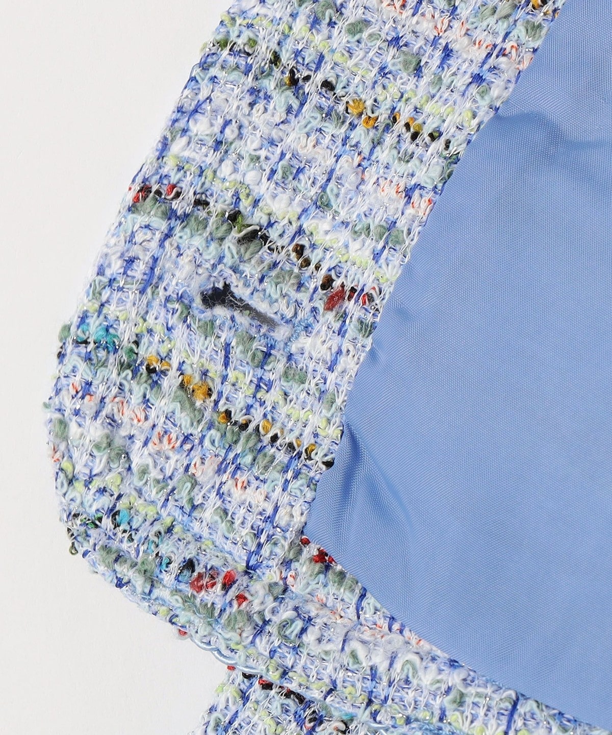 パステルカラーのツイード素材が華やかな印象で着ていただける1枚です。