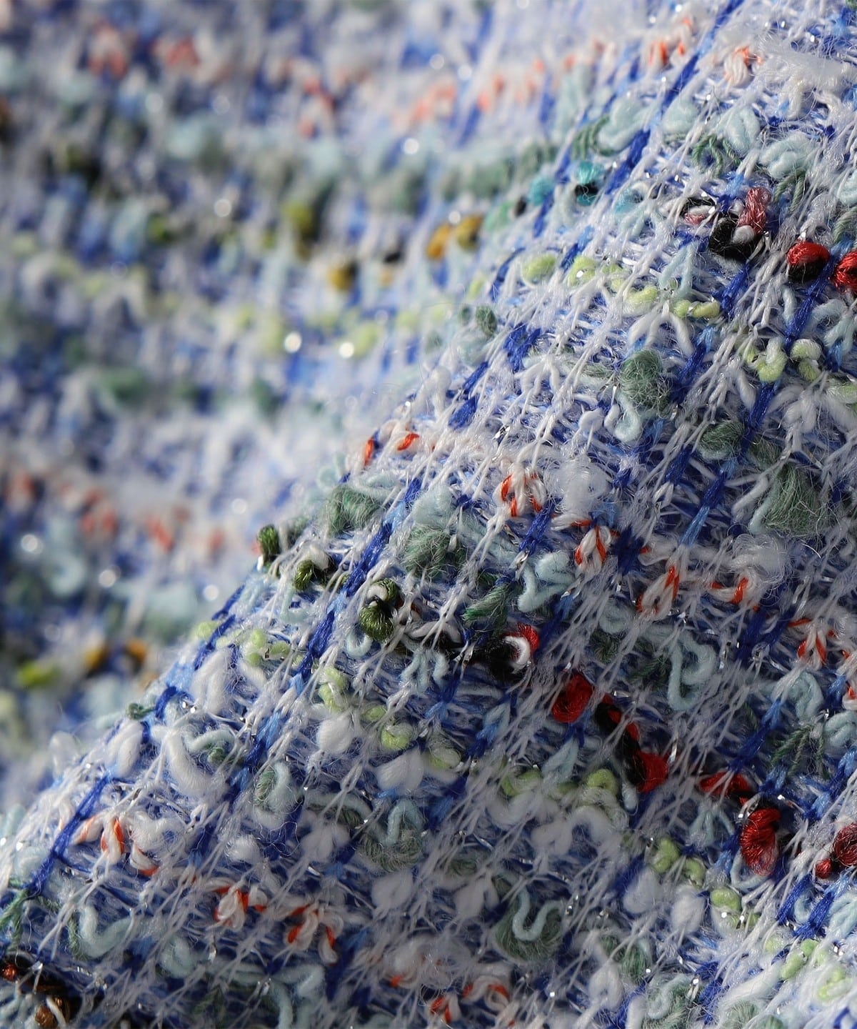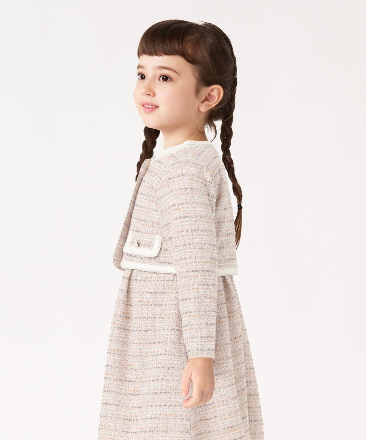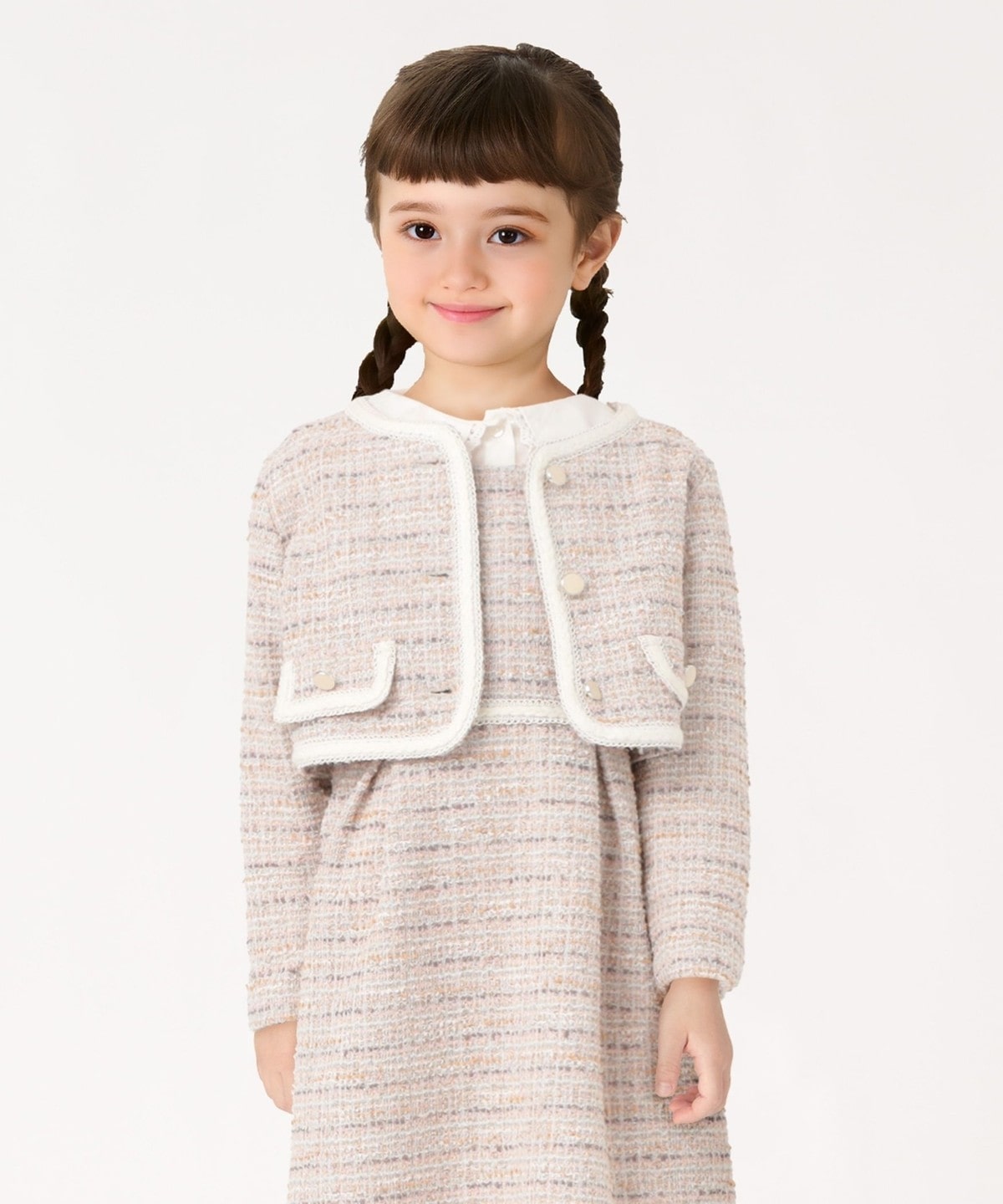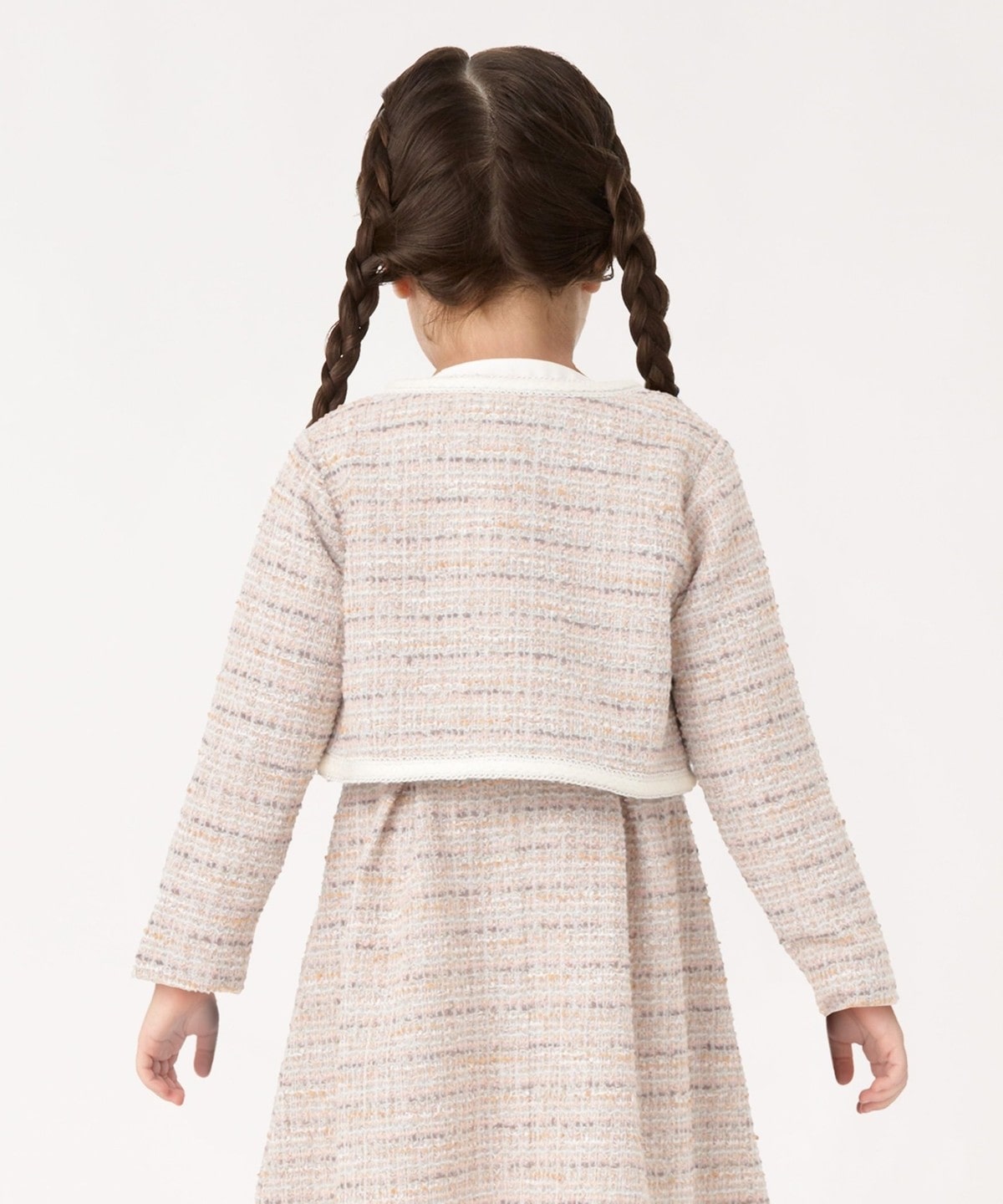 パステルカラーのツイード素材が華やかな印象で着ていただける1枚です。