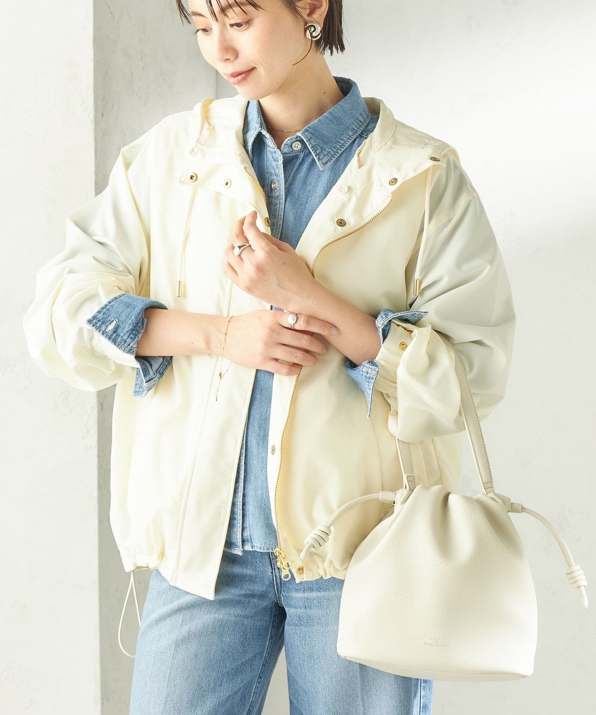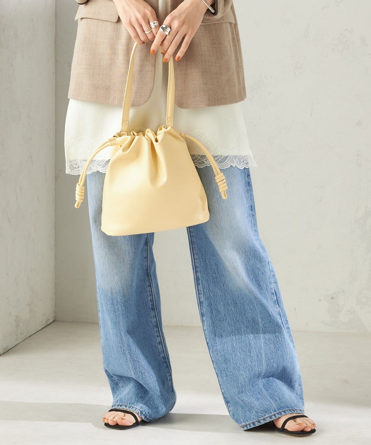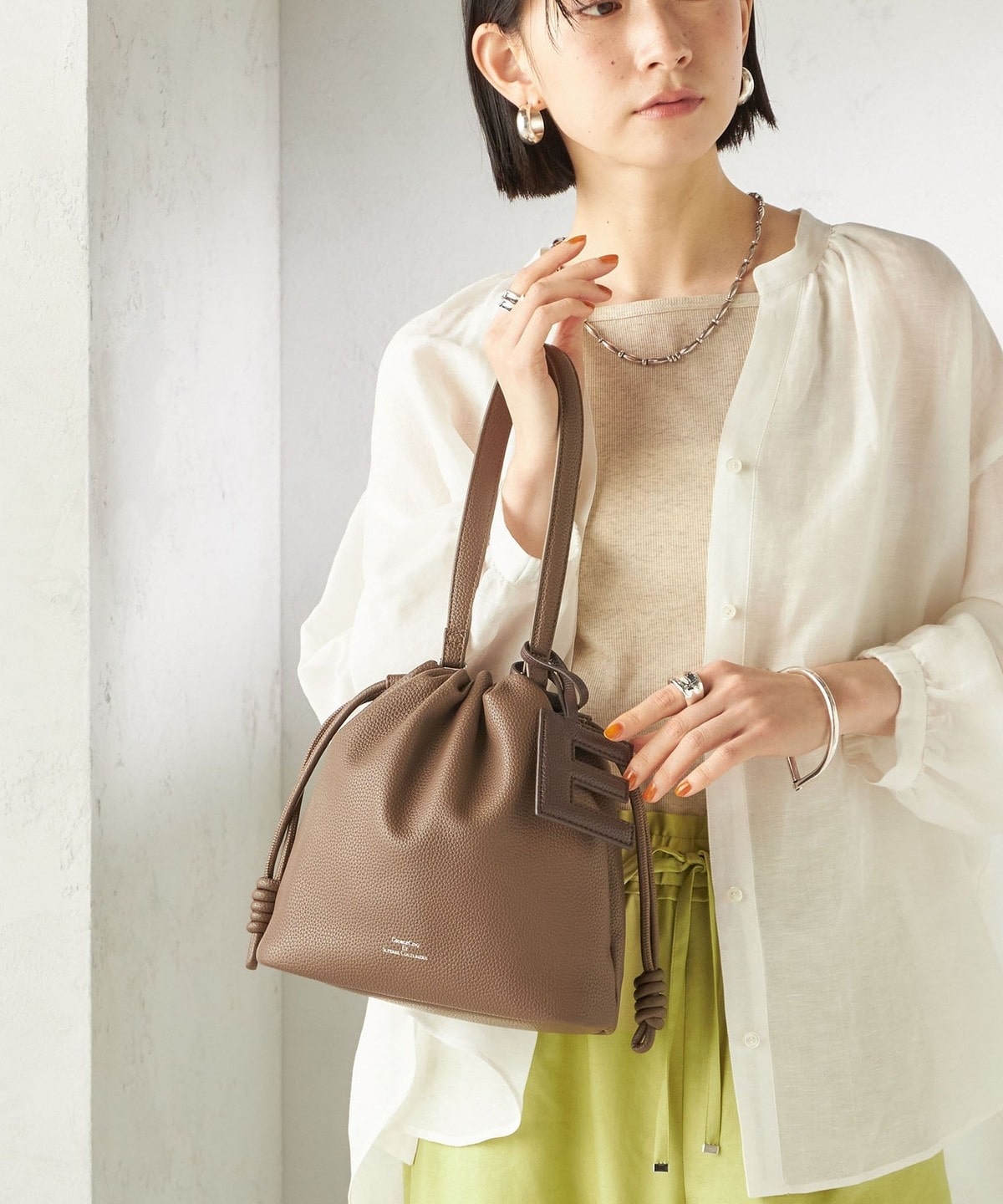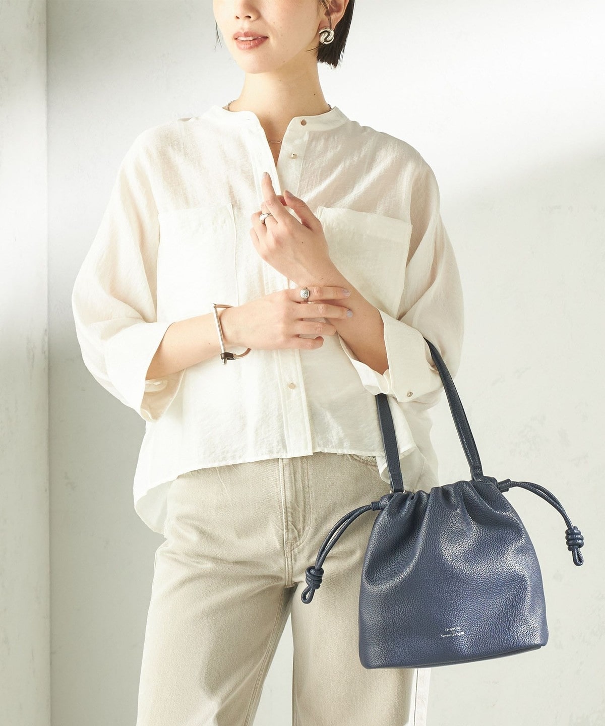 ころんとしたフォルムが大人かわいいシンプルなドローストリング巾着バッグ。