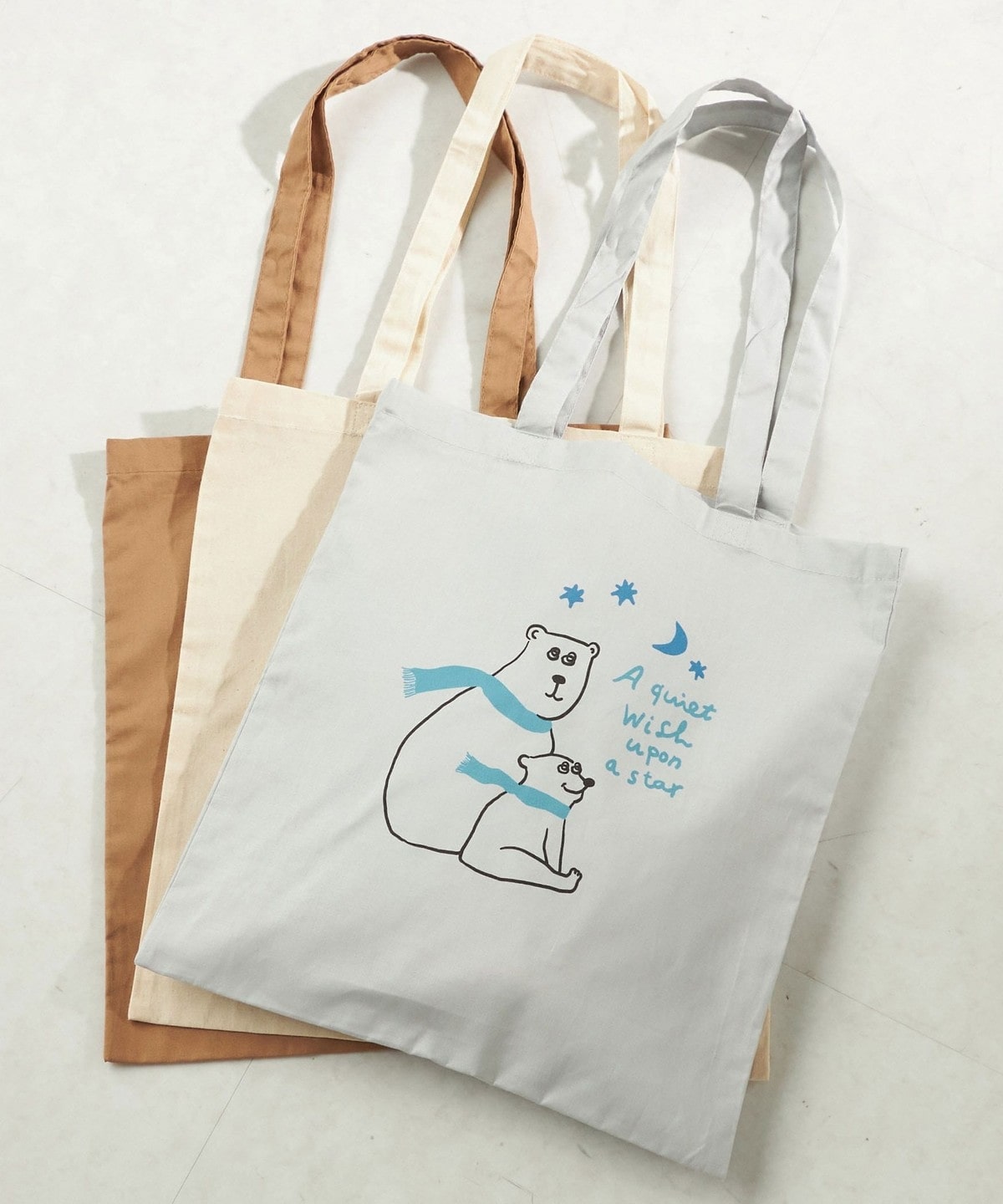トートバックでは「ホームパーティー中のシロクマ」・「家族の時間を過ごす親子クマ」の2種類のシロクマと、ロゴデザインを使用した3種類でご用意しました。