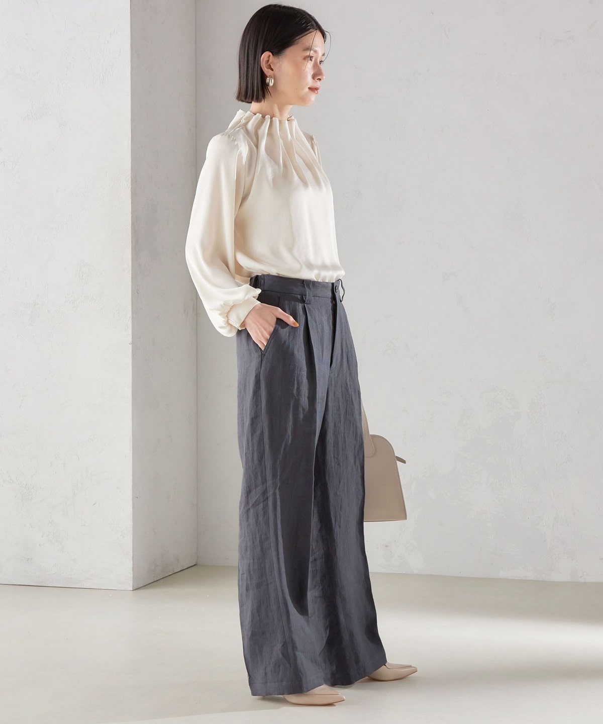 シワになりにくく、手洗い可能なポリエステルで、ふくらみのあるエアリーな風合いが特徴の素材です。