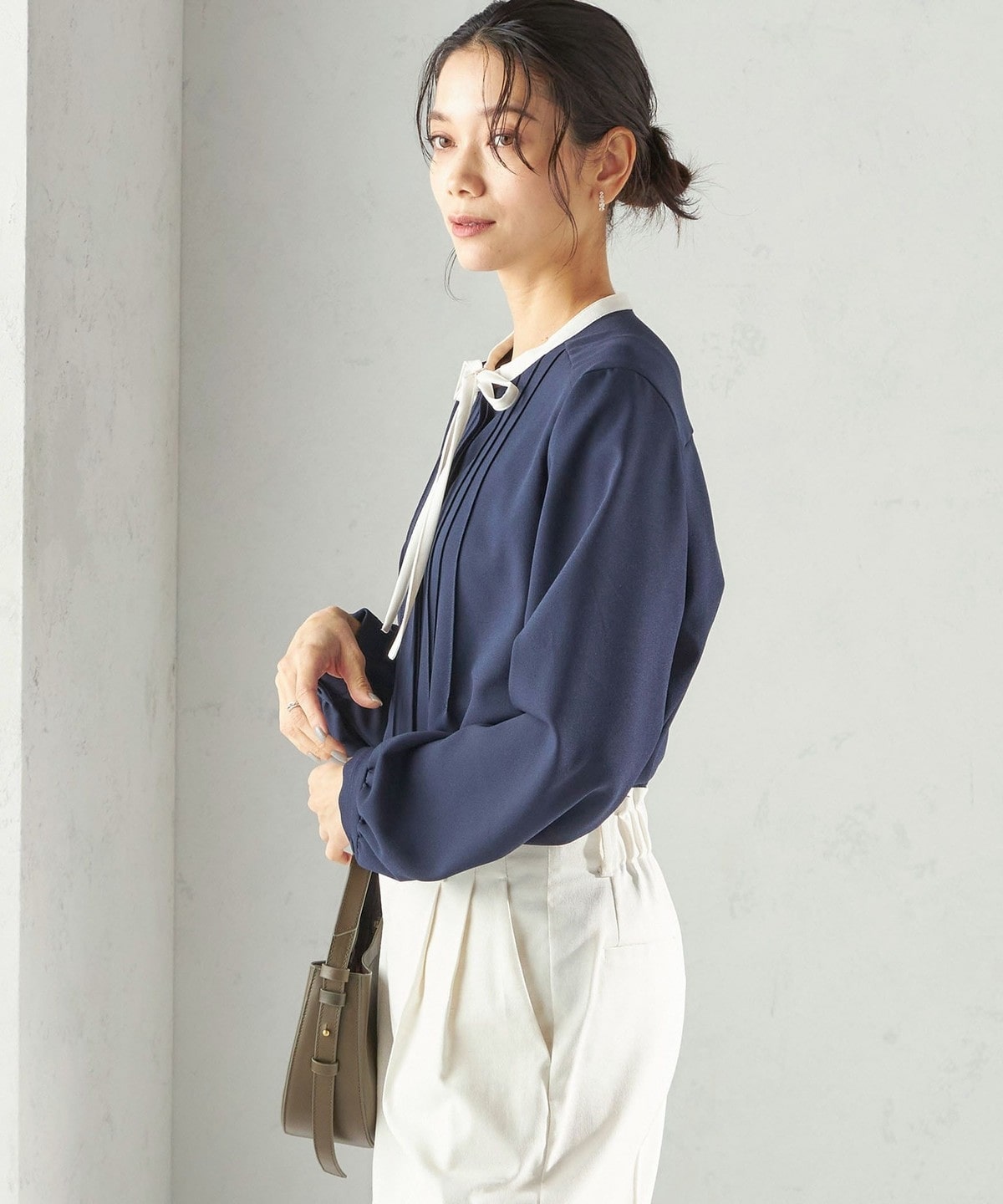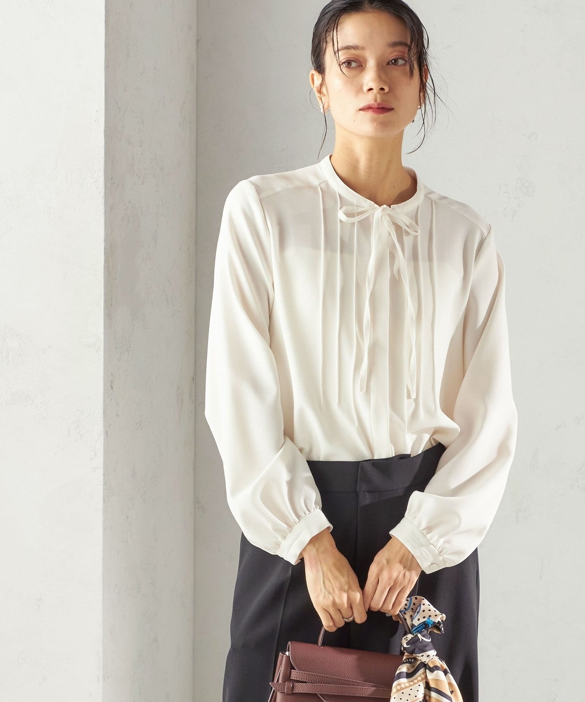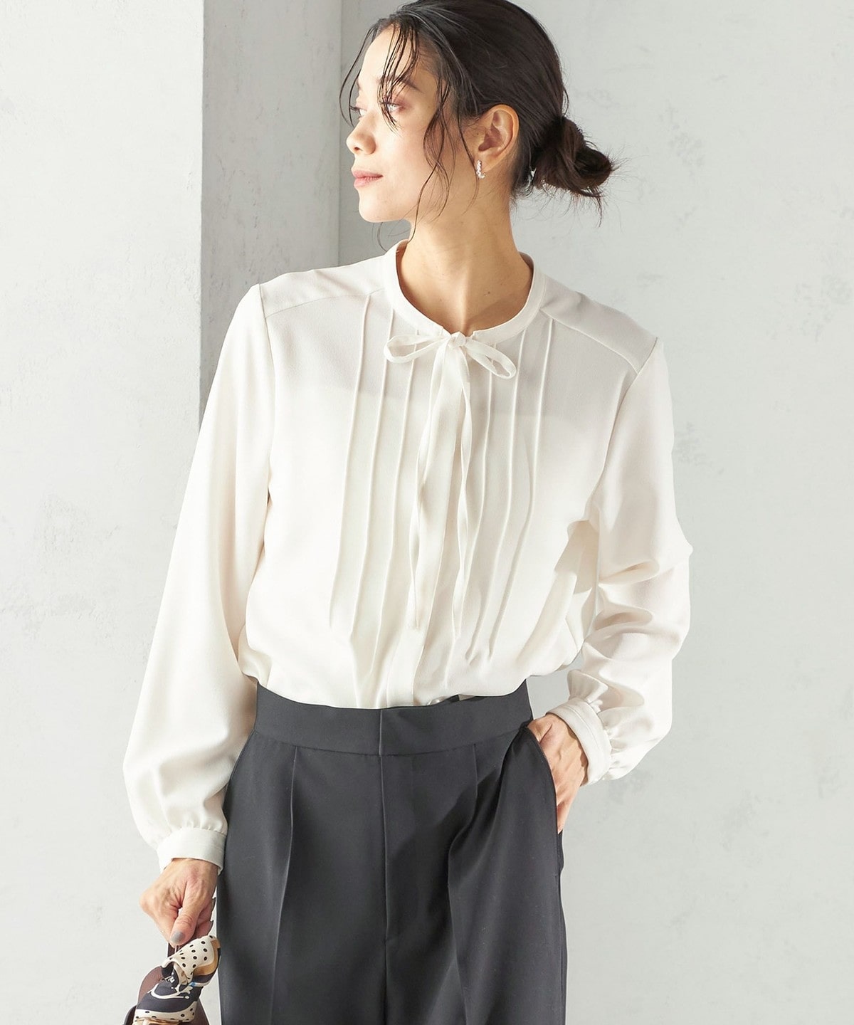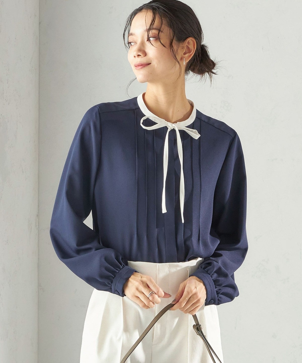 フロントに繊細なピンタックと細めのリボンタイをあしらったブラウスです。