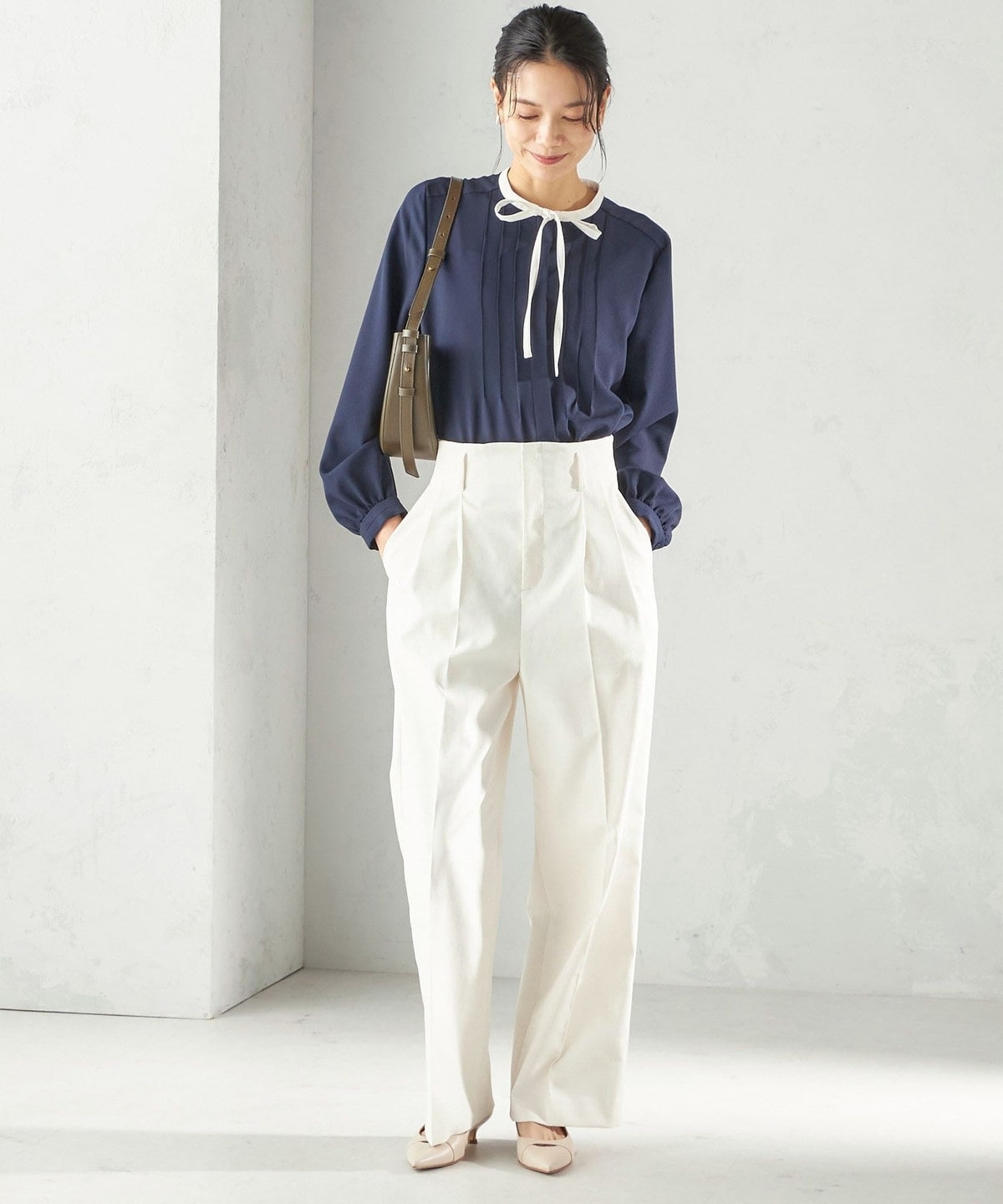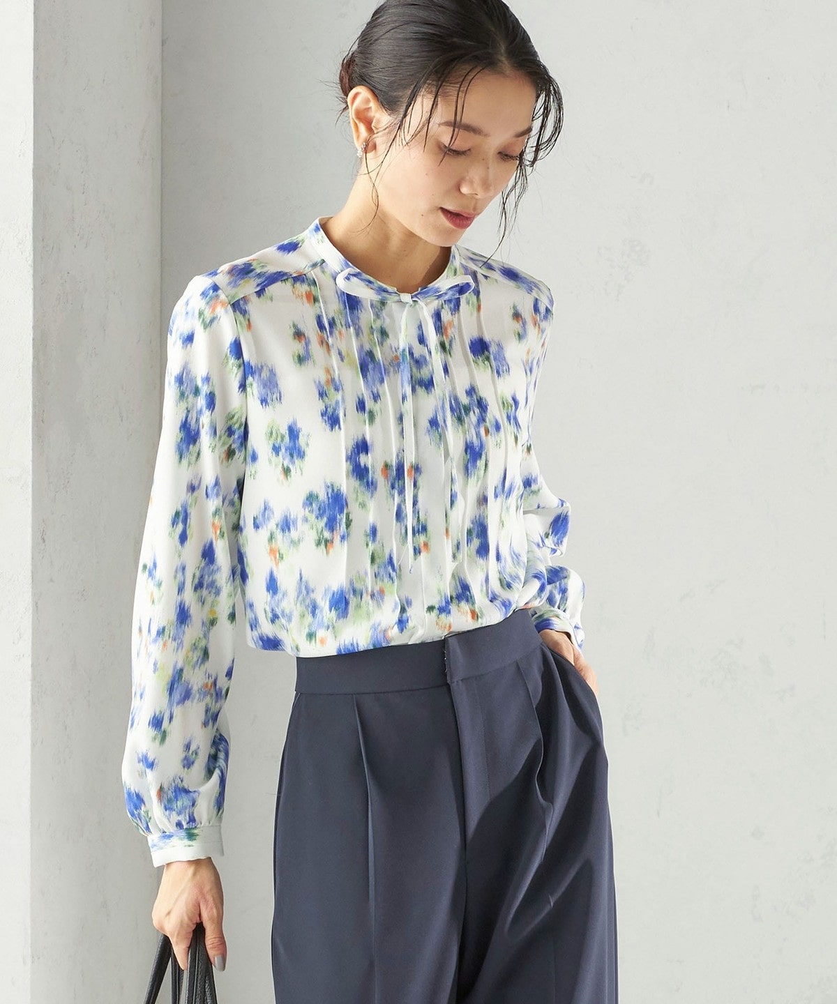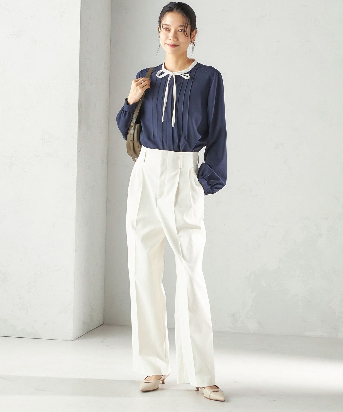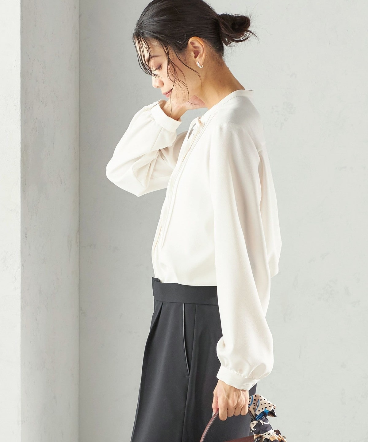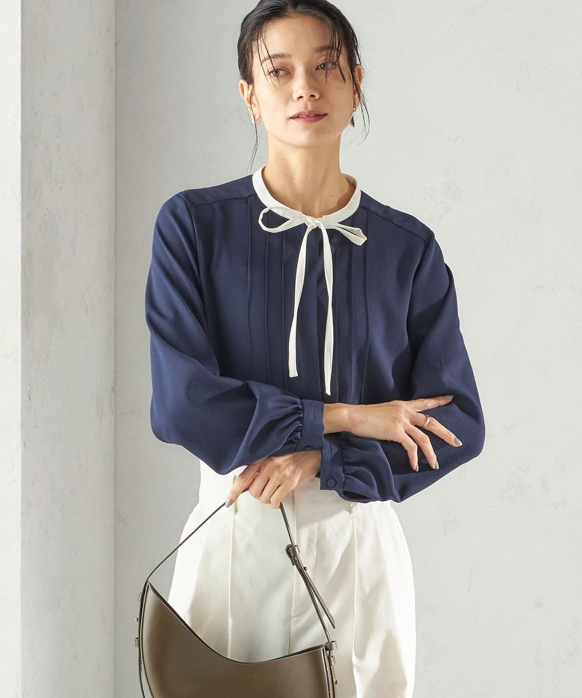 フロントに繊細なピンタックと細めのリボンタイをあしらったブラウスです。