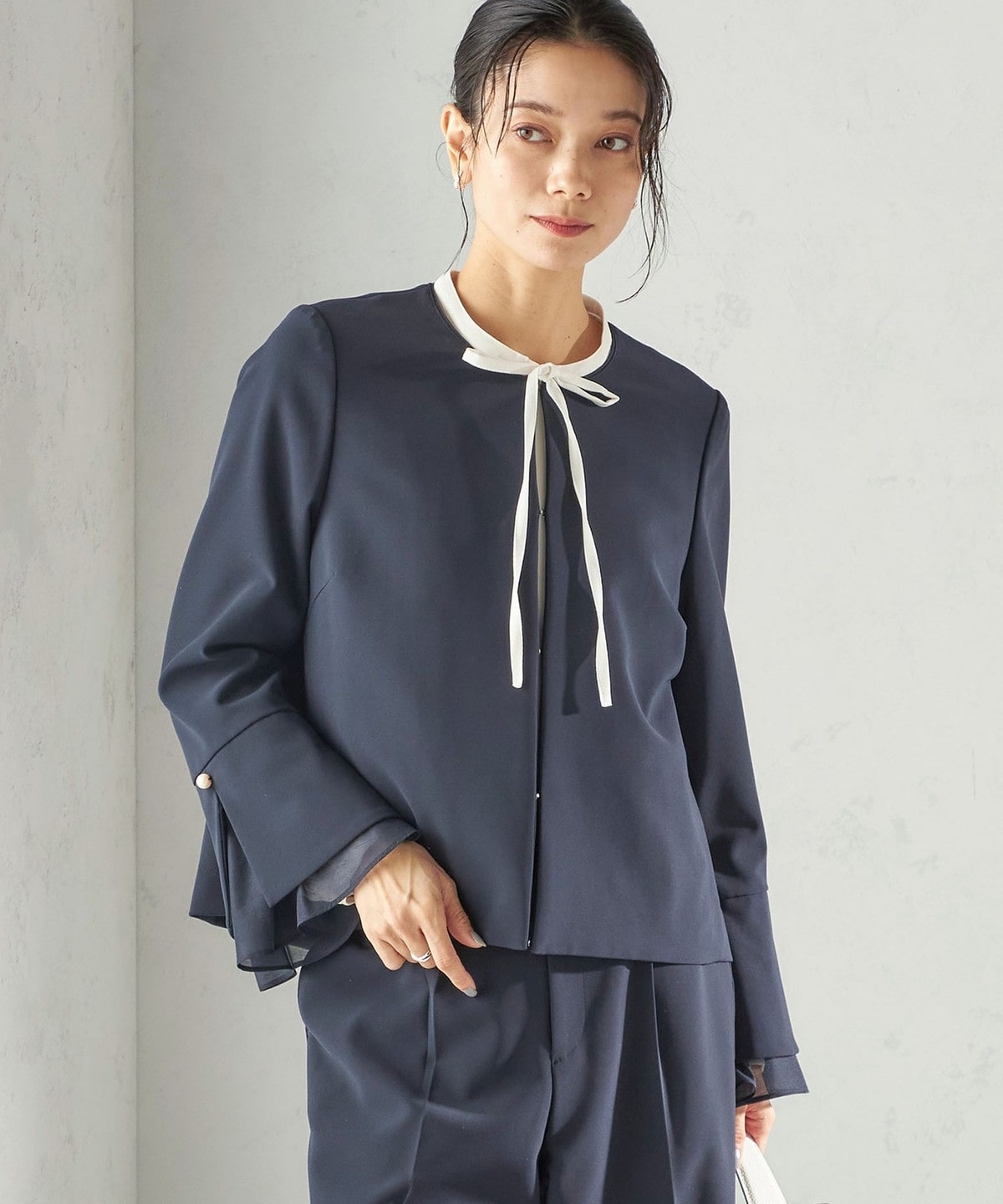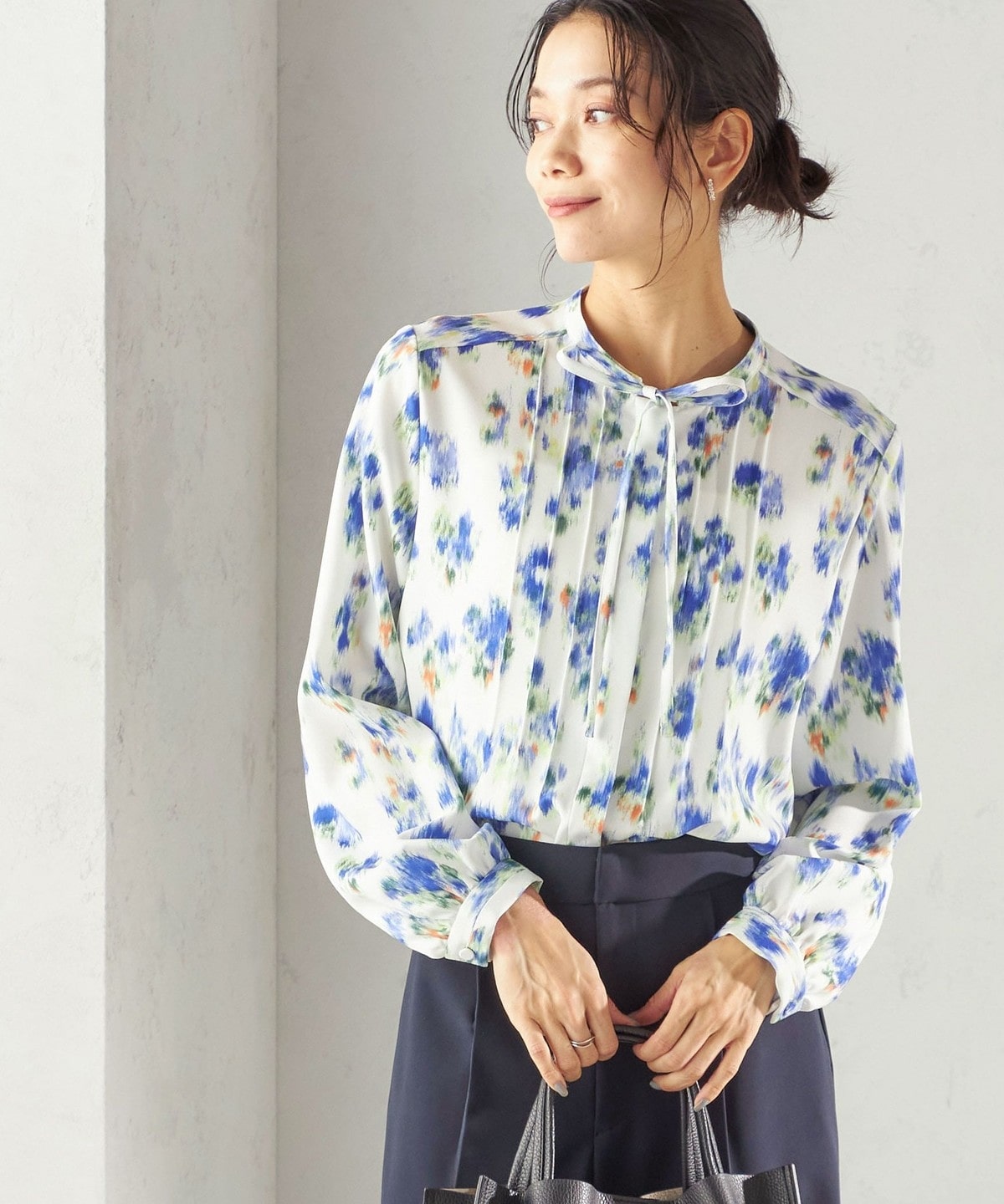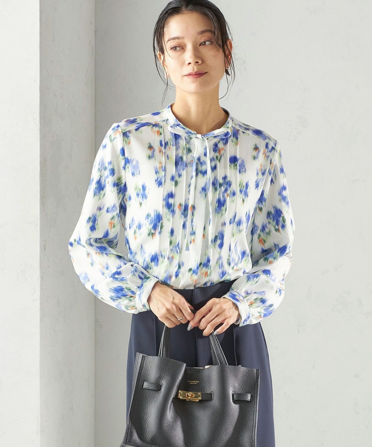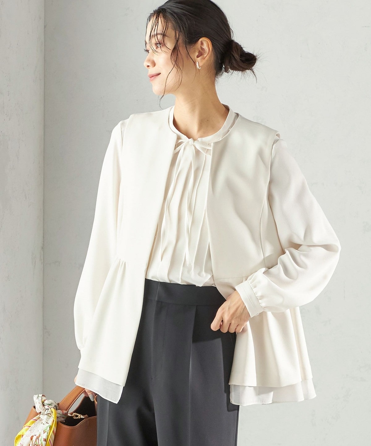 フロントに繊細なピンタックと細めのリボンタイをあしらったブラウスです。
