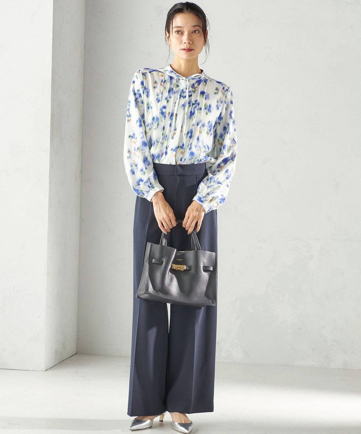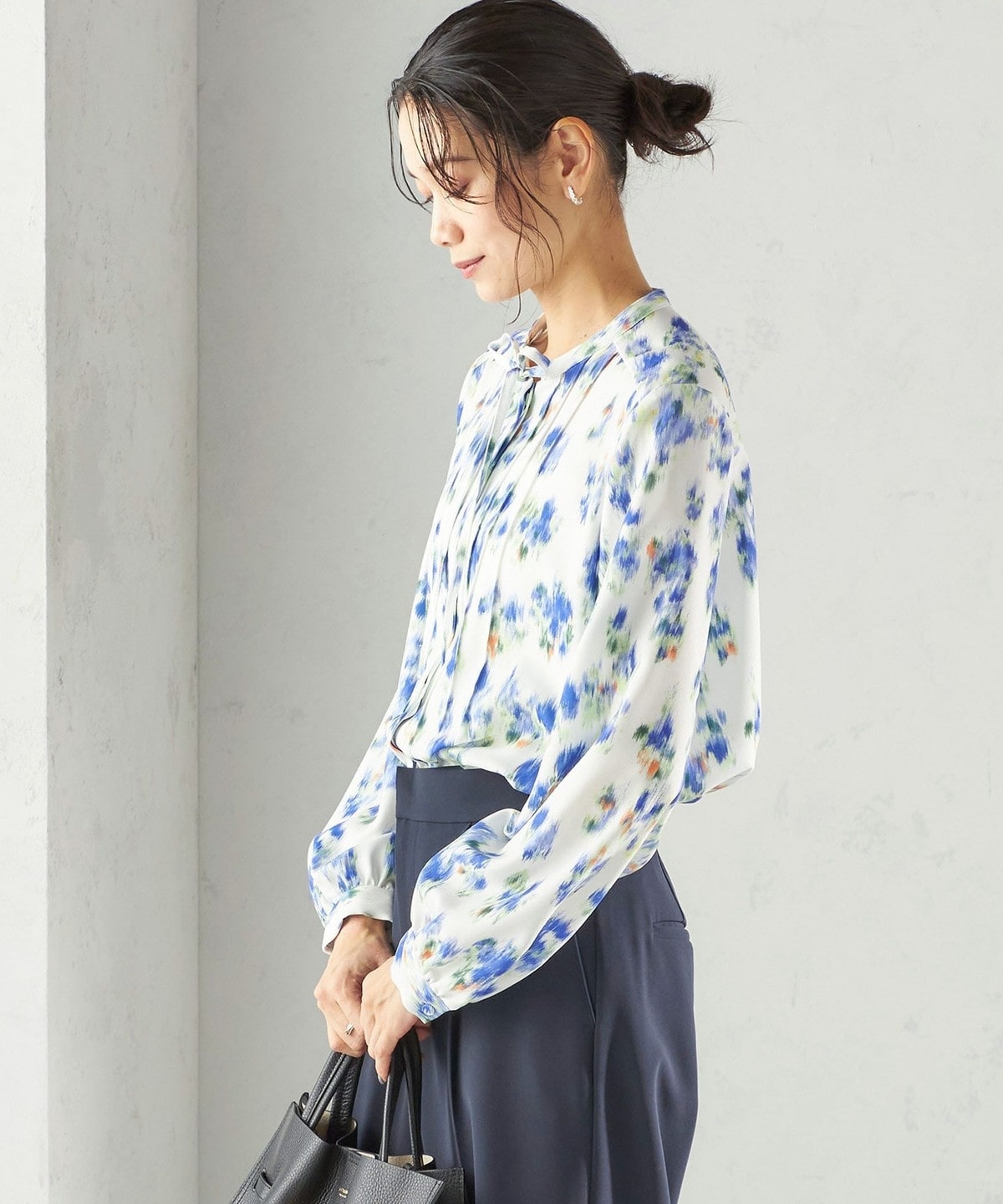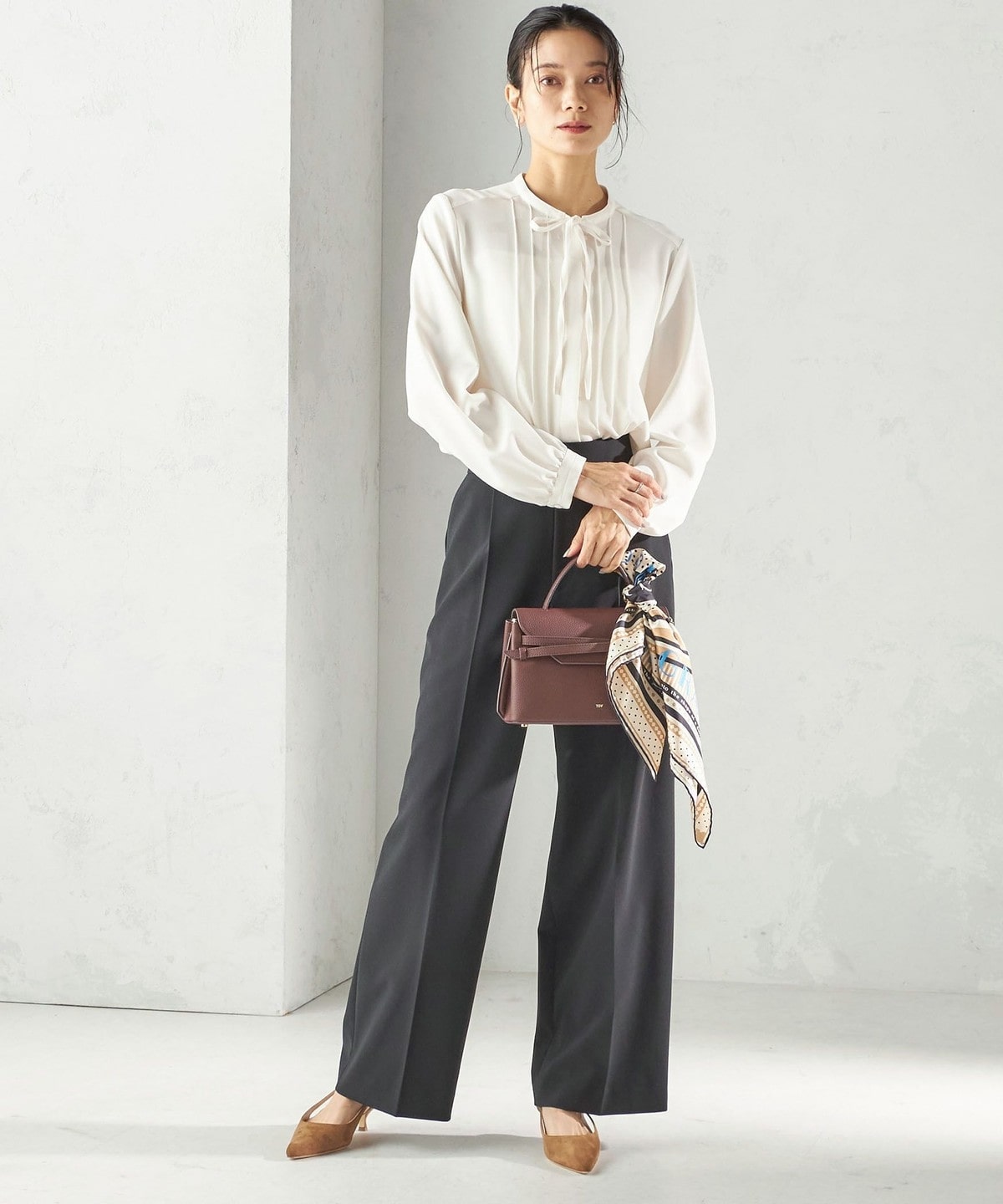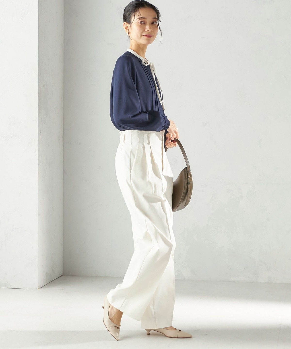 フロントに繊細なピンタックと細めのリボンタイをあしらったブラウスです。