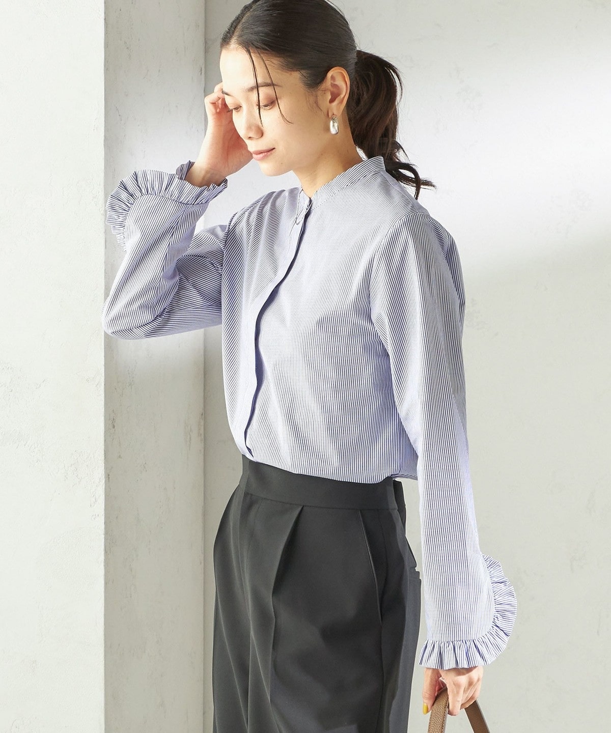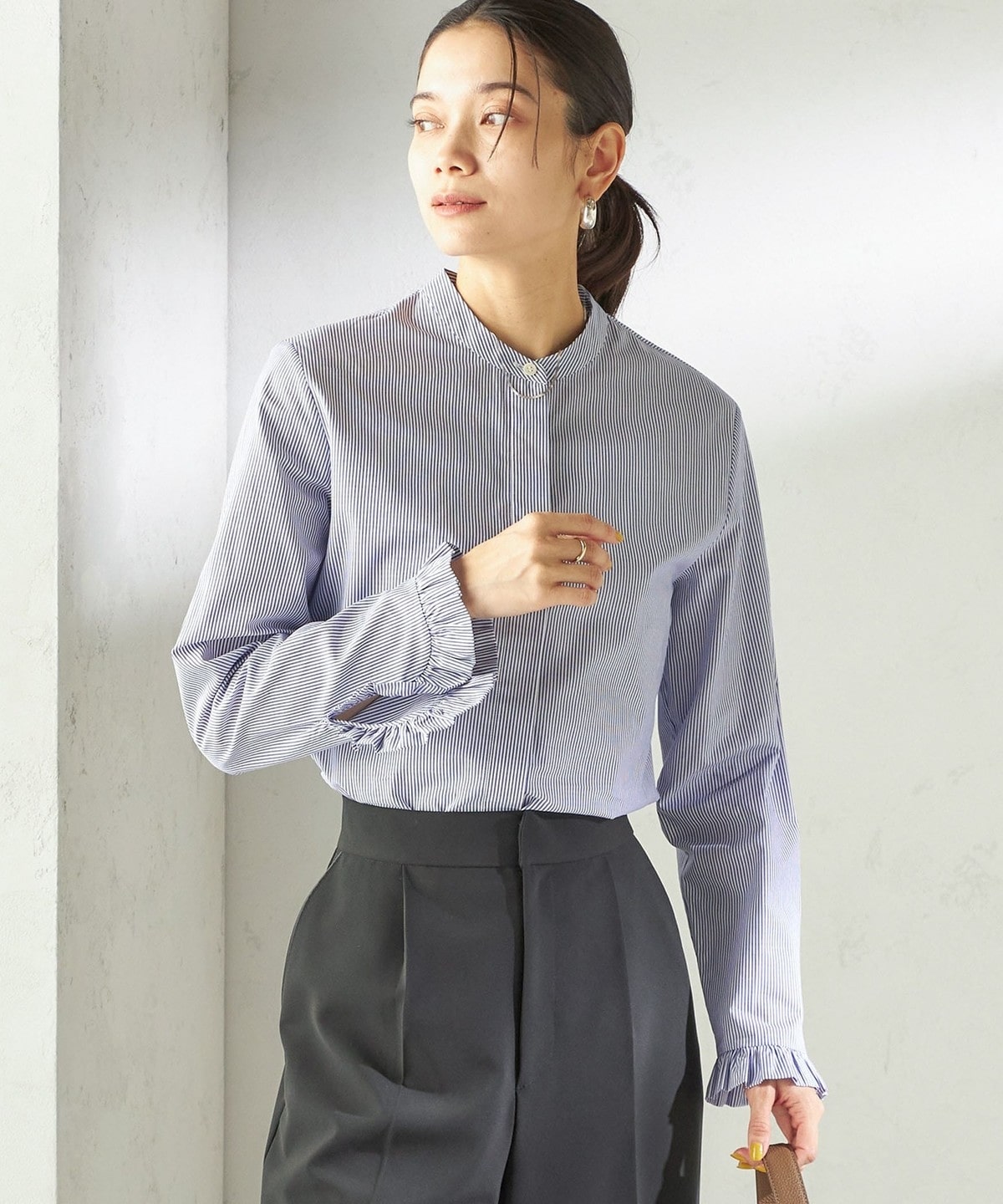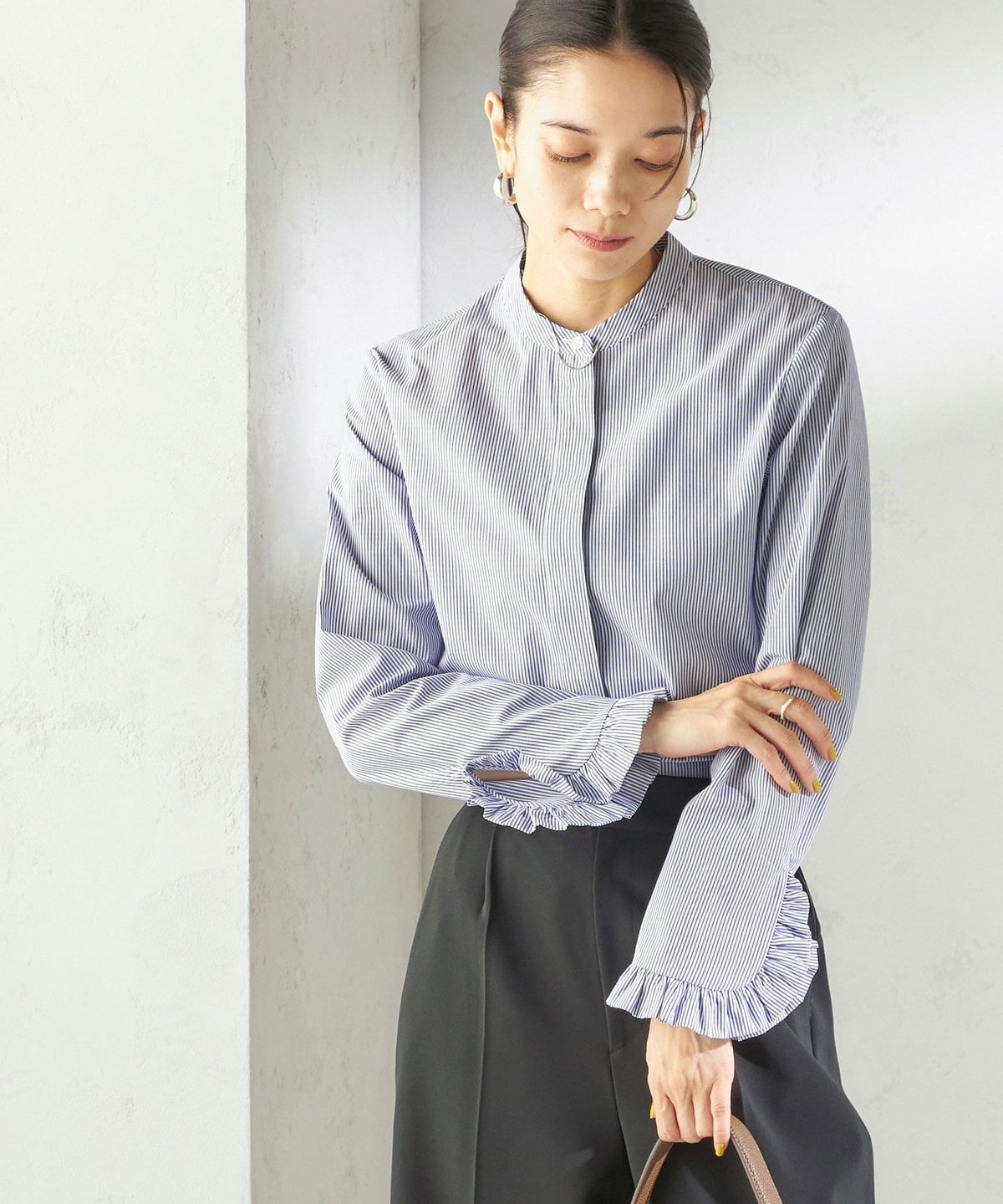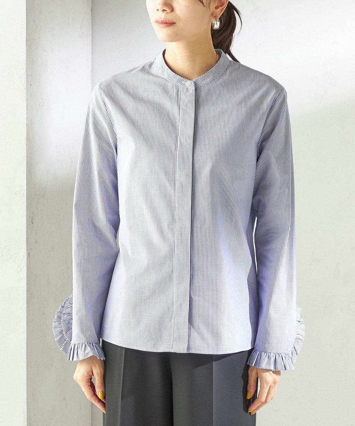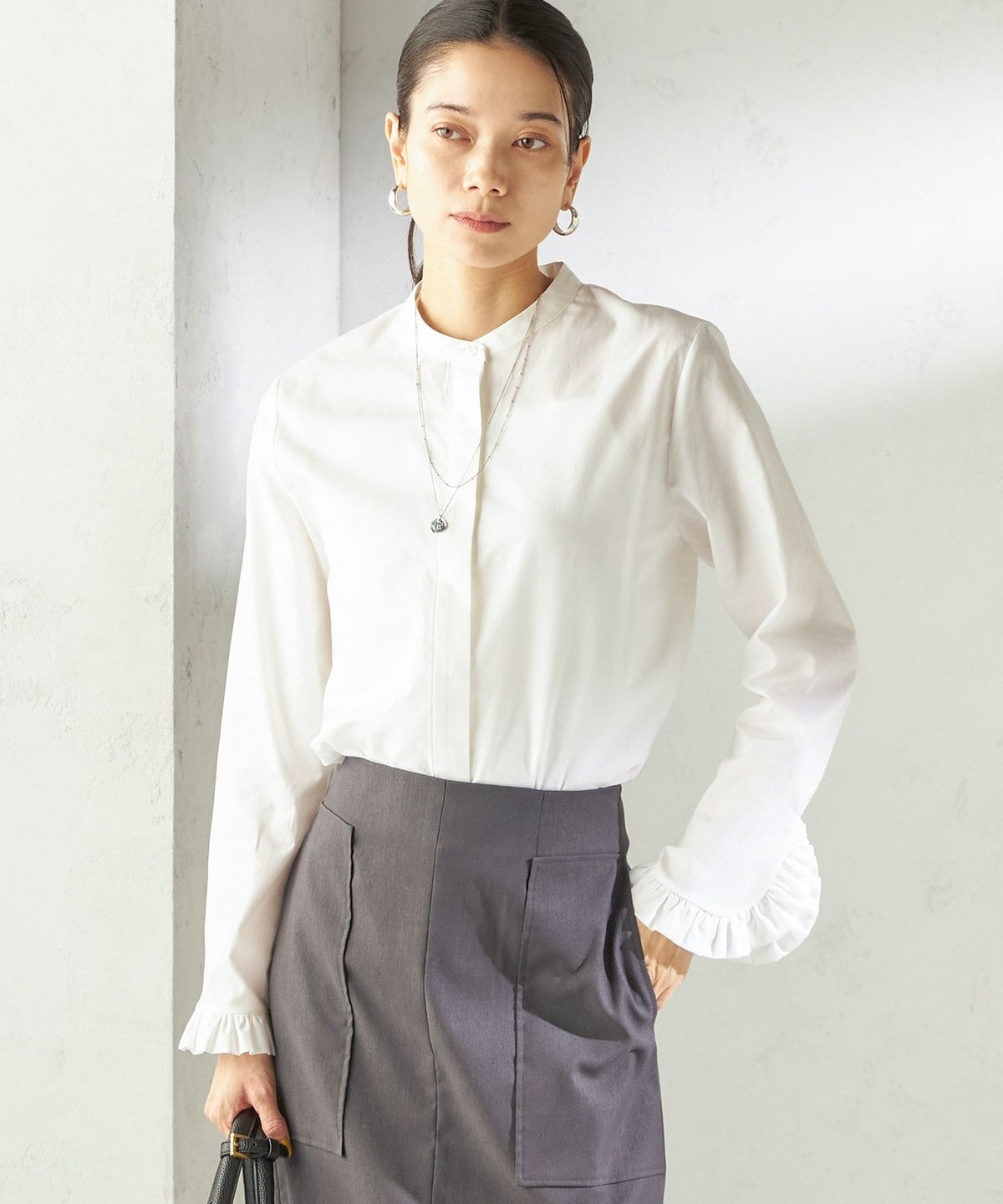 すっきりシルエットと袖のフリルが上品かわいいバンドカラーシャツ