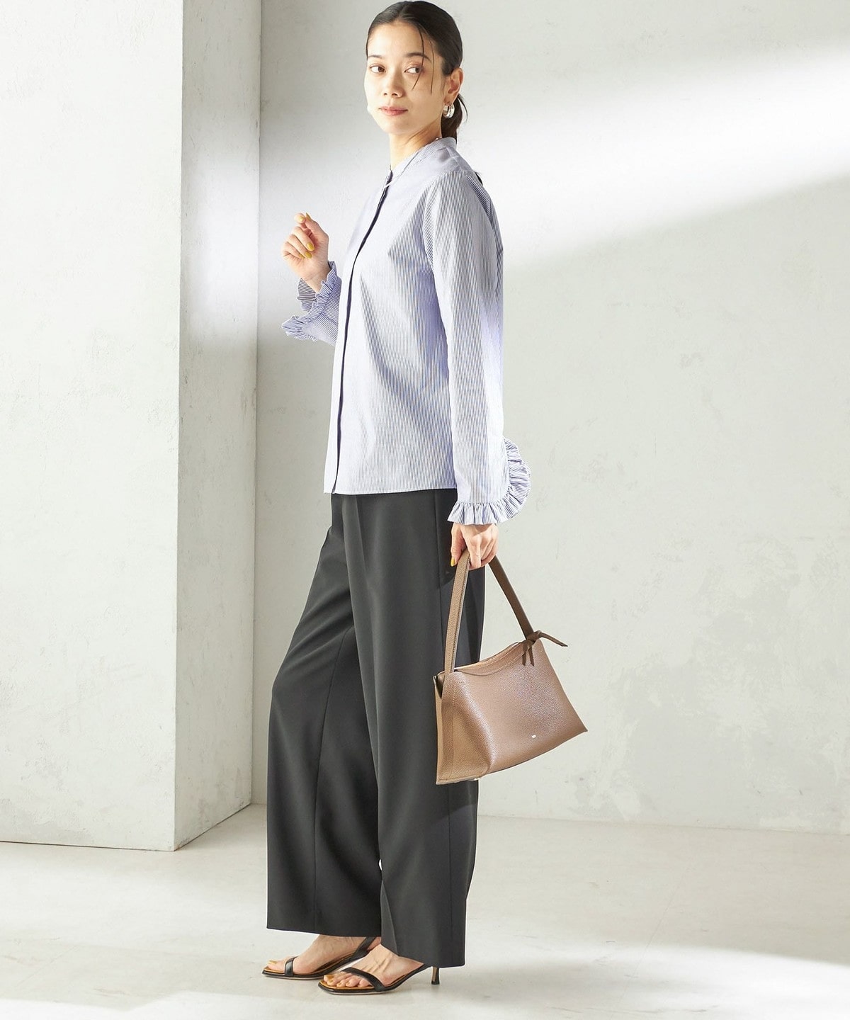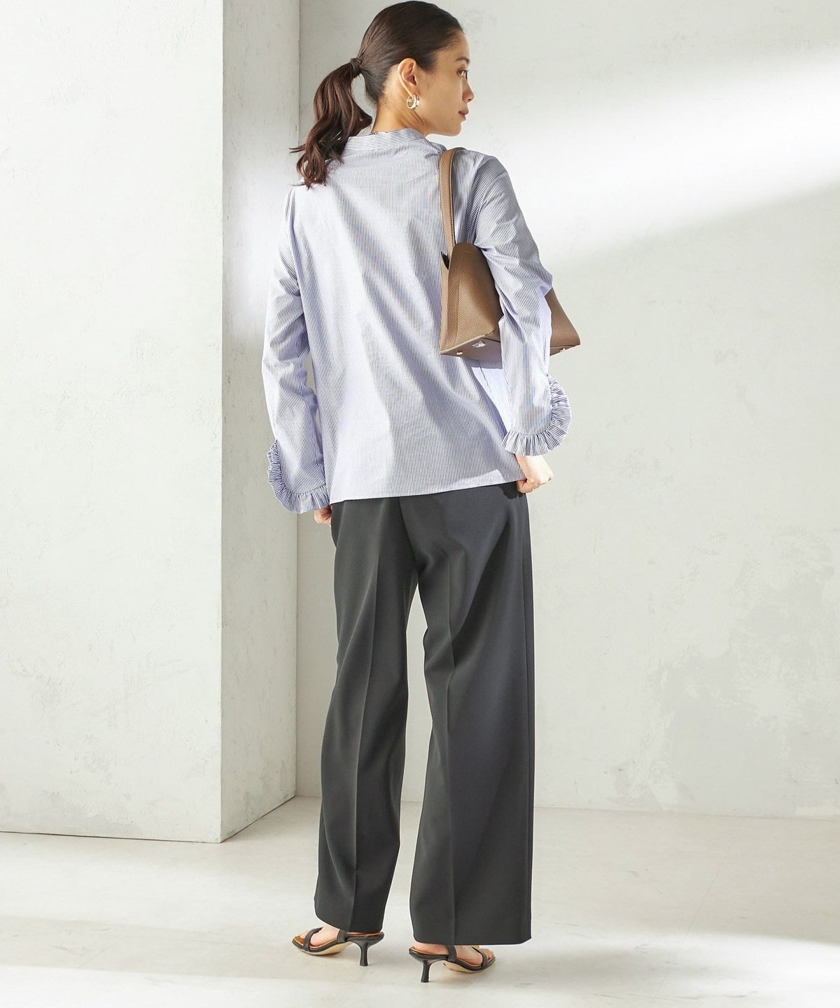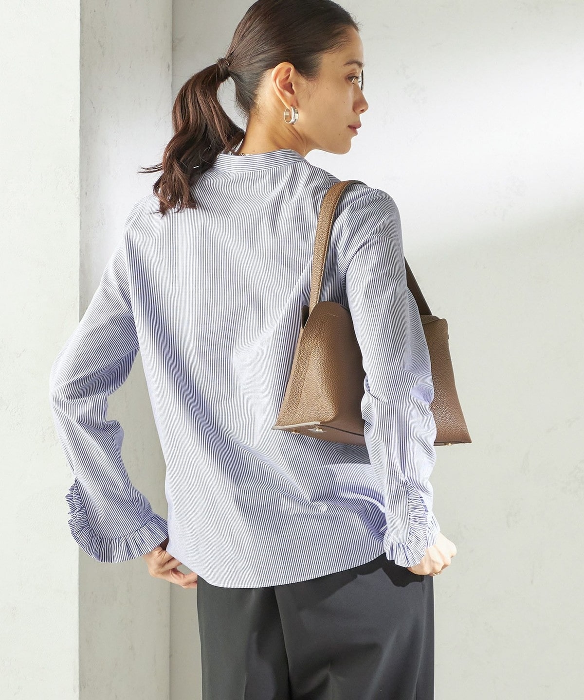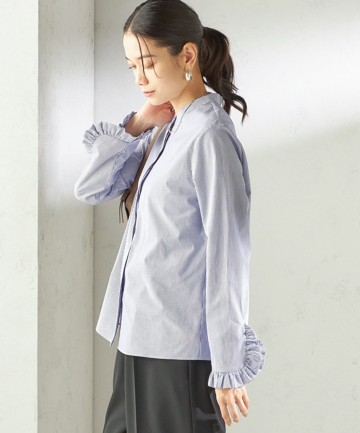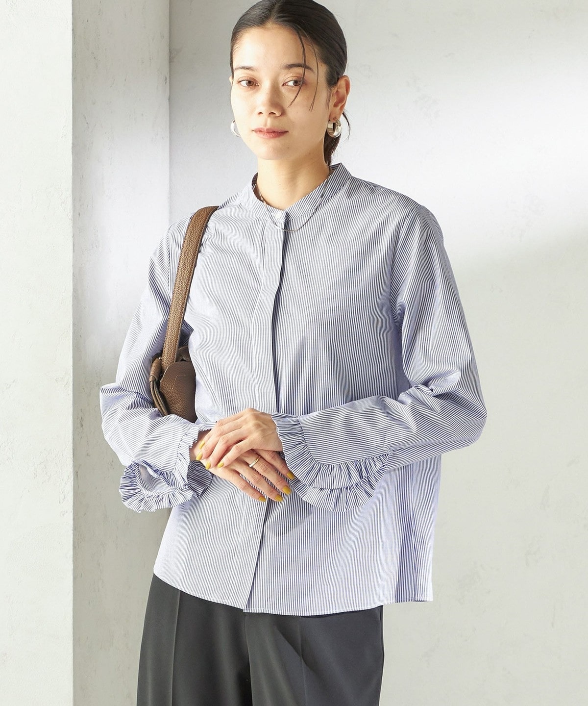 すっきりシルエットと袖のフリルが上品かわいいバンドカラーシャツ