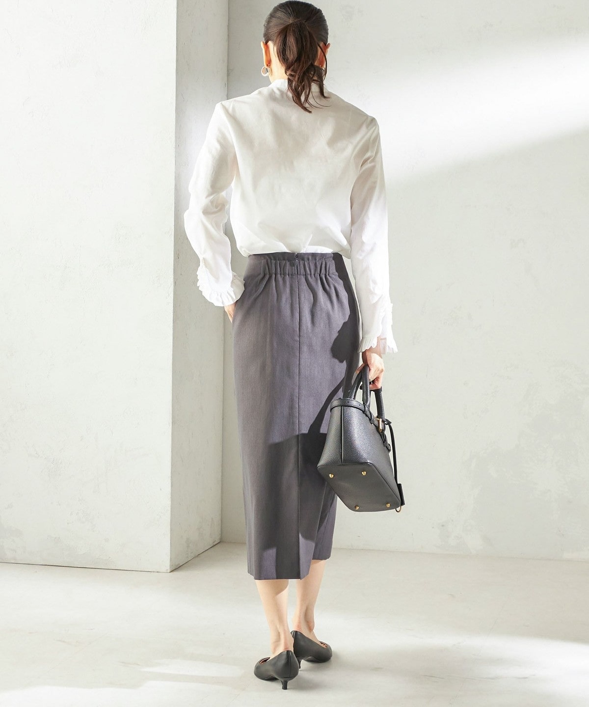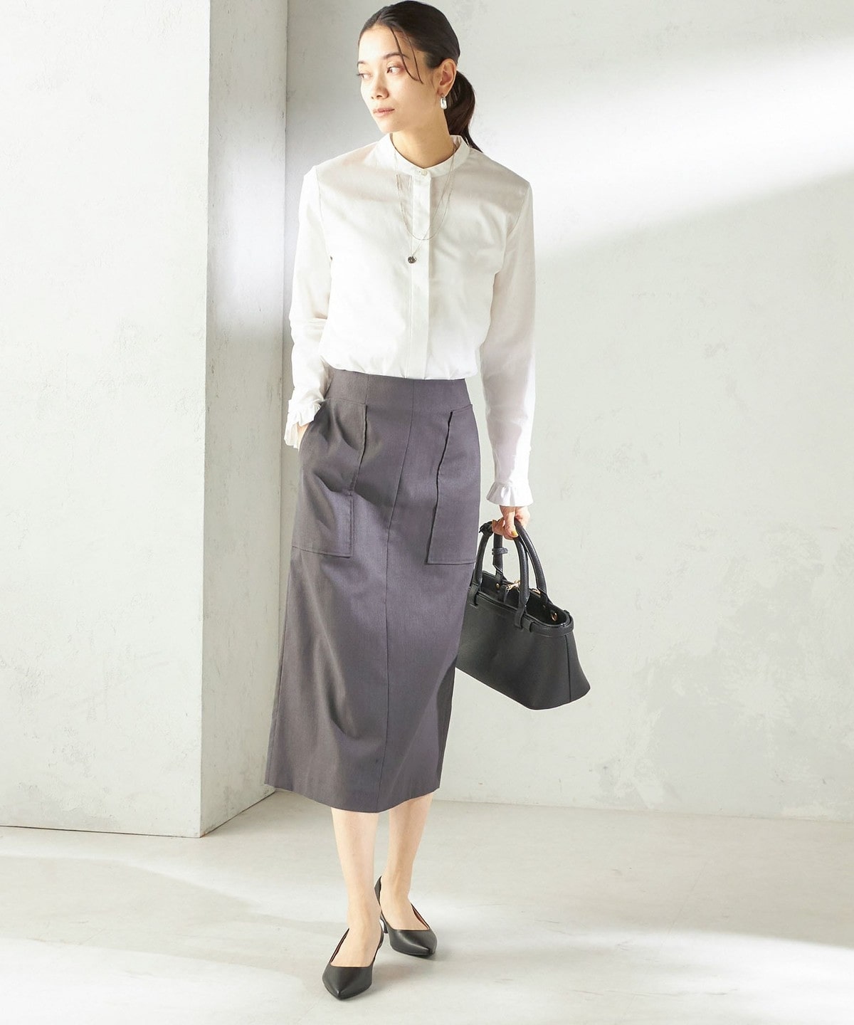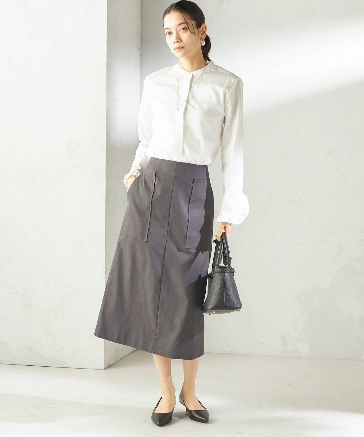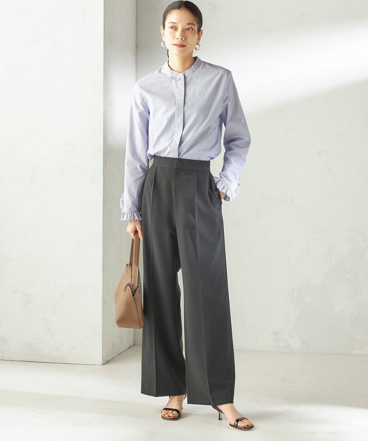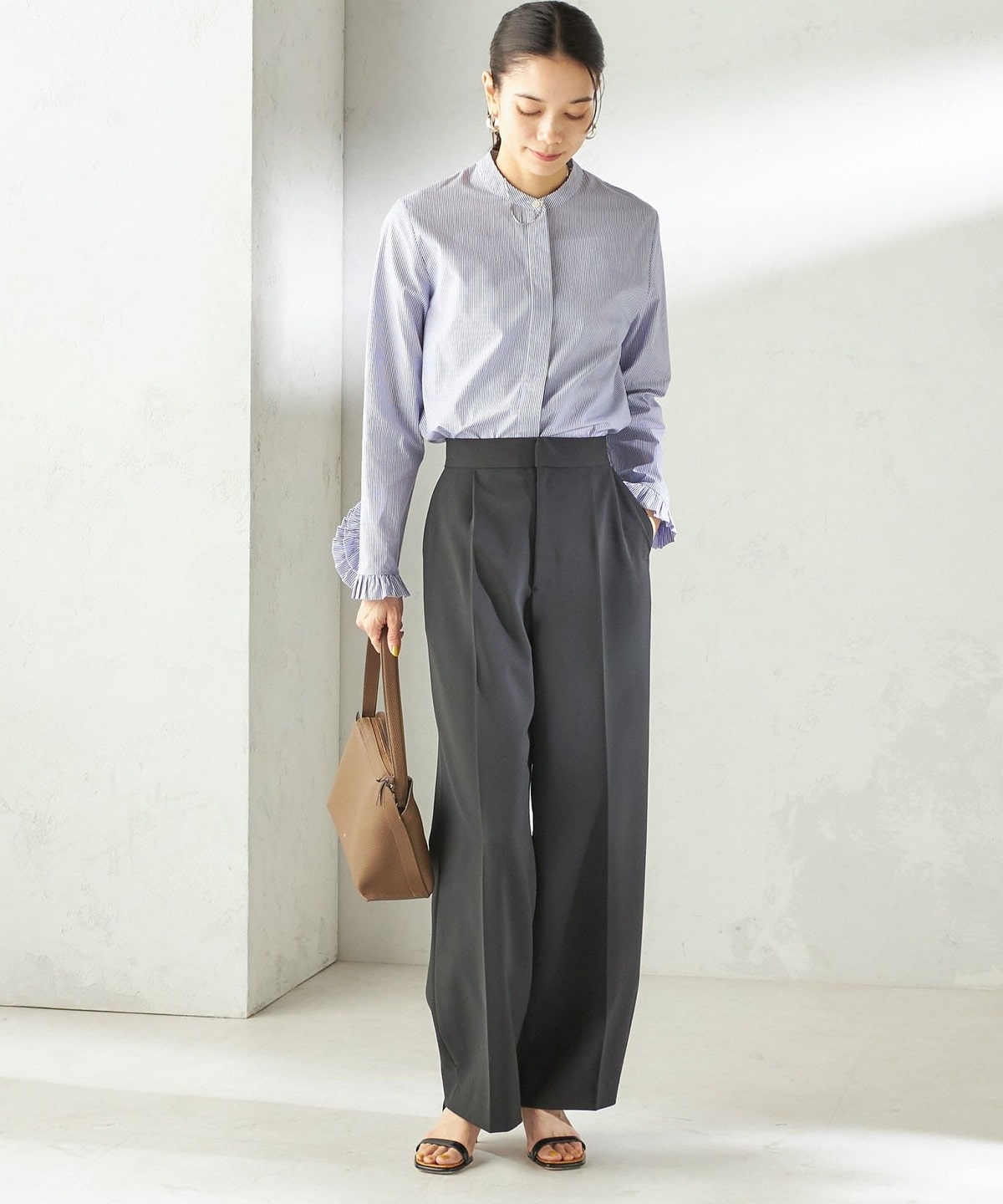 すっきりシルエットと袖のフリルが上品かわいいバンドカラーシャツ