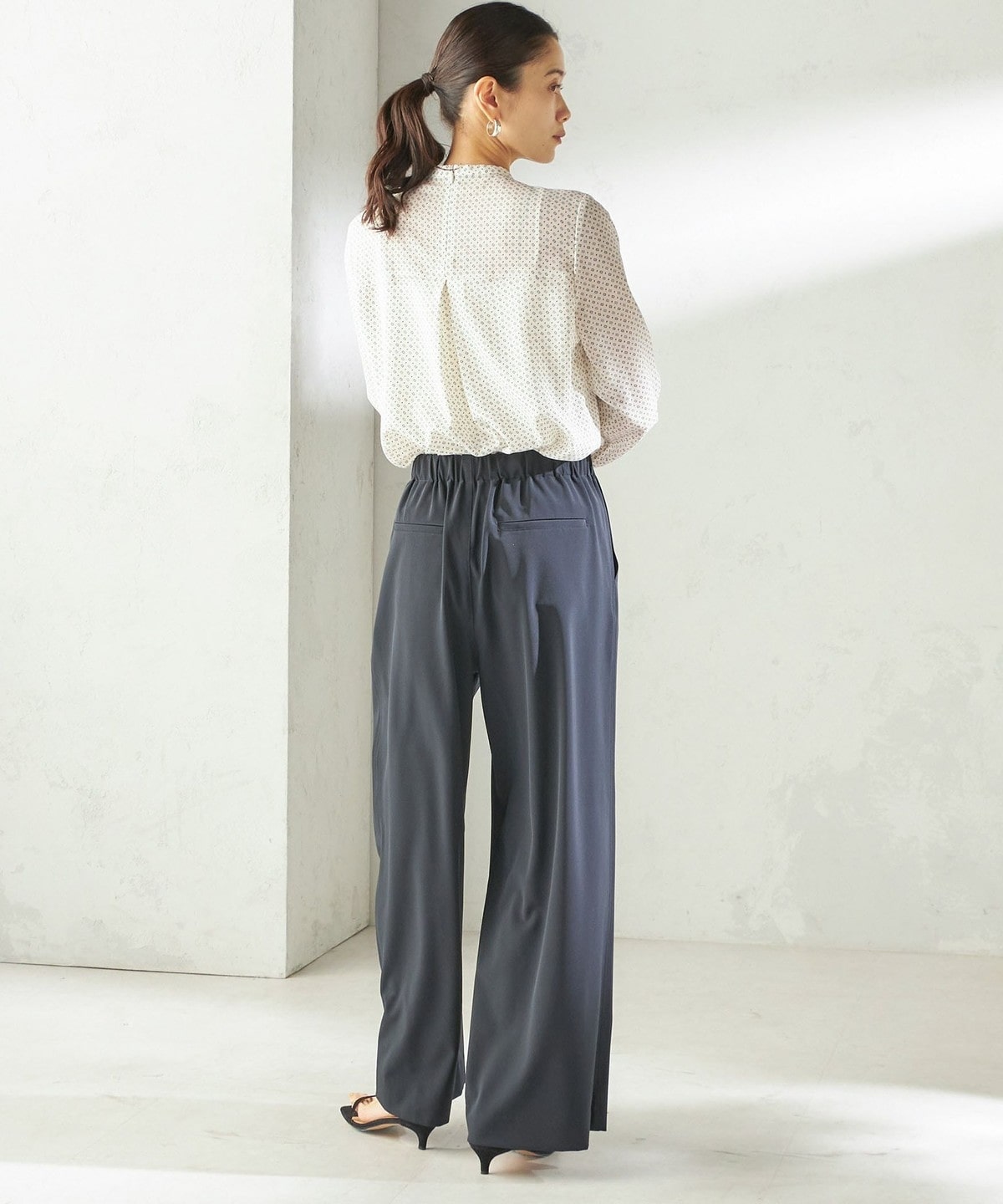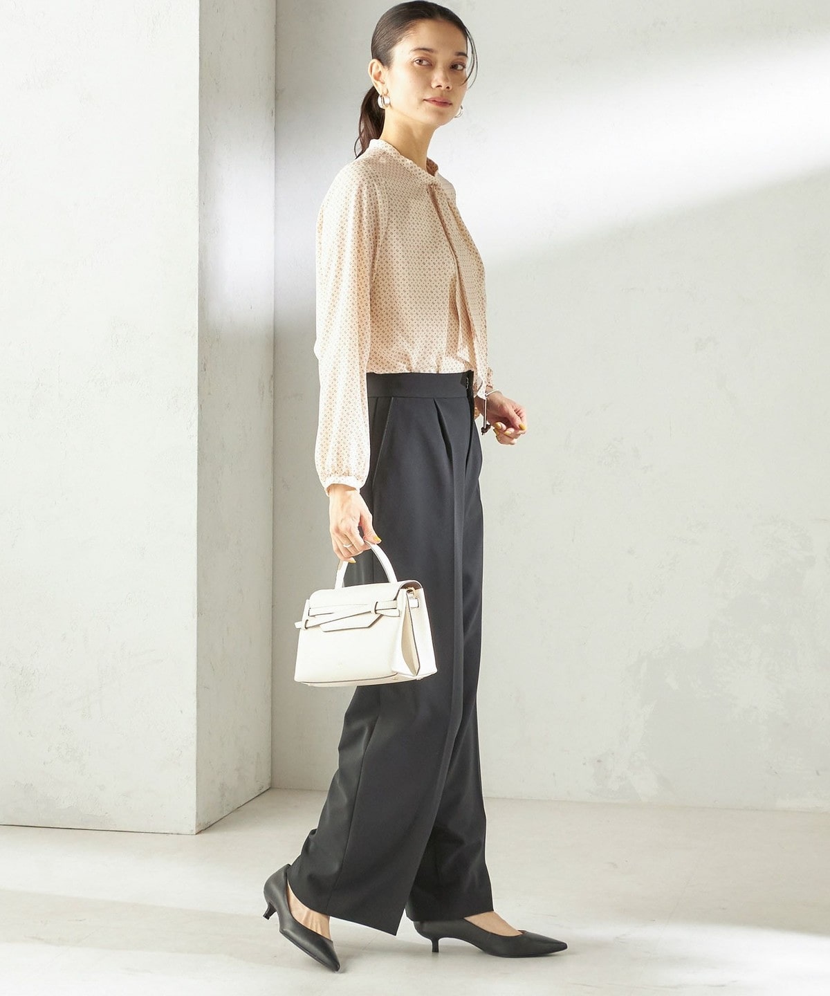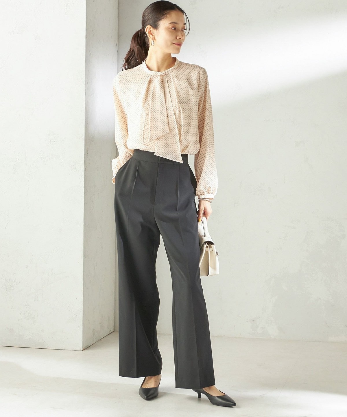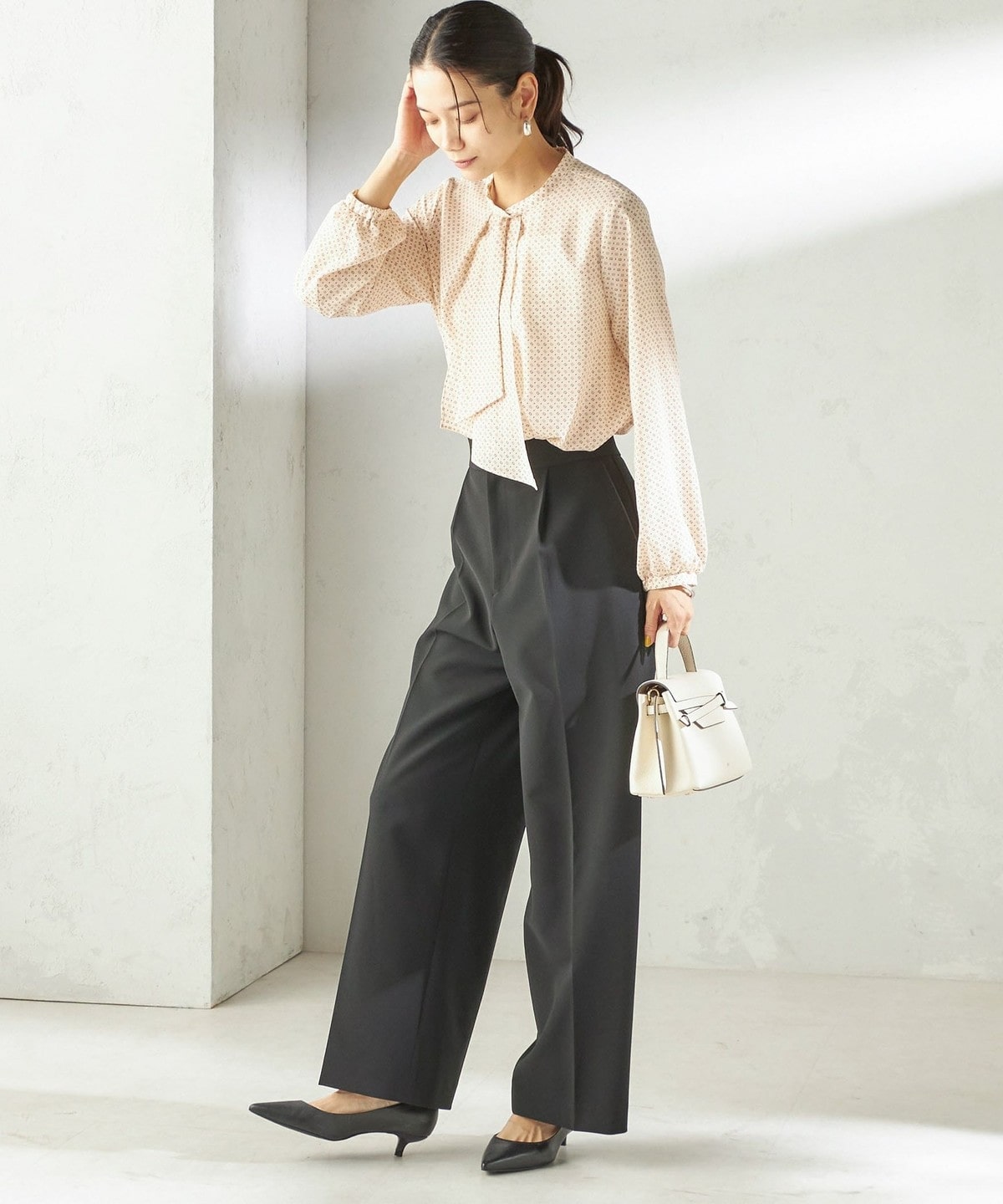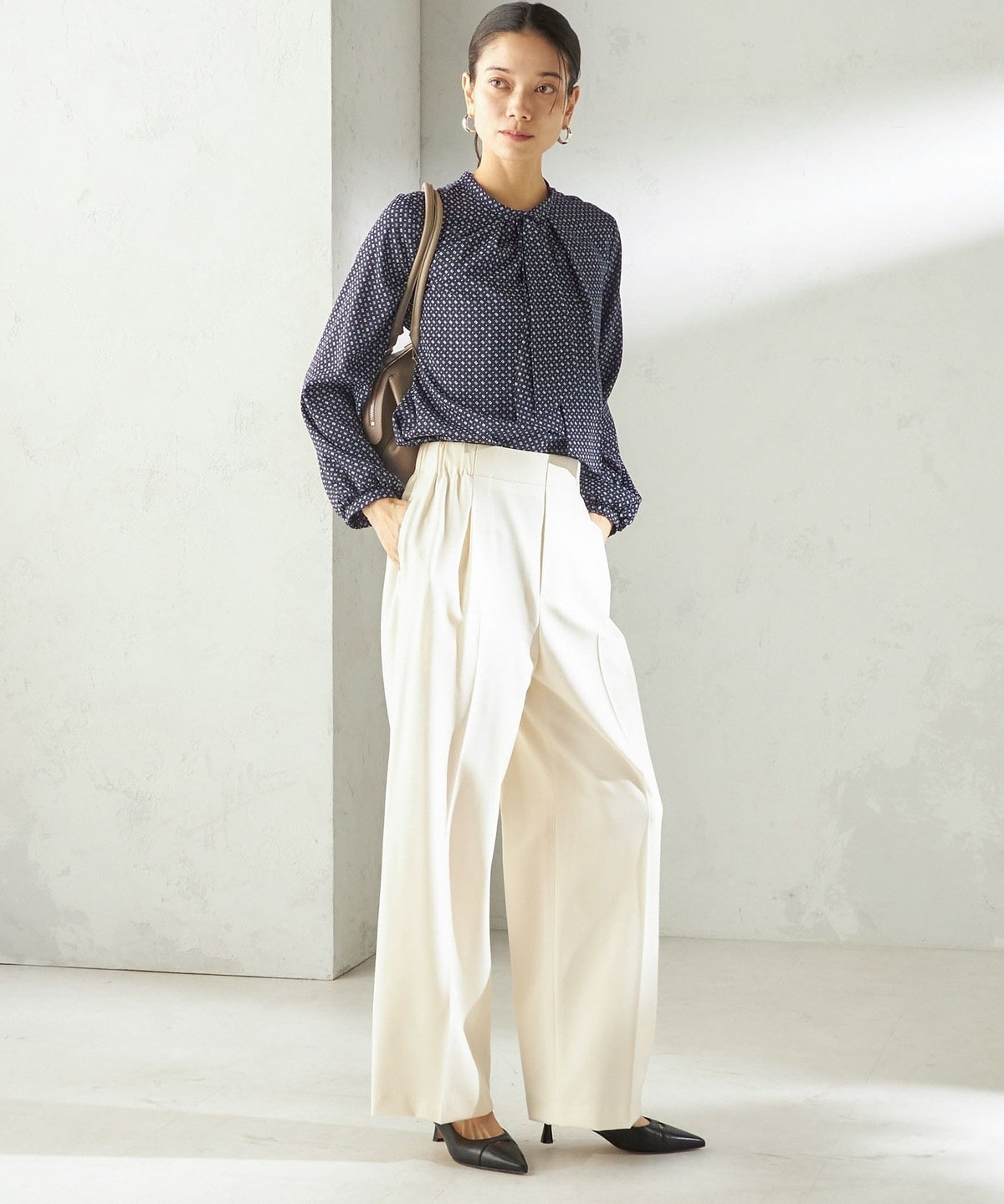 シンプルなスタイリングに花を添えてくれる着映えブラウス。