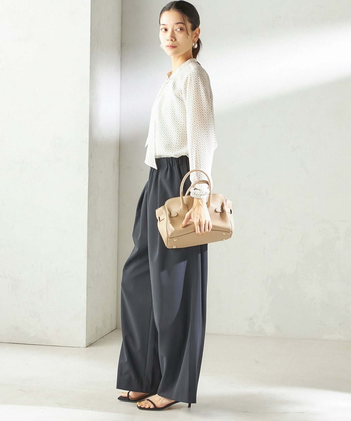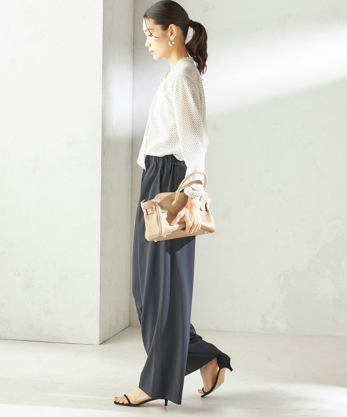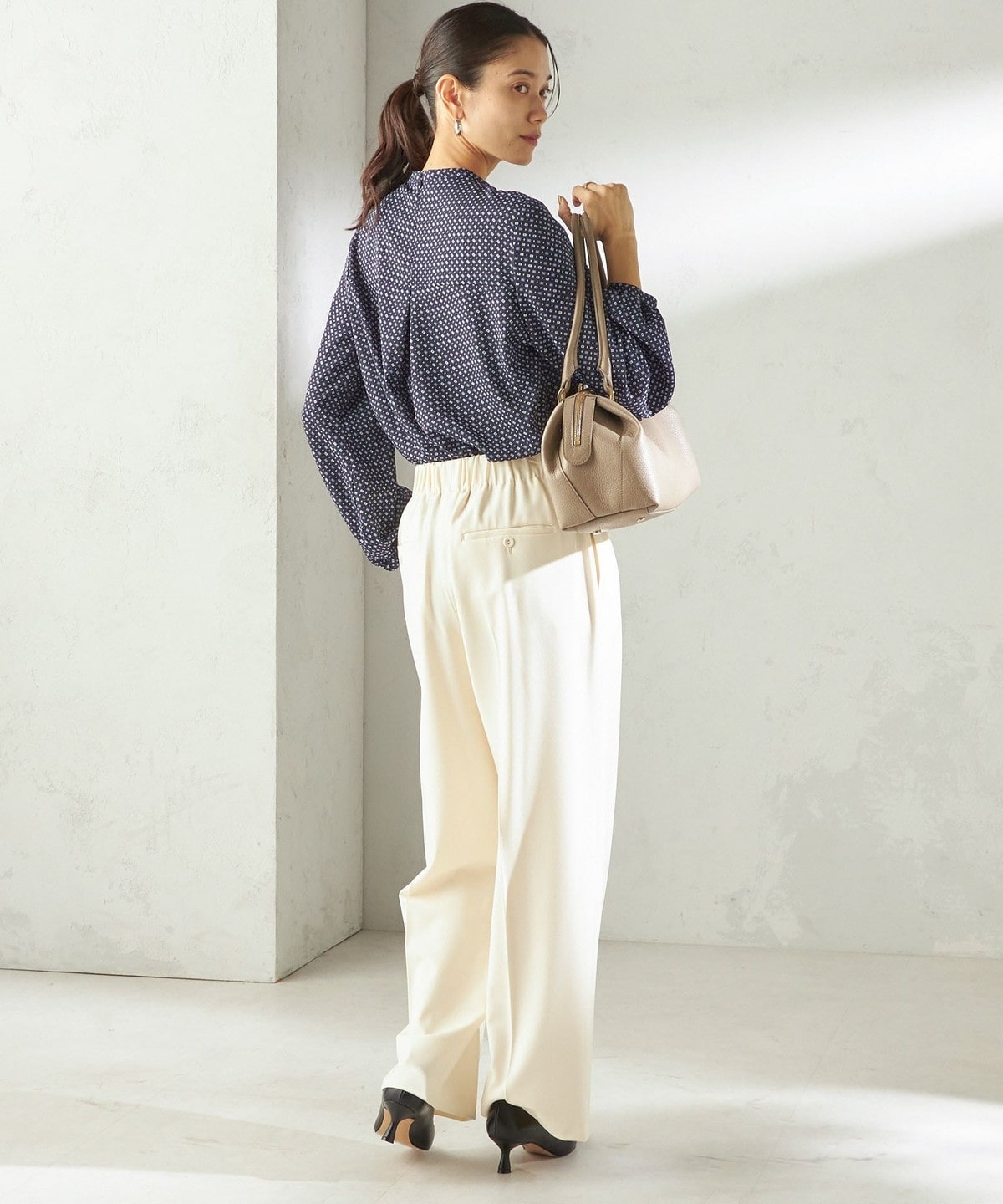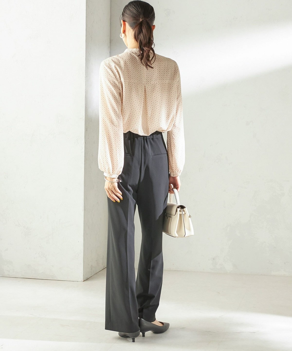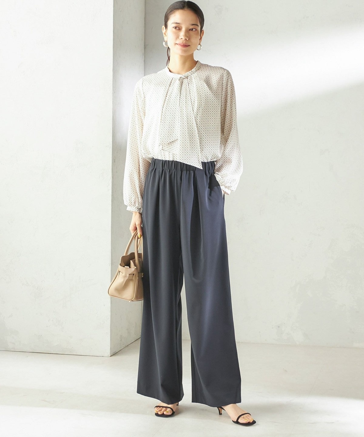 シンプルなスタイリングに花を添えてくれる着映えブラウス。