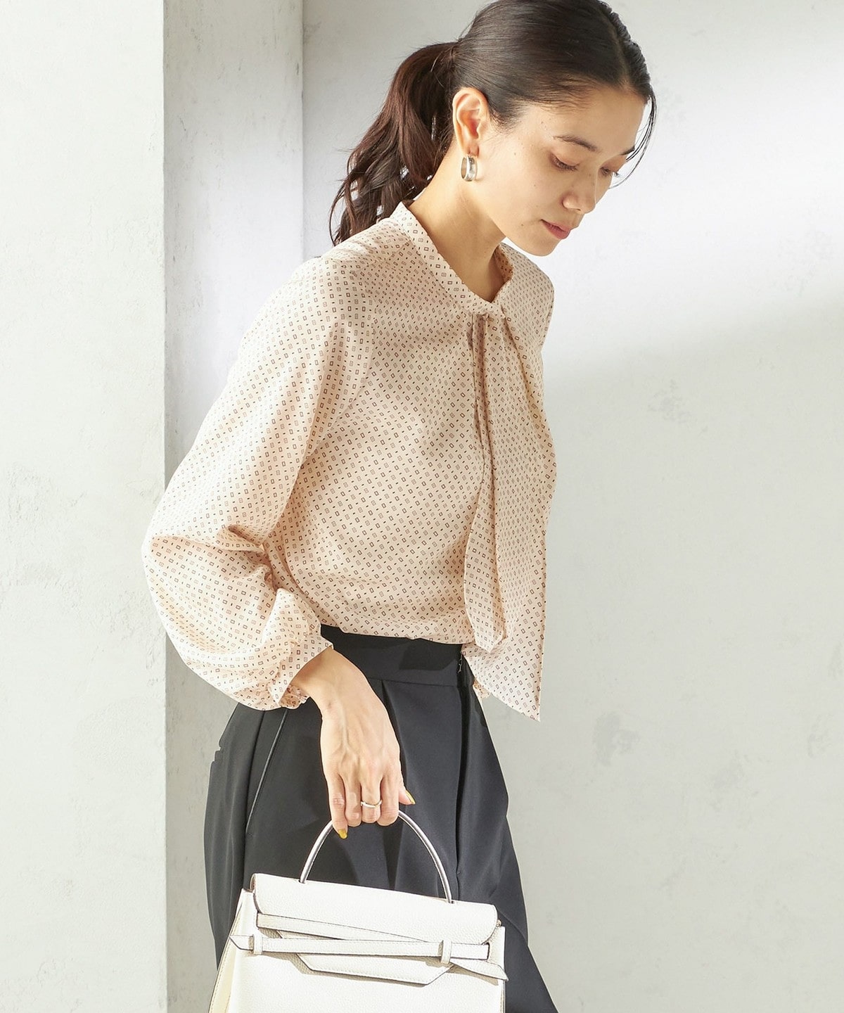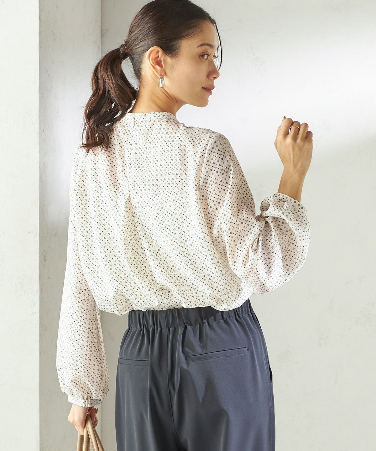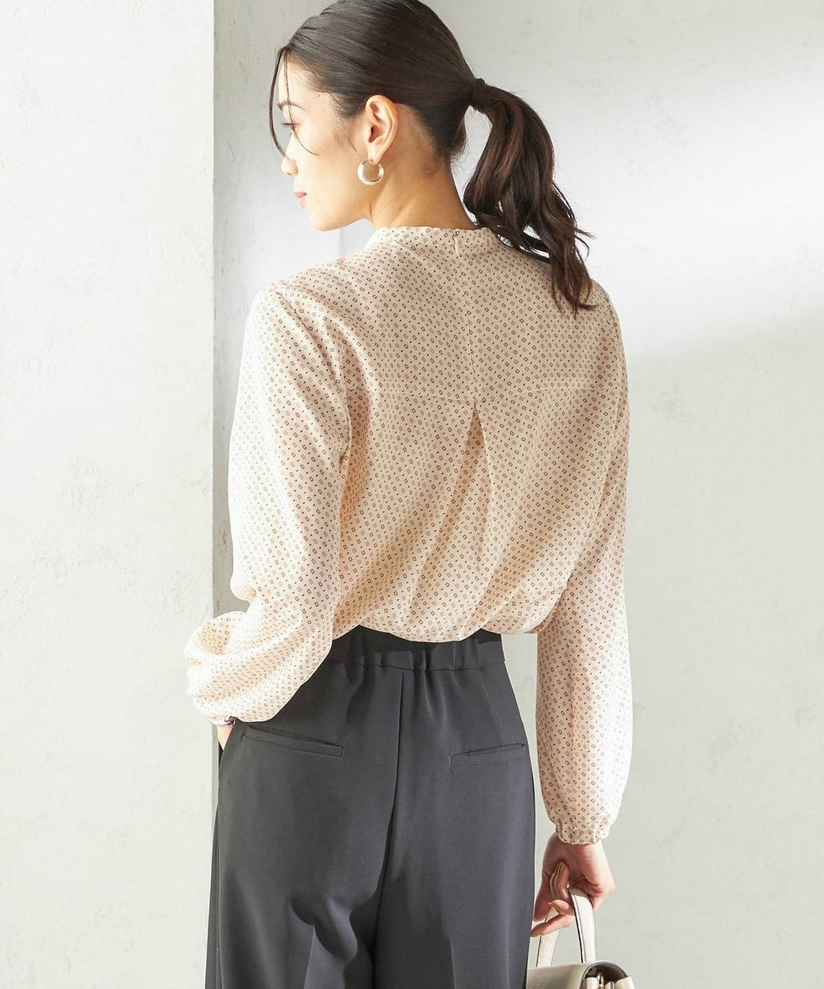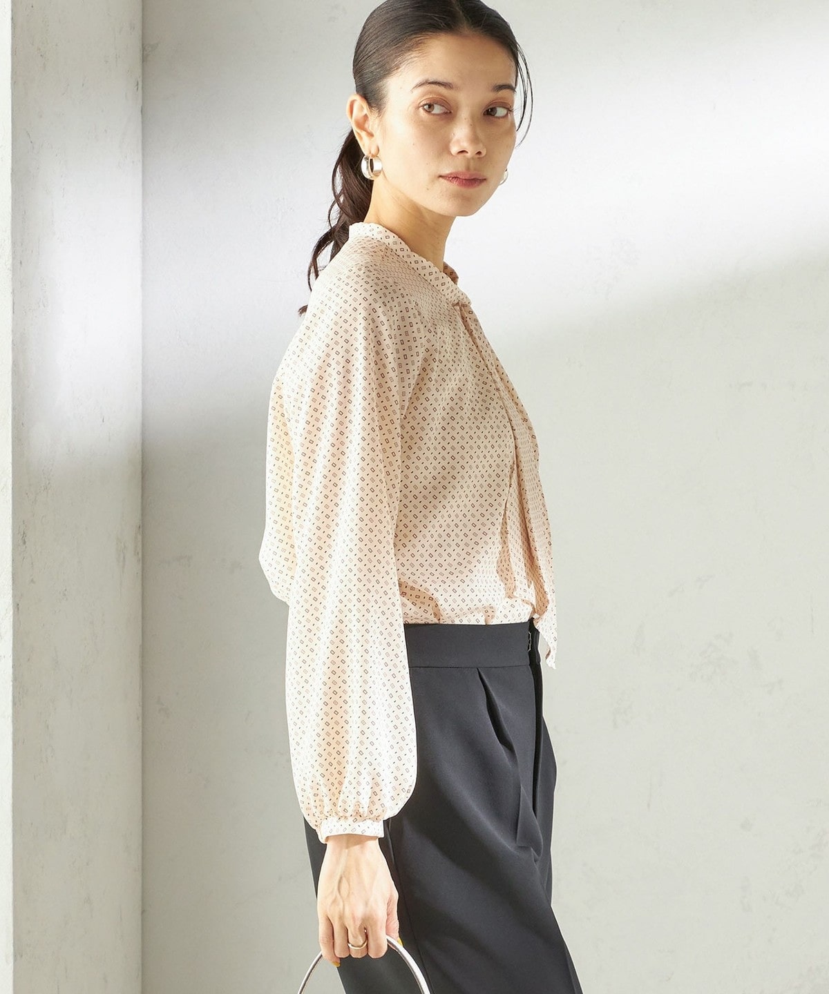 クラシカルで華やかさのある幾何柄プリントを使用したブラウス。