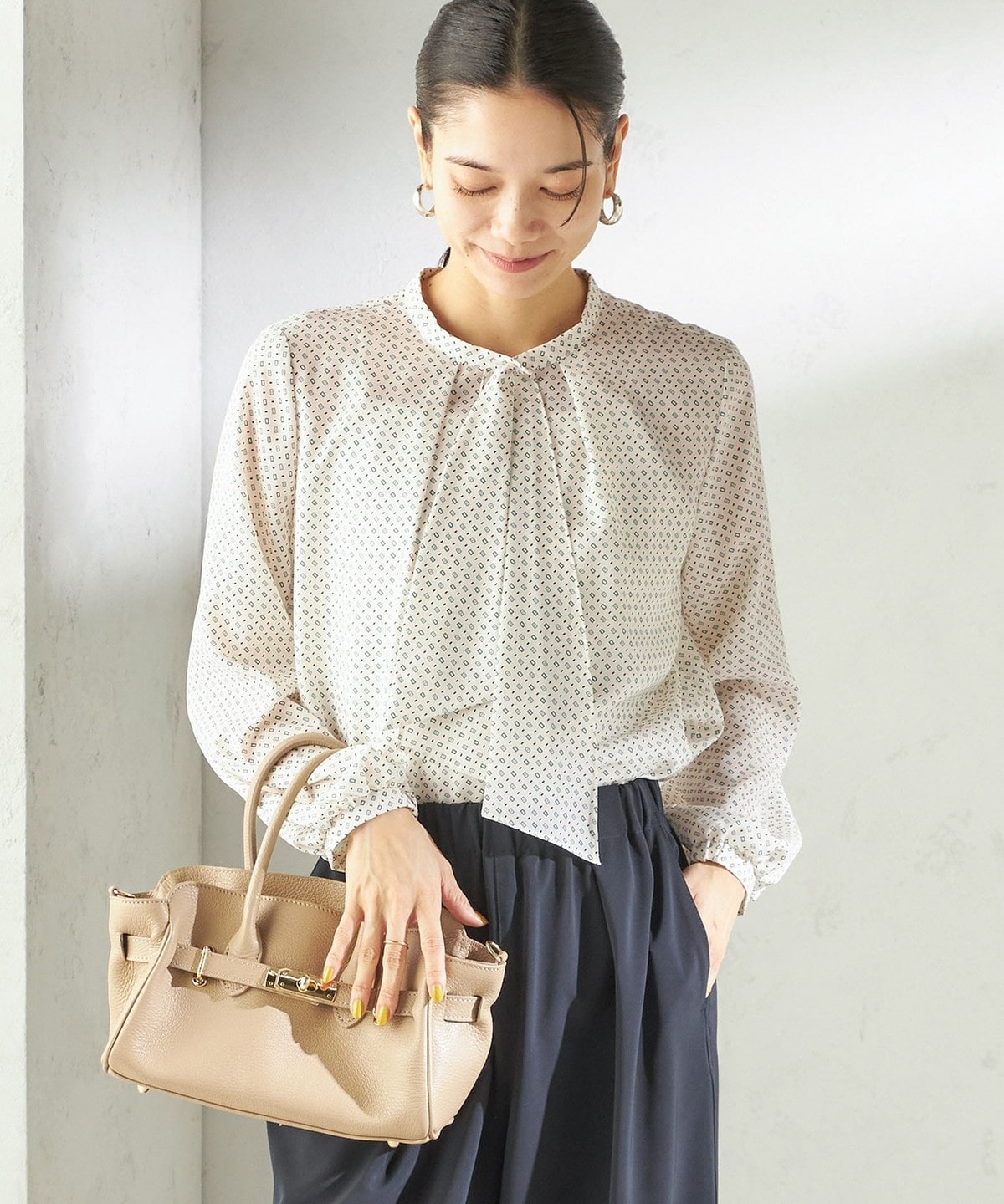 襟元のタイが甘くなり過ぎず、洗練された印象のデザインが目を惹きます。