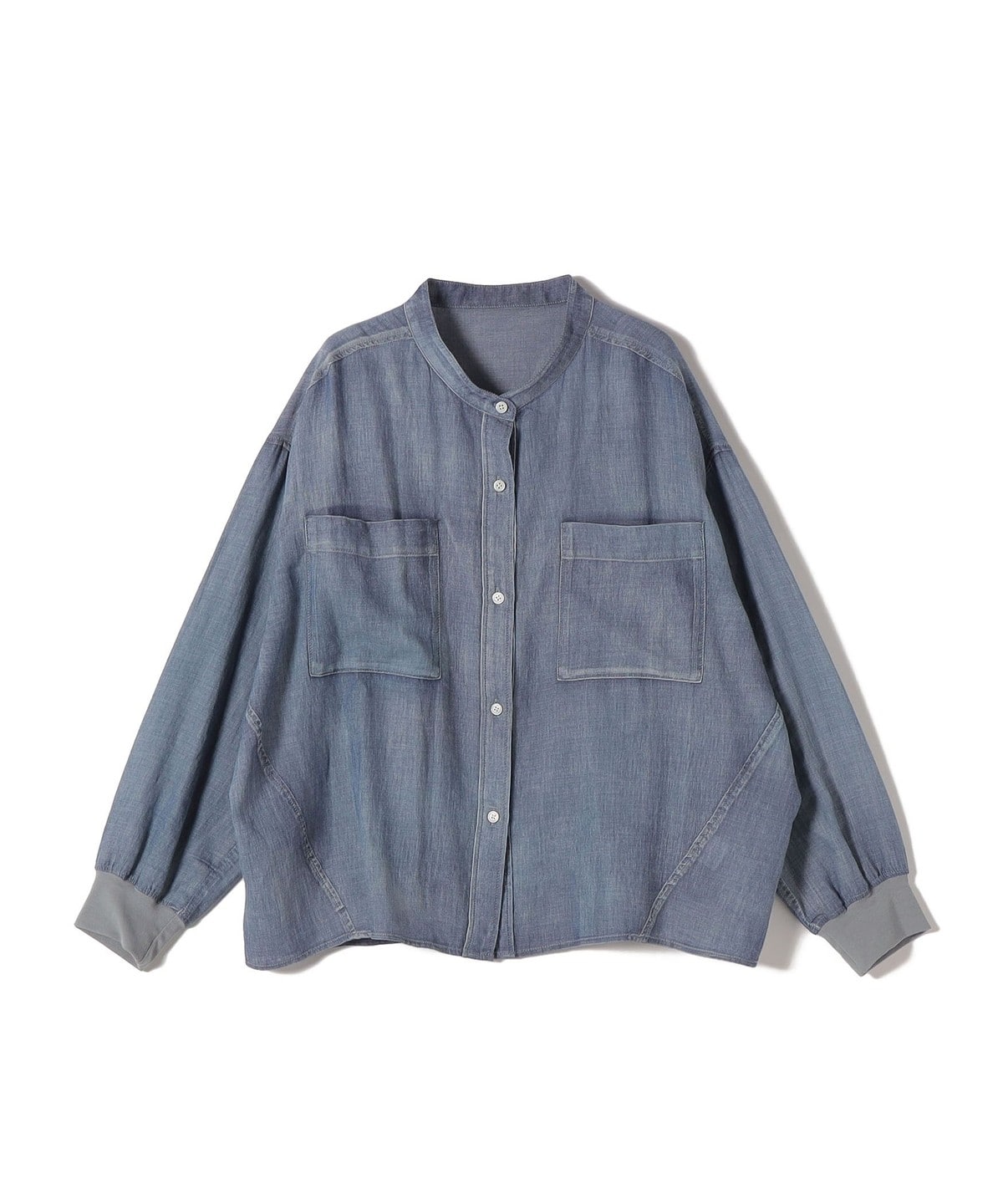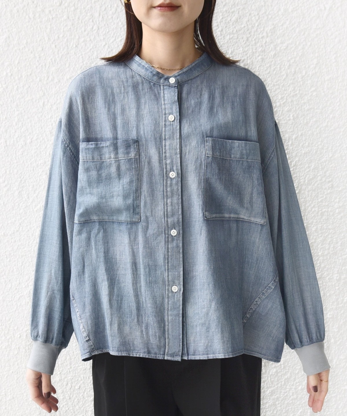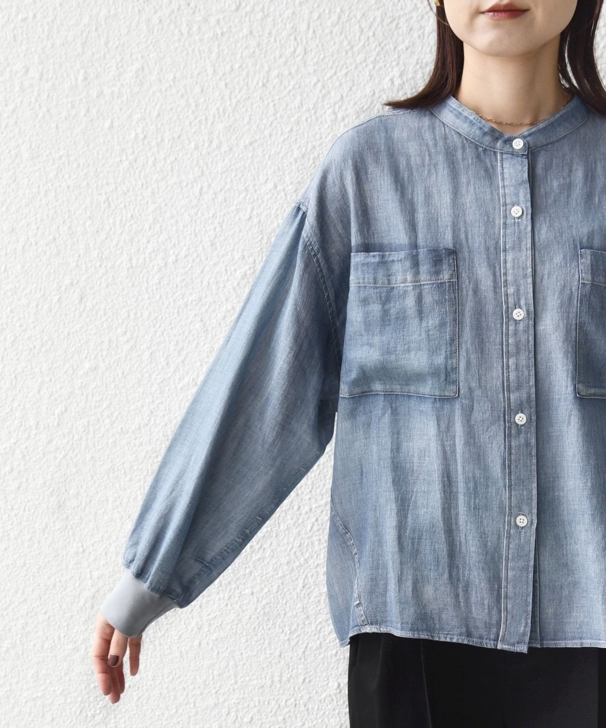 〈手洗い可能〉シアー デニム 袖 リブ バンドカラー シャツ