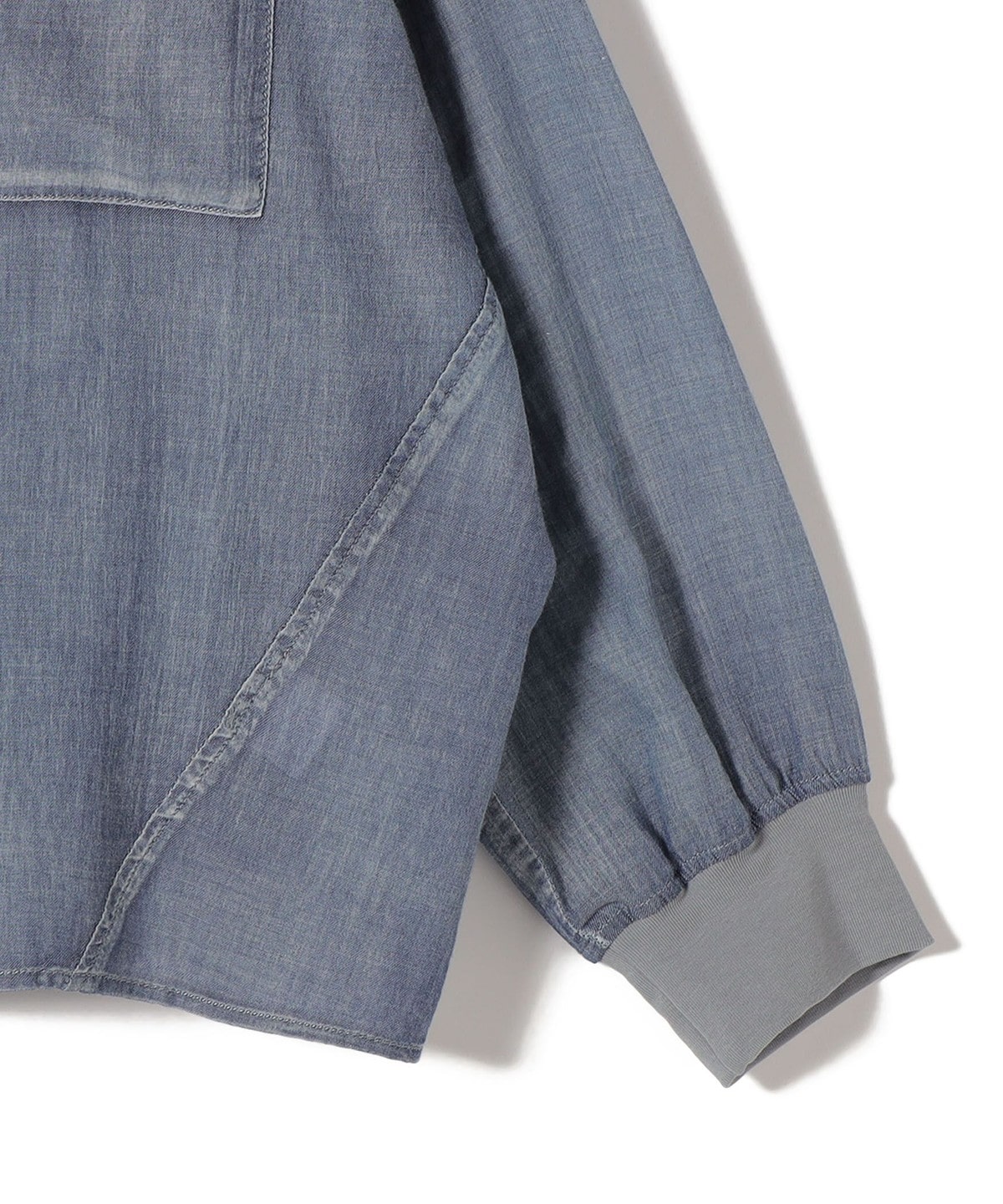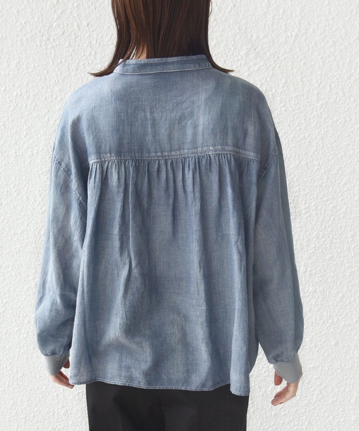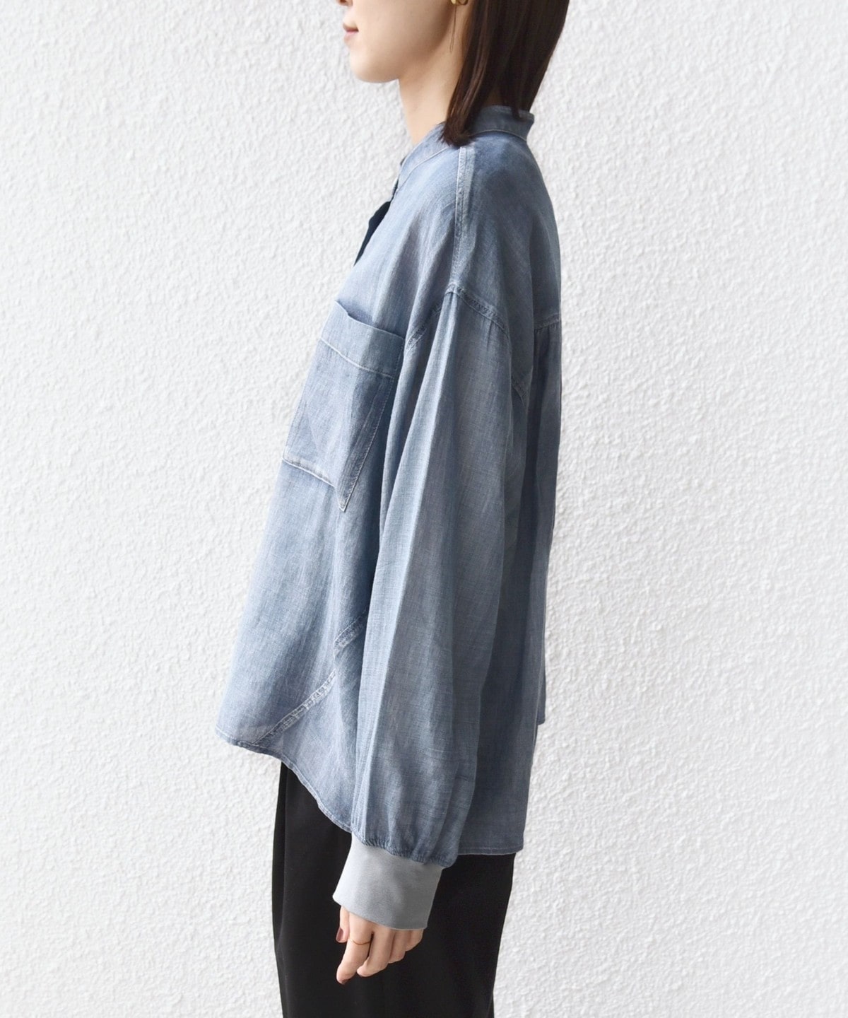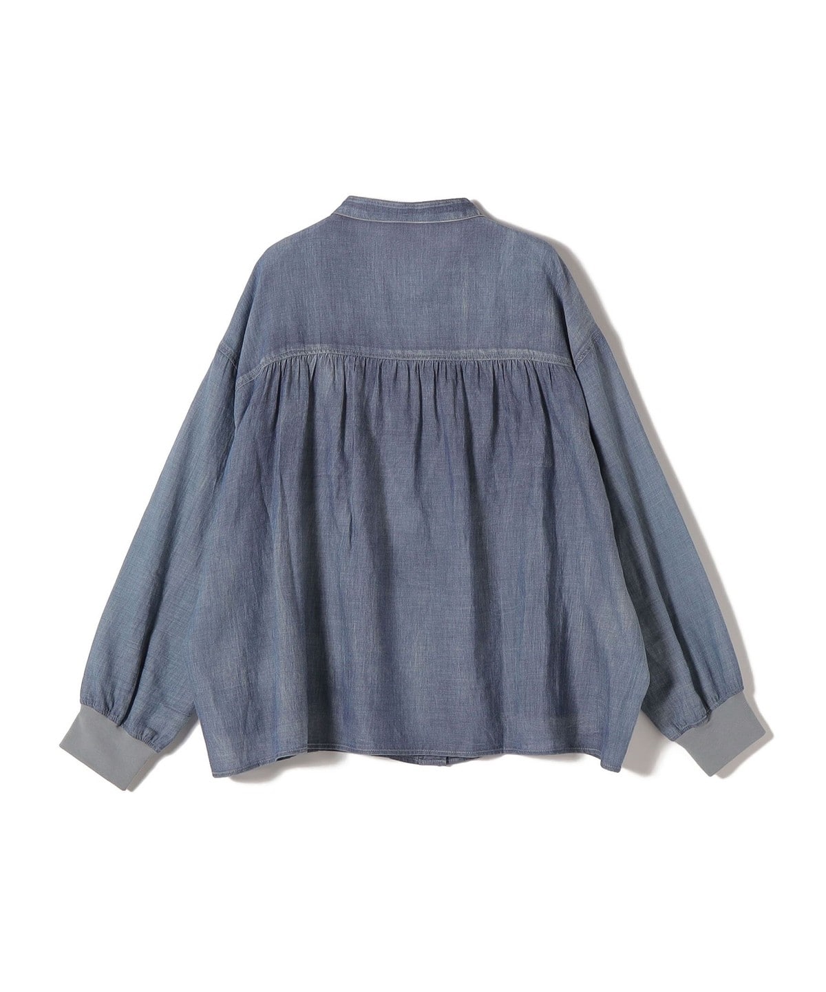 〈手洗い可能〉シアー デニム 袖 リブ バンドカラー シャツ