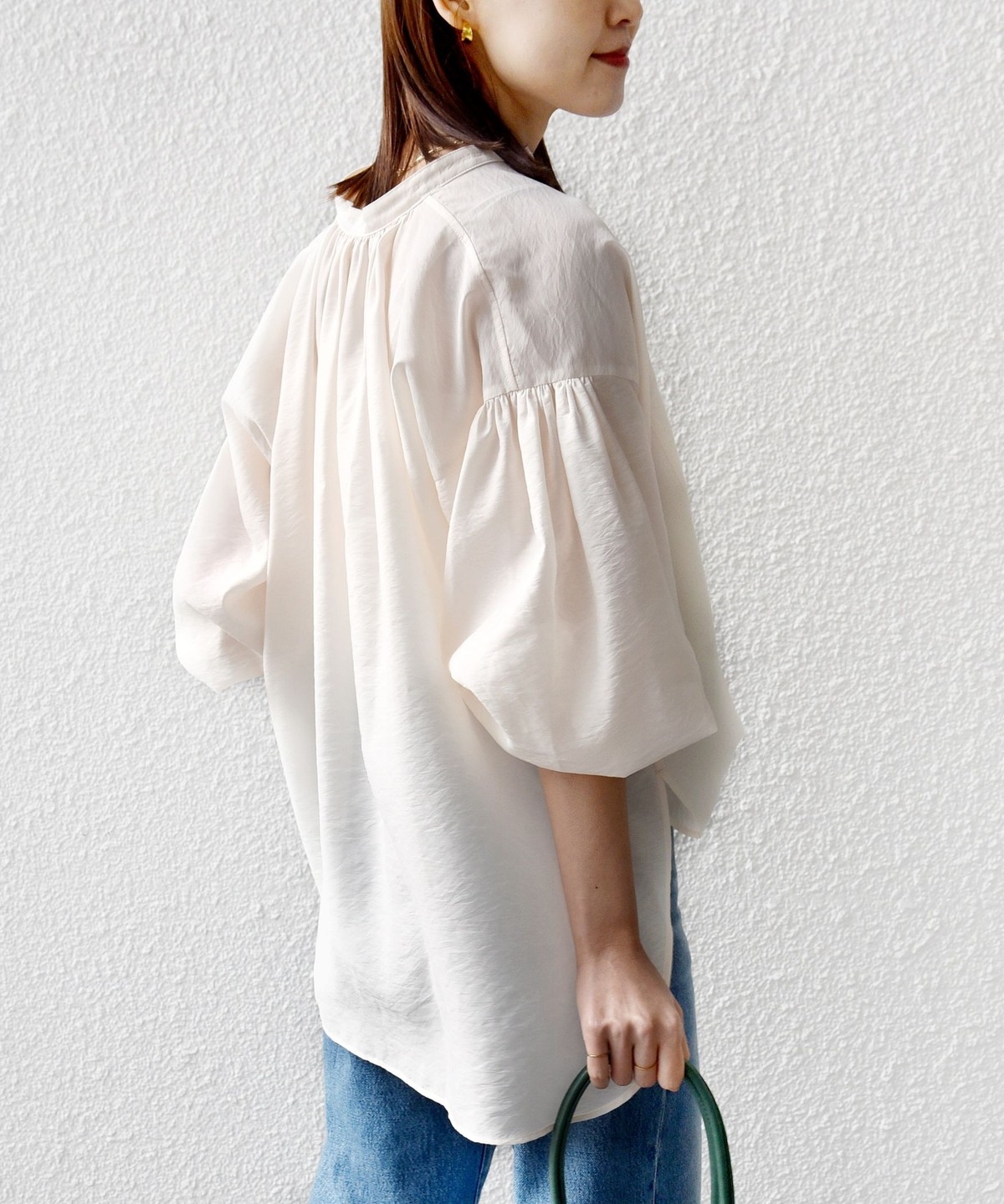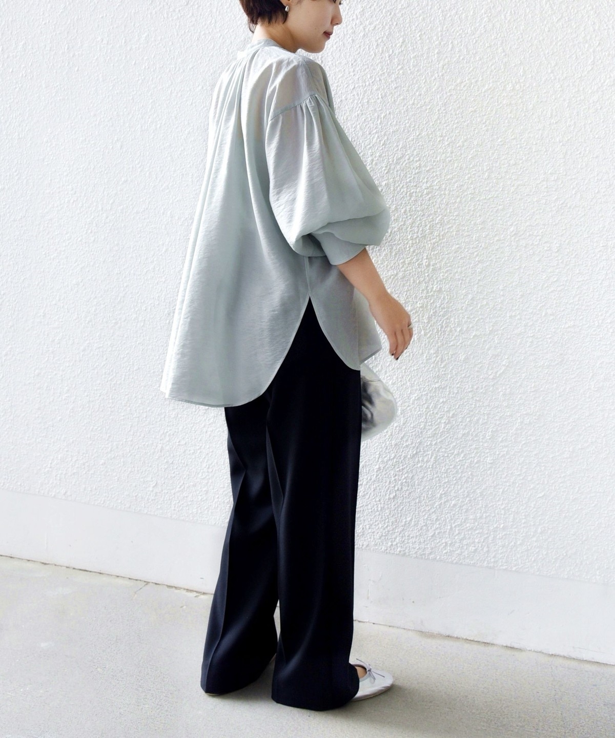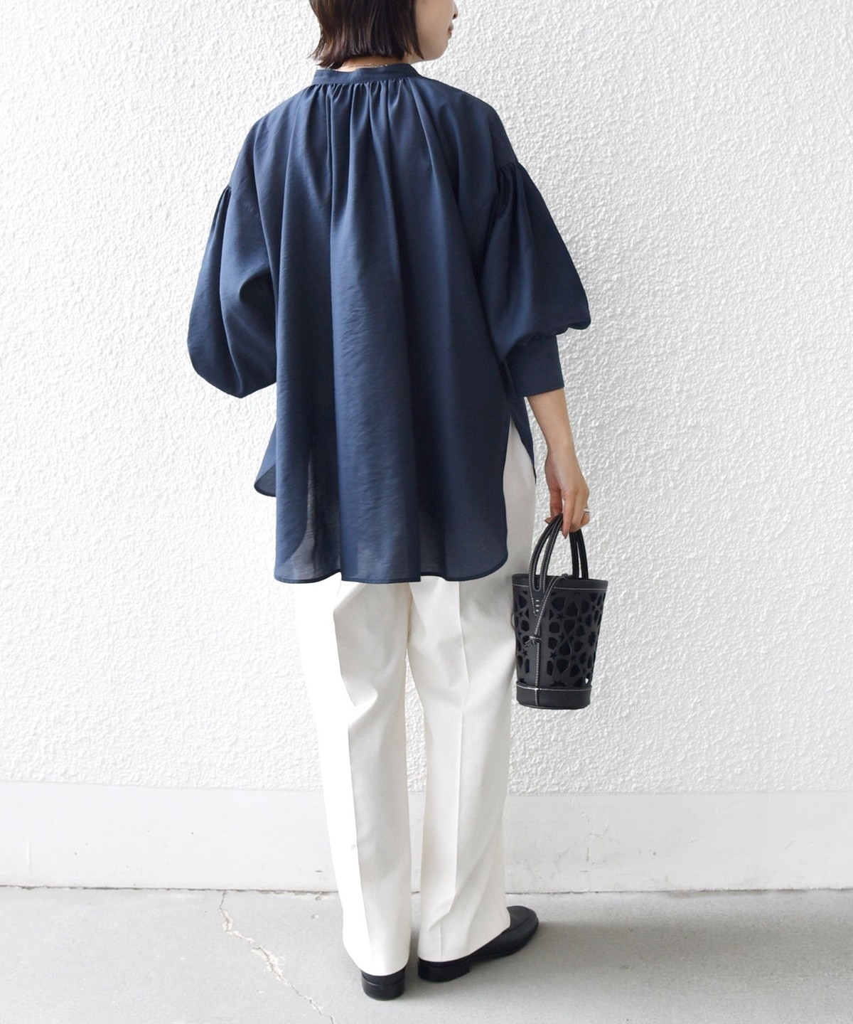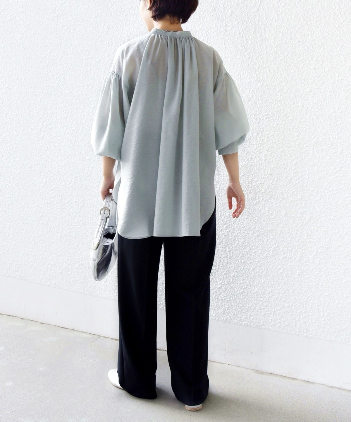 袖と背中部分にたっぷりと入れたギャザーが着るだけで華やかな印象です。