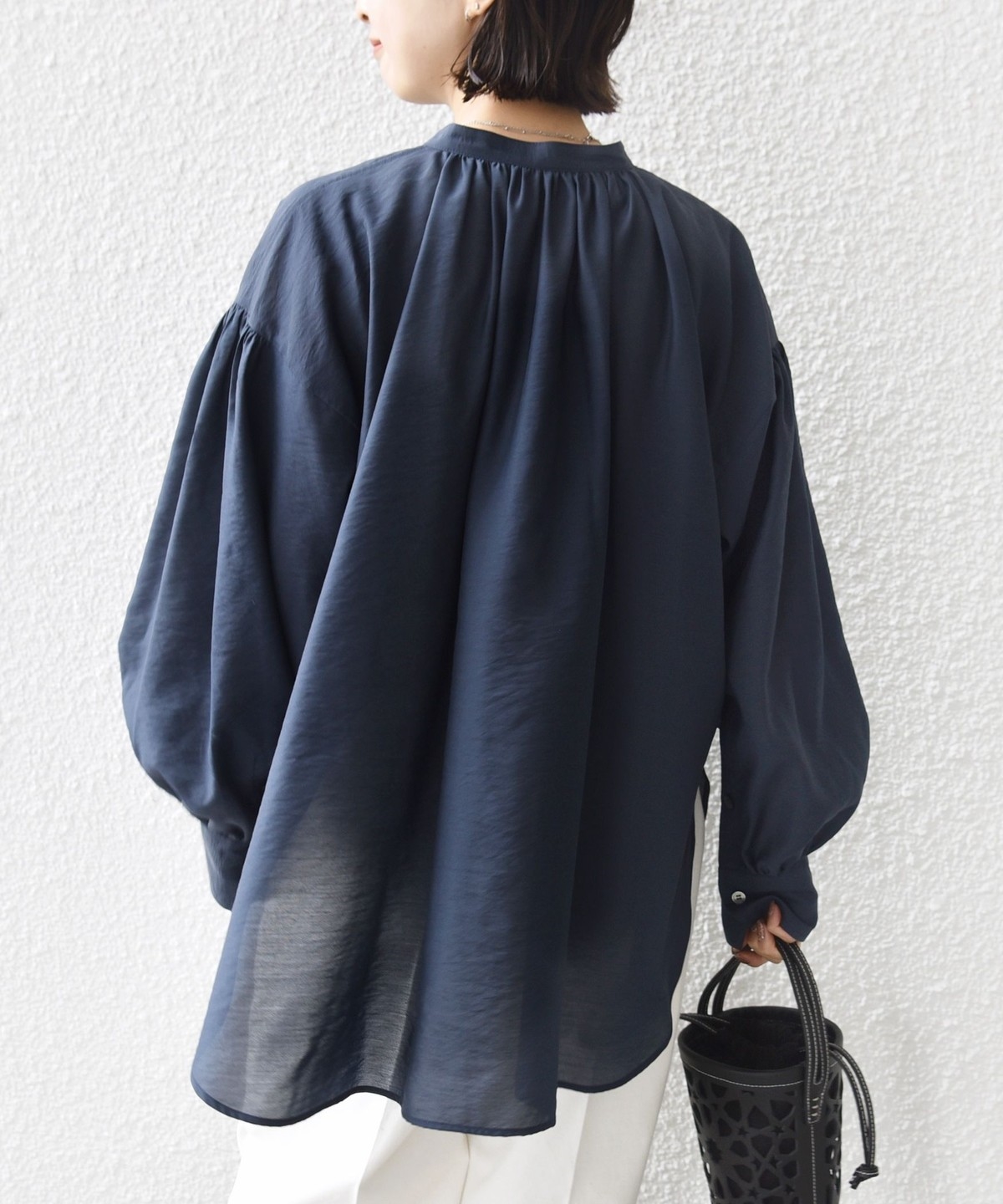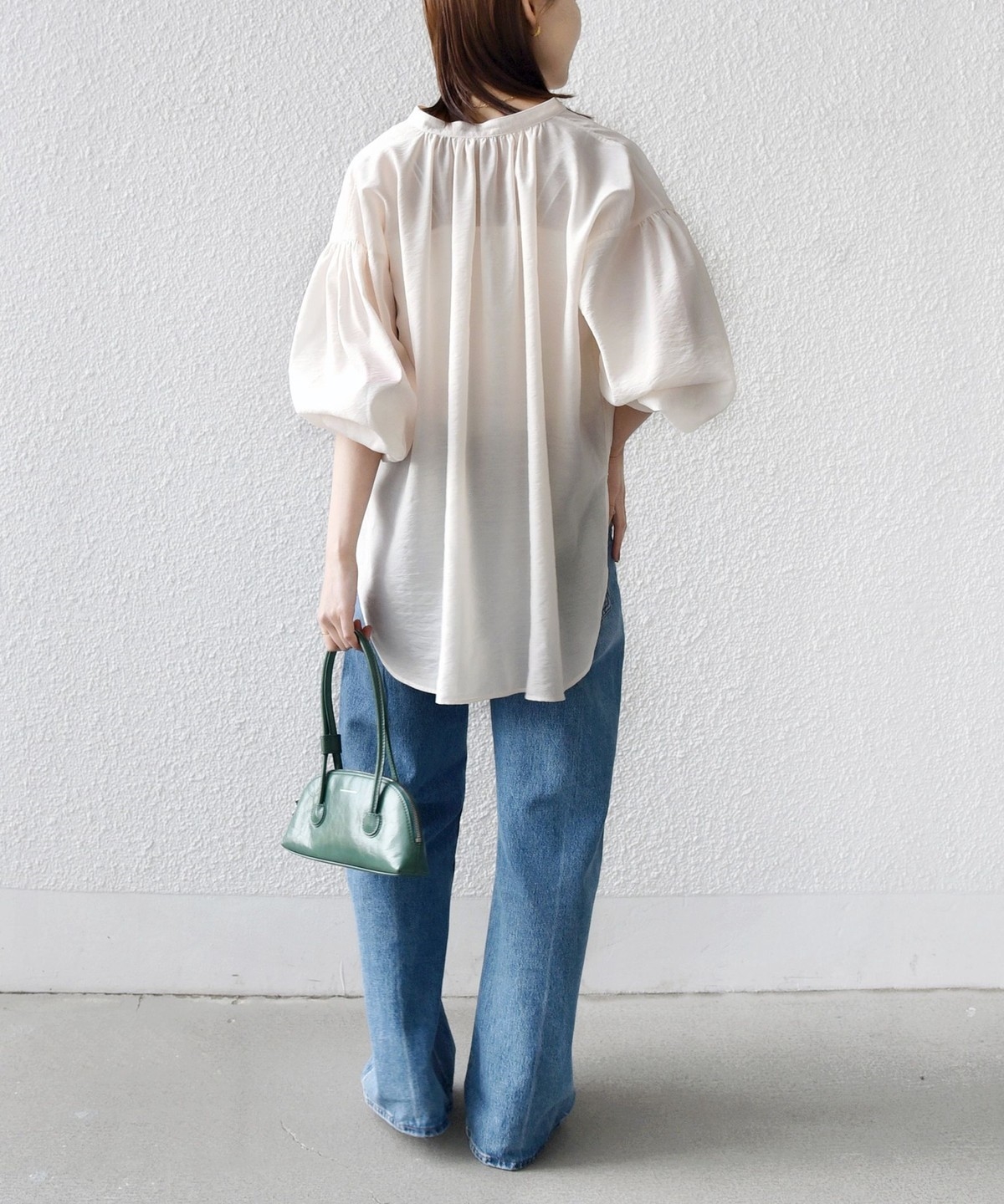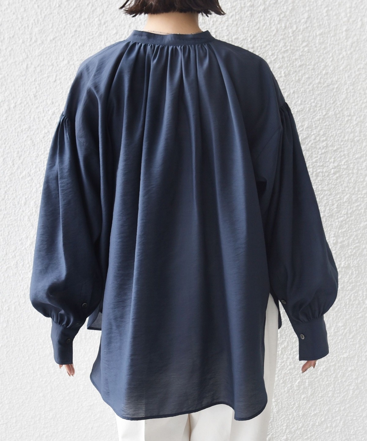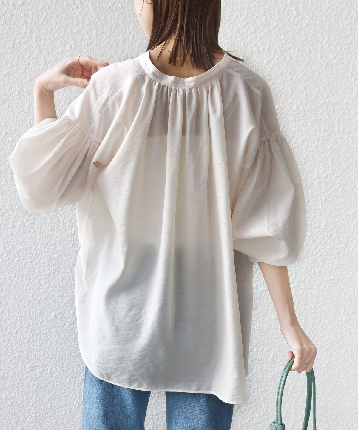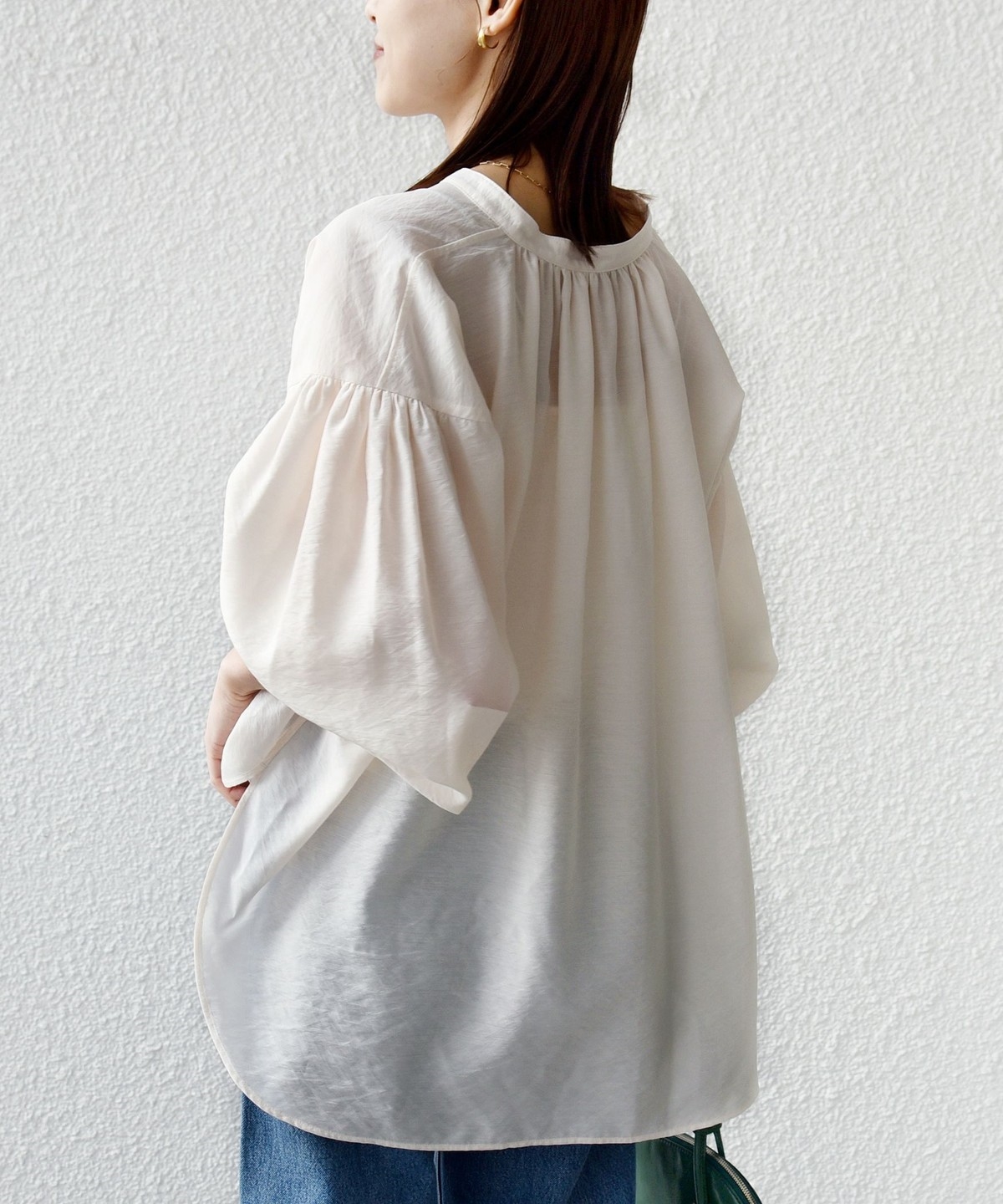 袖と背中部分にたっぷりと入れたギャザーが着るだけで華やかな印象です。