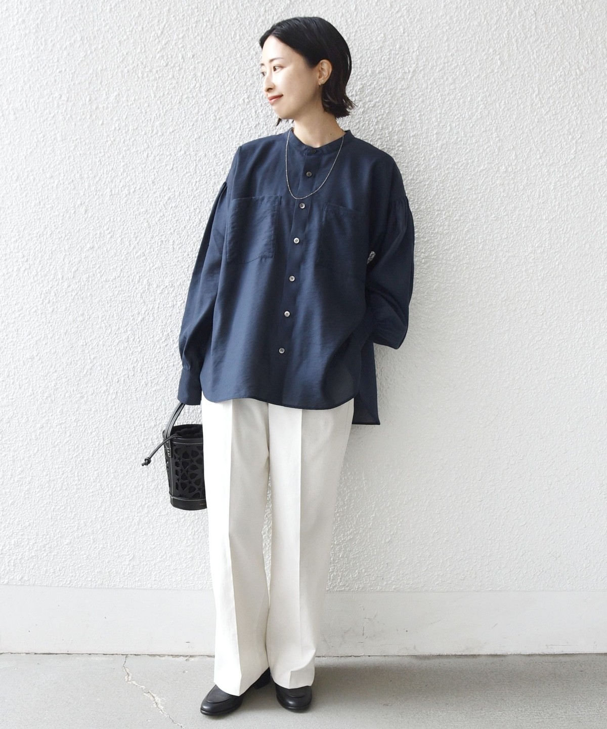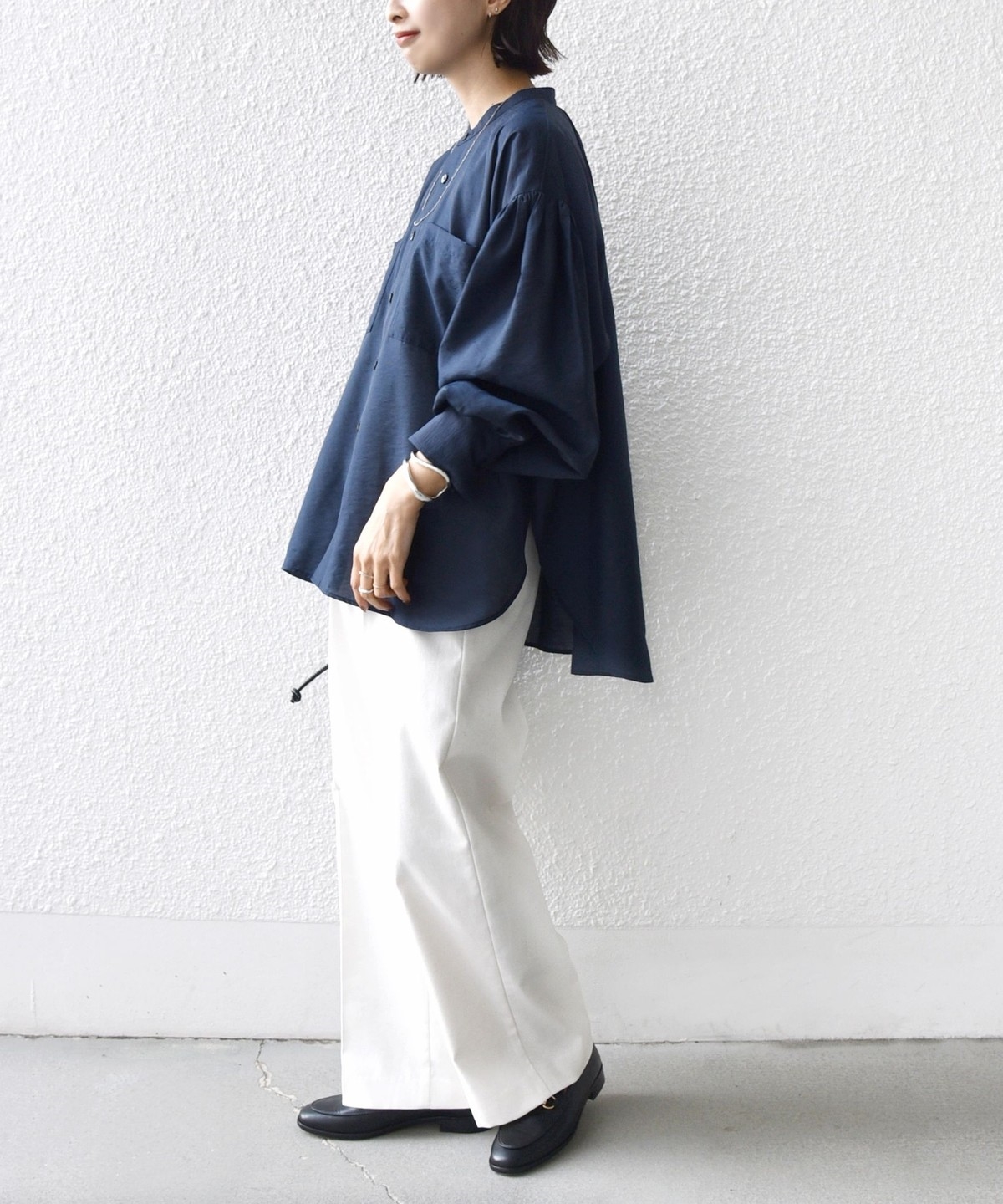 着丈も少し長めで作っているため、上からニットなどを着て裾だけシャツを見せてレイヤードスタイルを楽しんでいただいても◎
