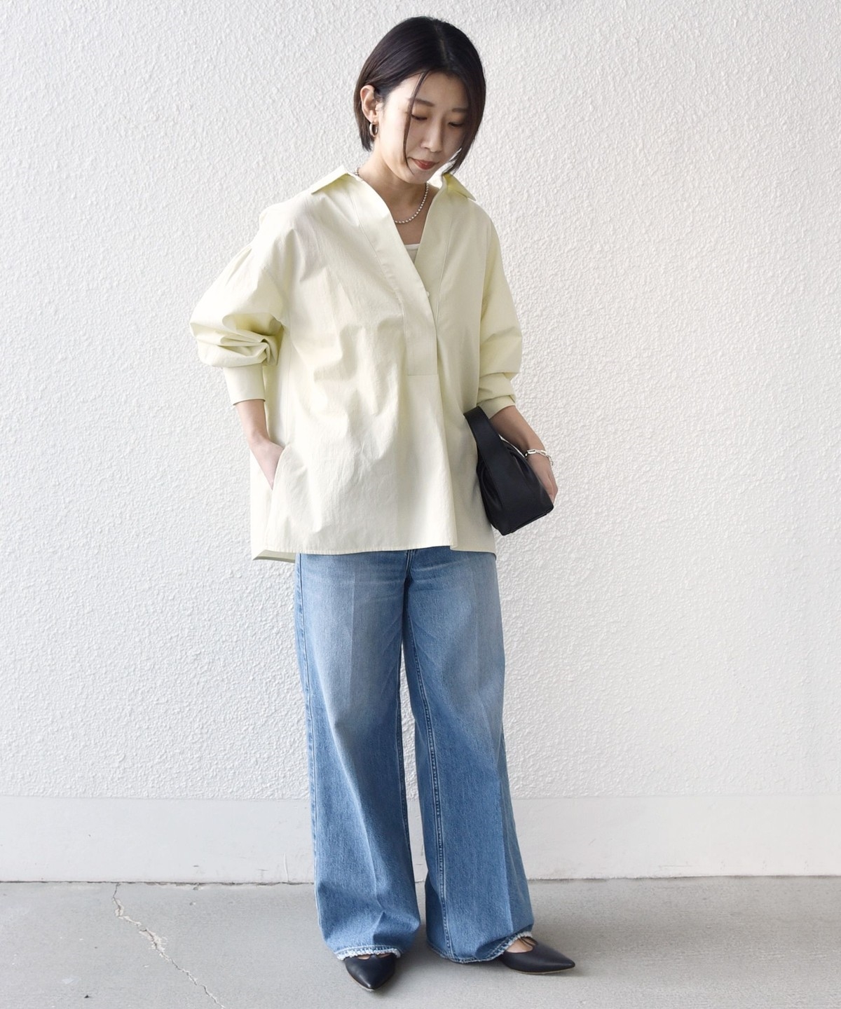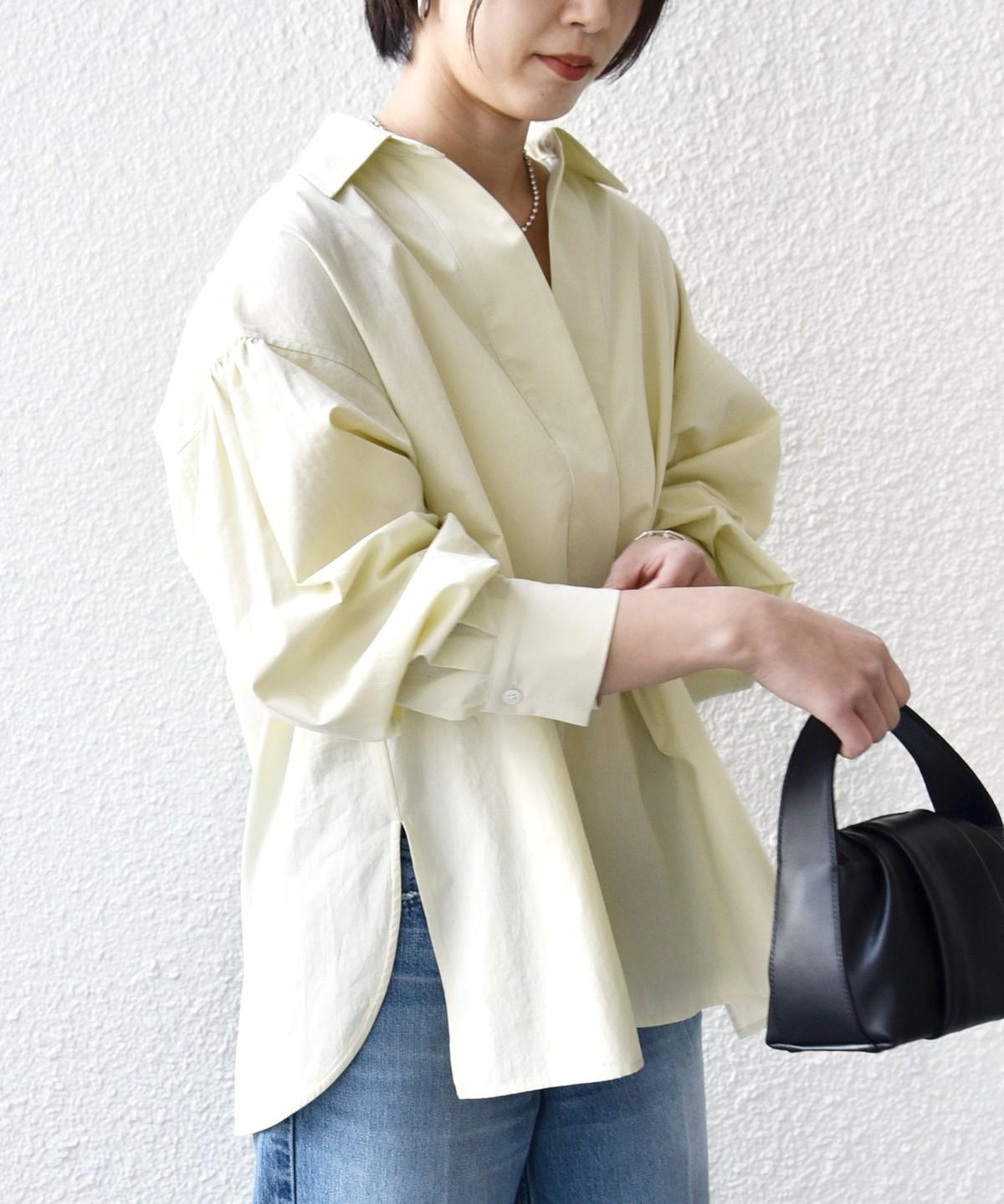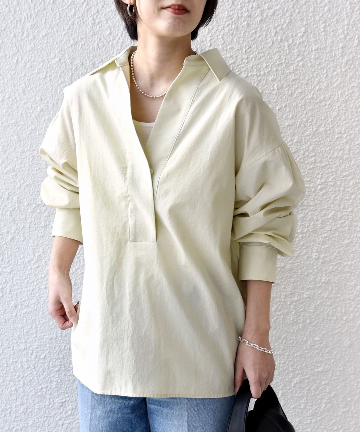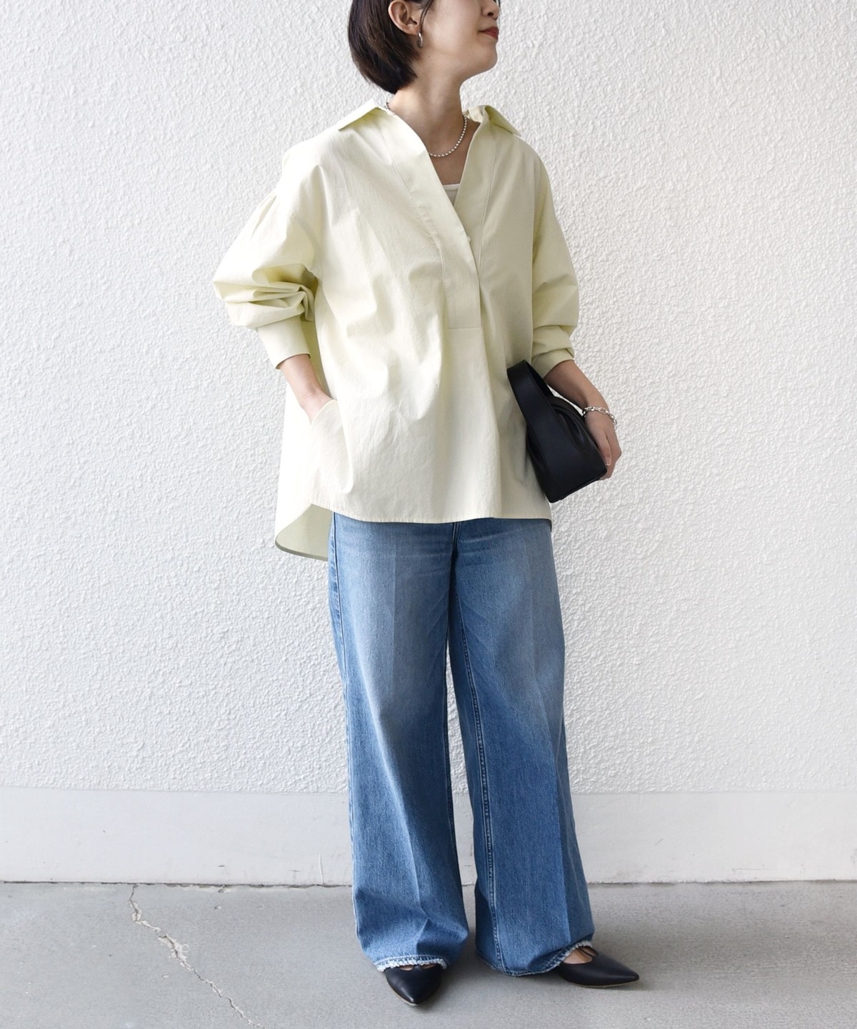 前後差のあるデザインを活かし、襟を少し抜いた着こなしでこなれ感を演出するのもおすすめ。