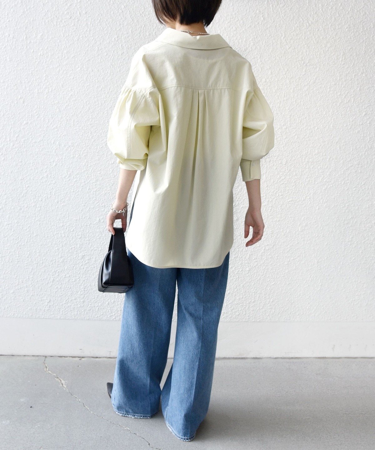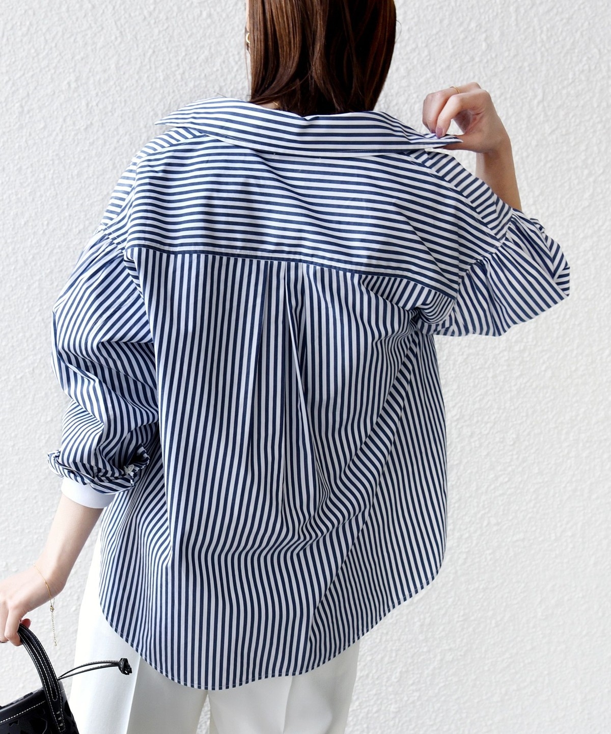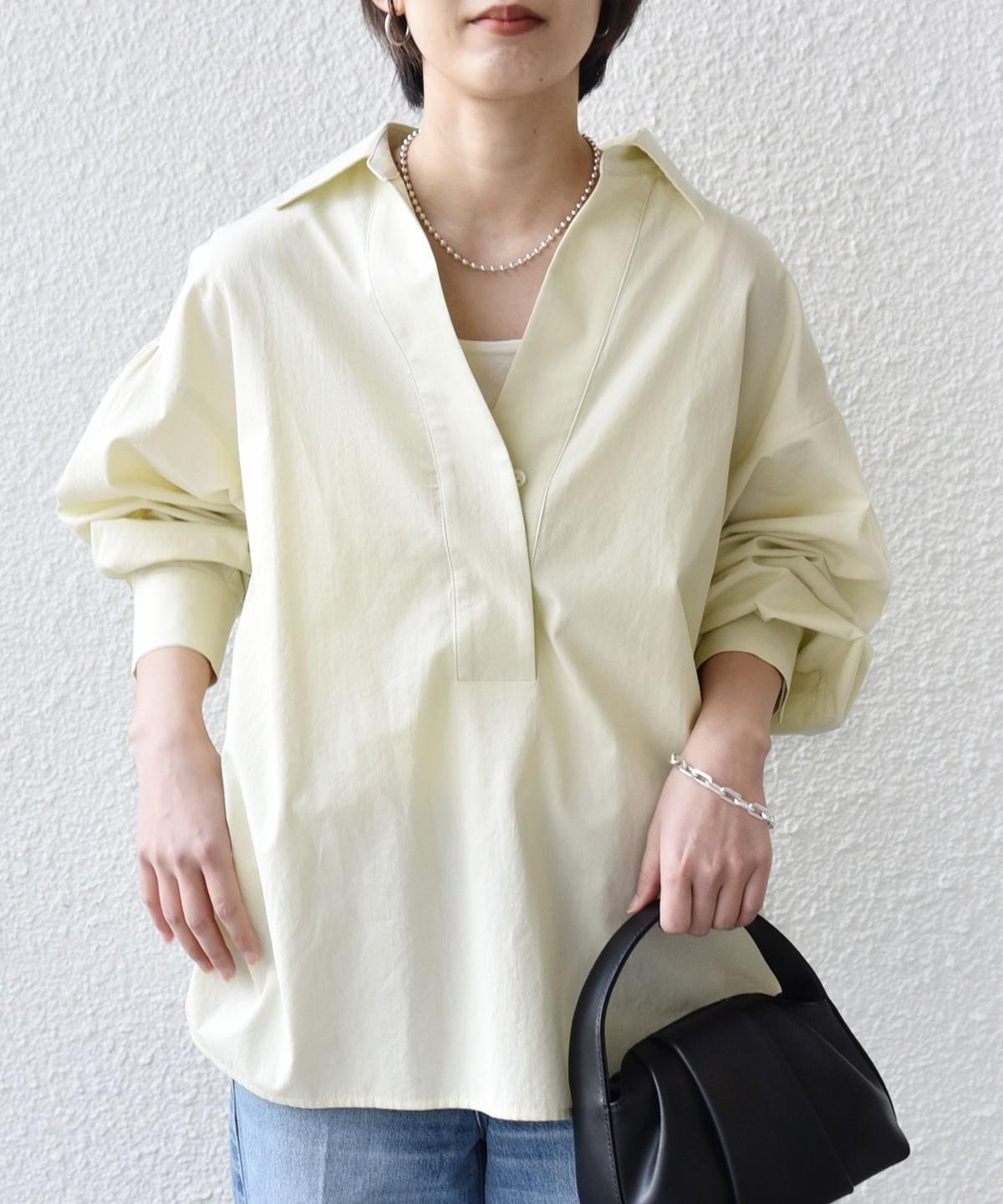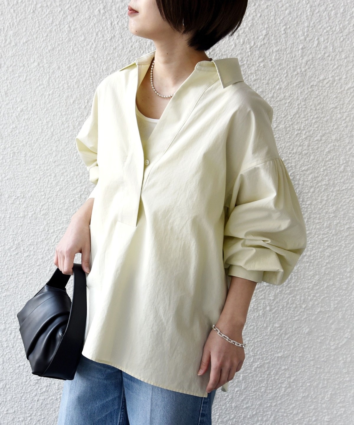 前後差のあるデザインを活かし、襟を少し抜いた着こなしでこなれ感を演出するのもおすすめ。