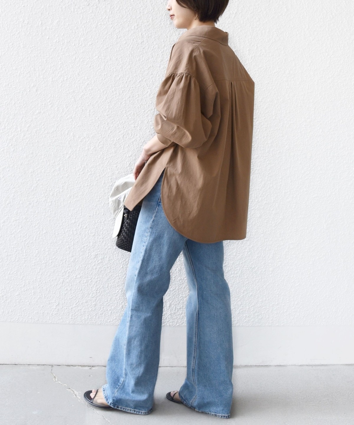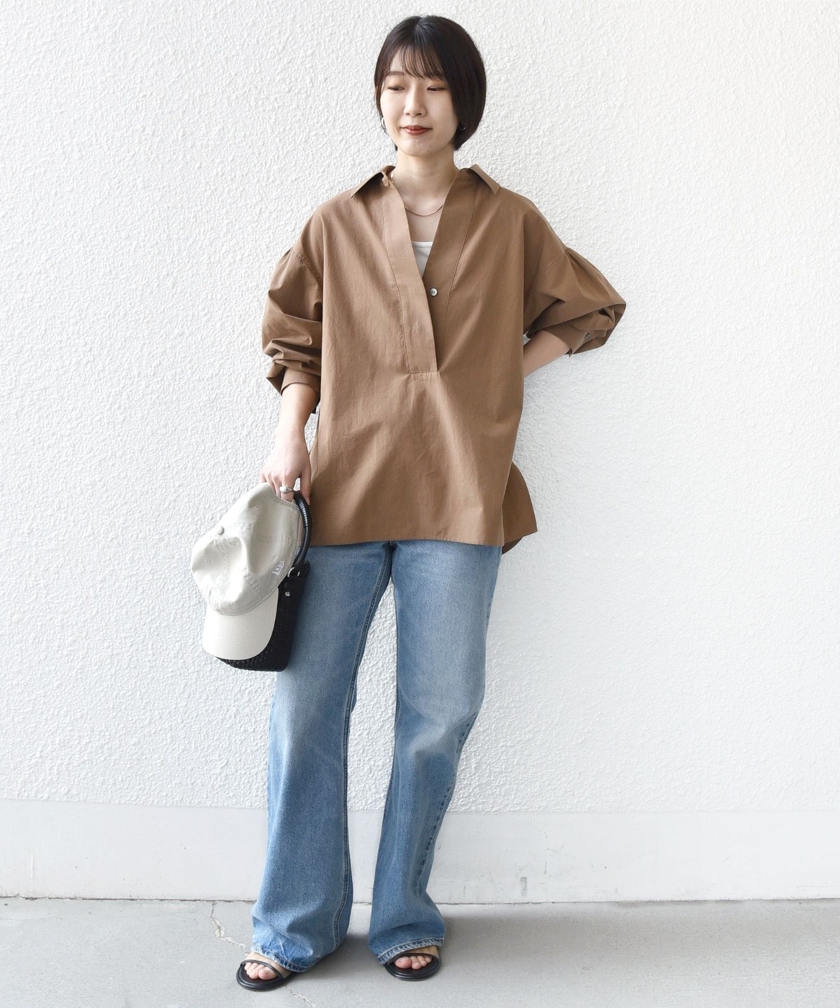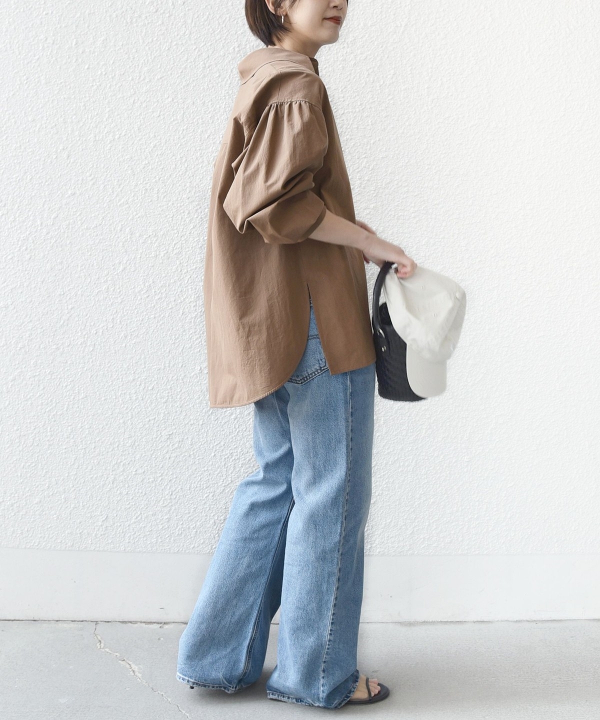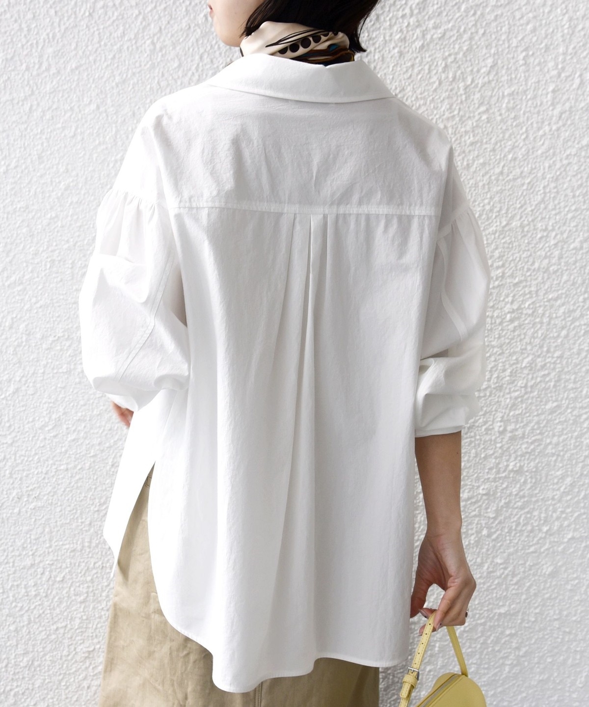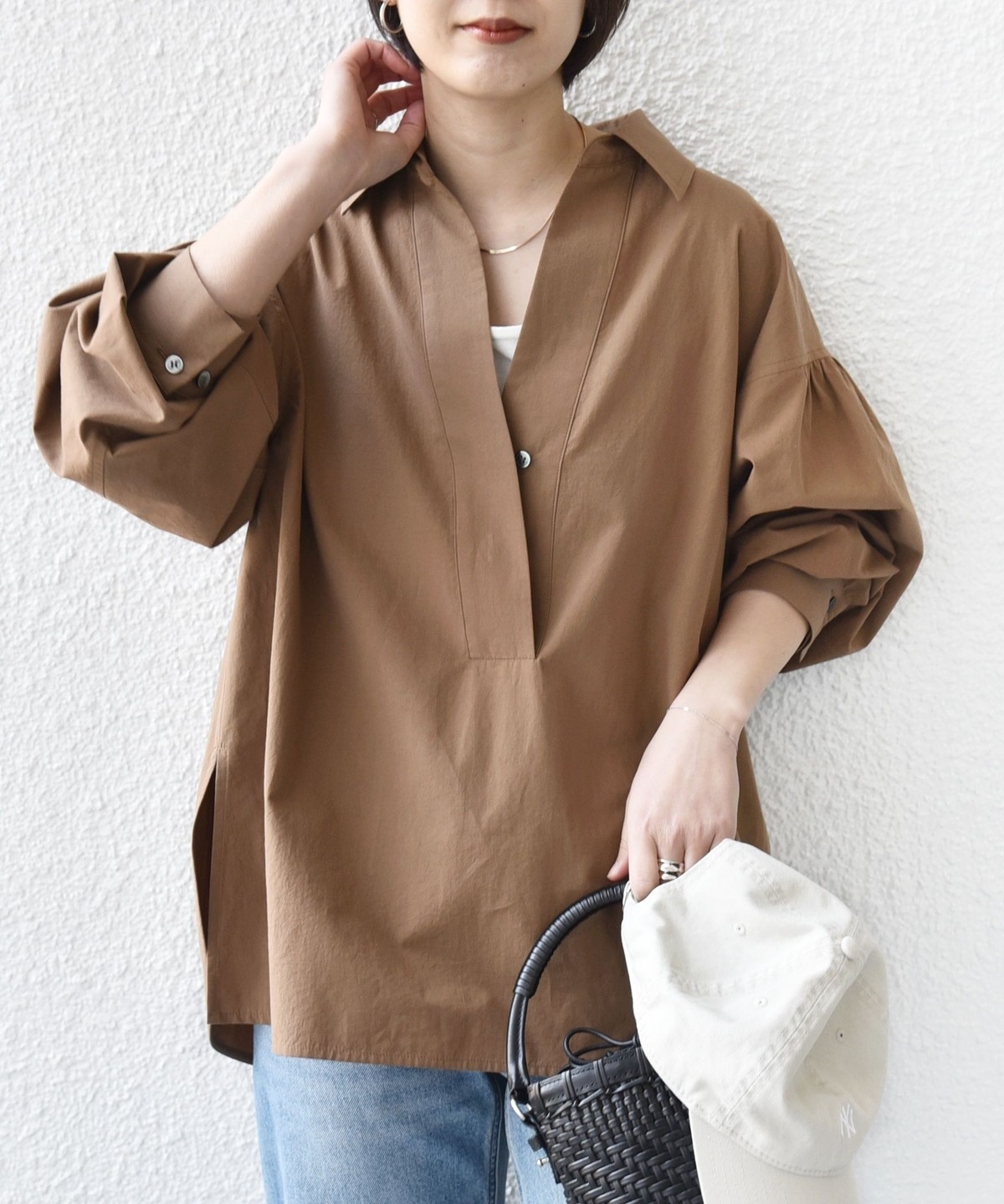 前後差のあるデザインを活かし、襟を少し抜いた着こなしでこなれ感を演出するのもおすすめ。