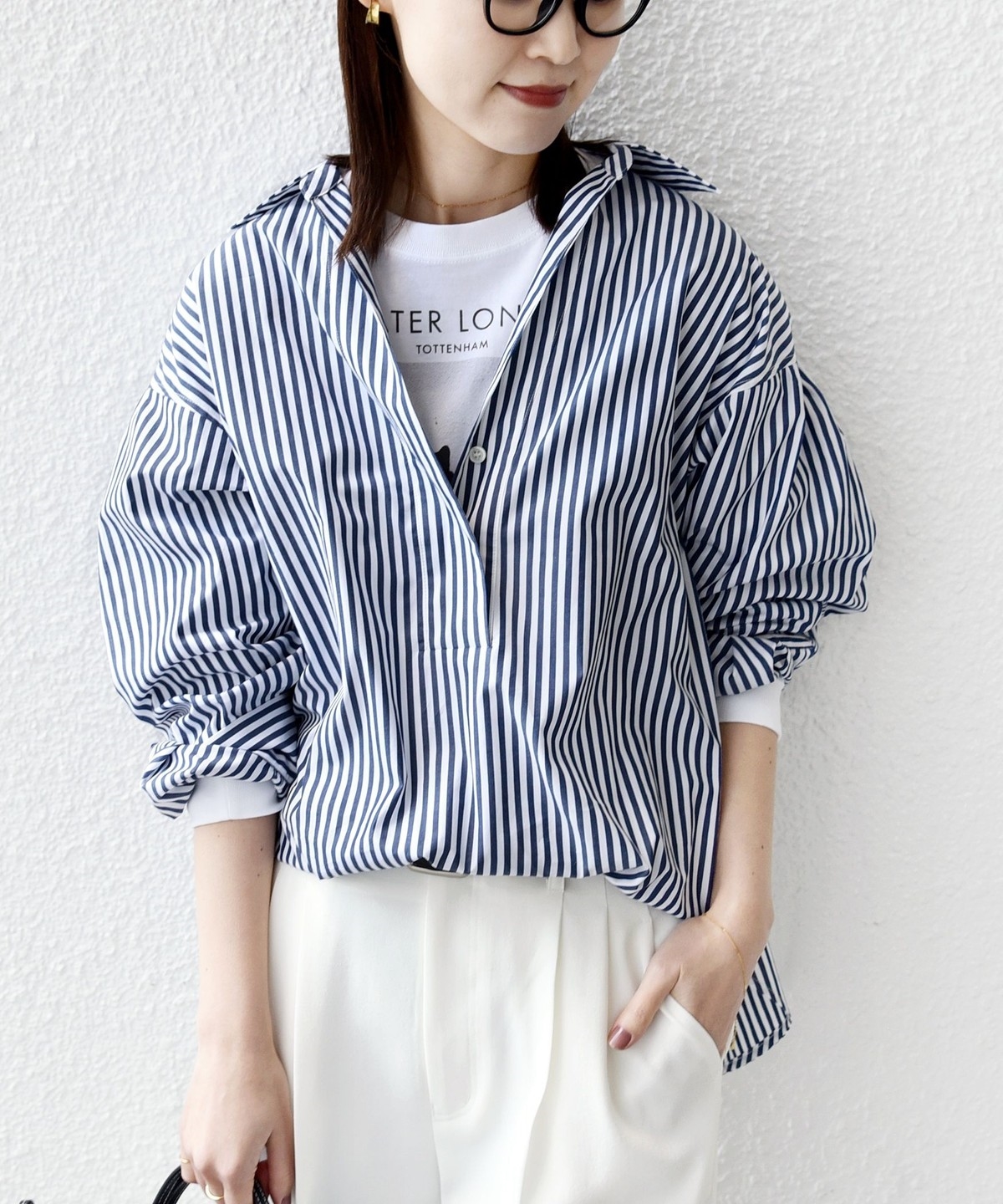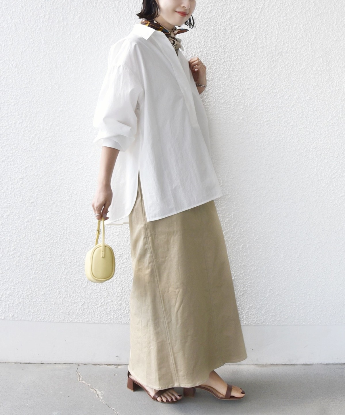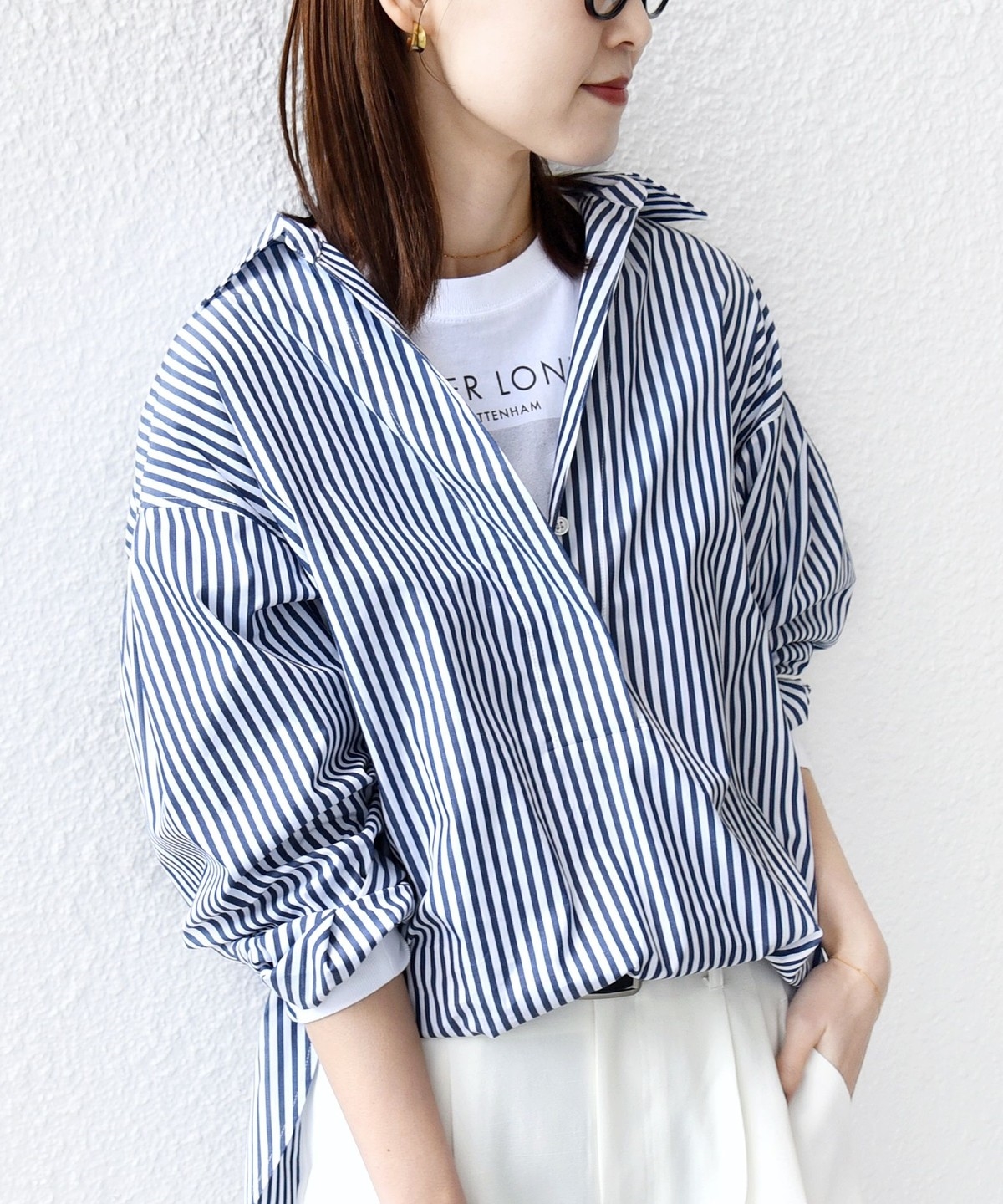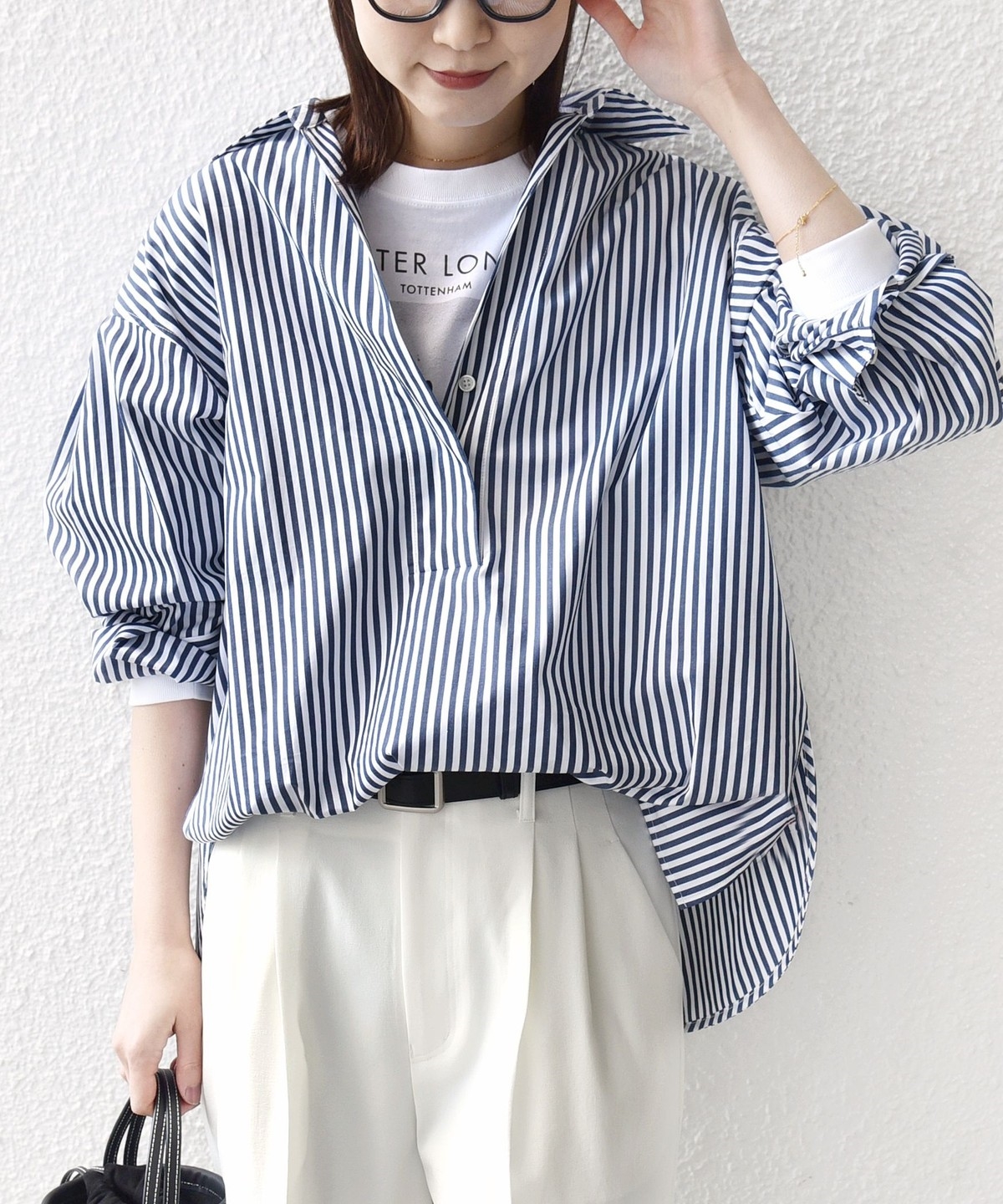 前後差のあるデザインを活かし、襟を少し抜いた着こなしでこなれ感を演出するのもおすすめ。