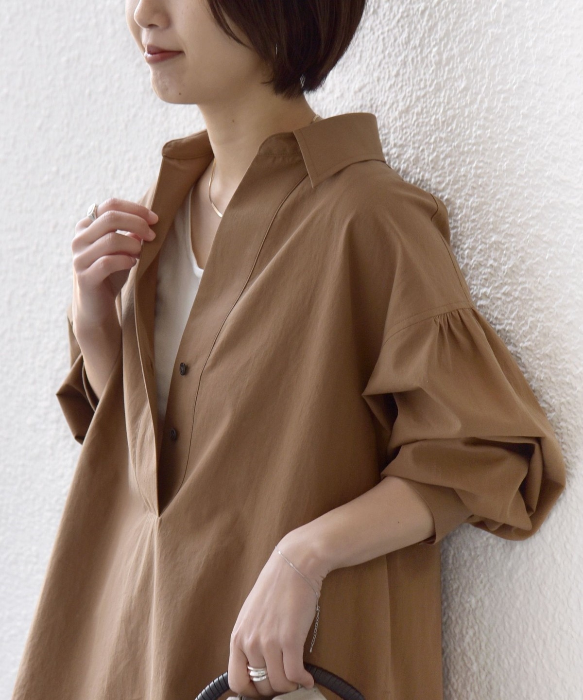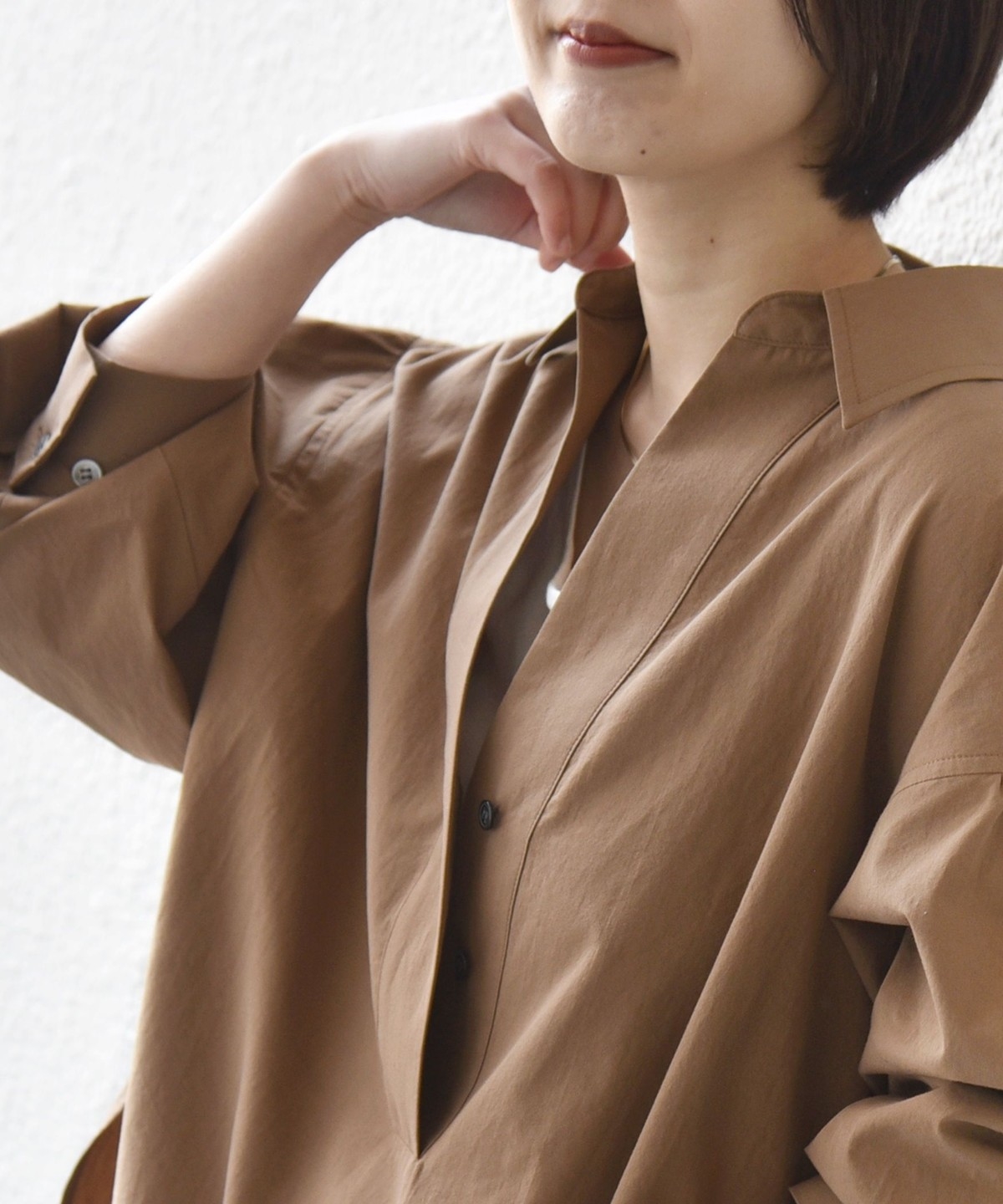 首元は深めのVネックデザインで、インナーをのぞかせた大人の抜け感ある着こなしが楽しめるシャツです。