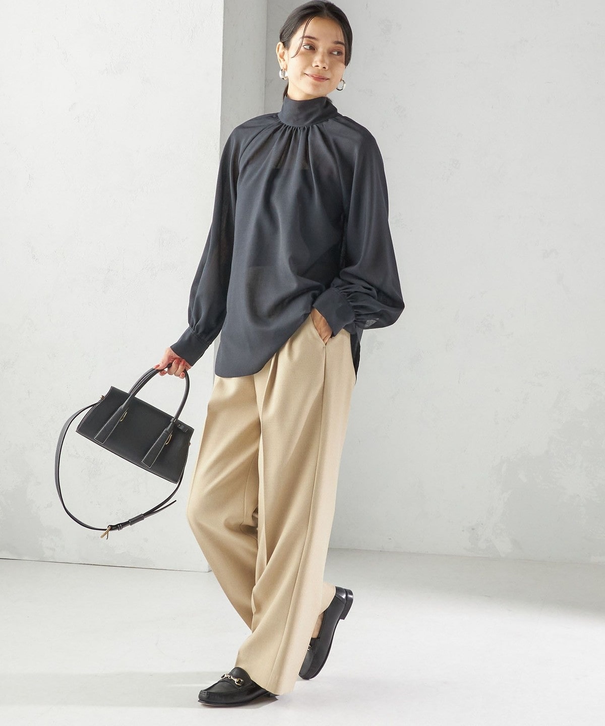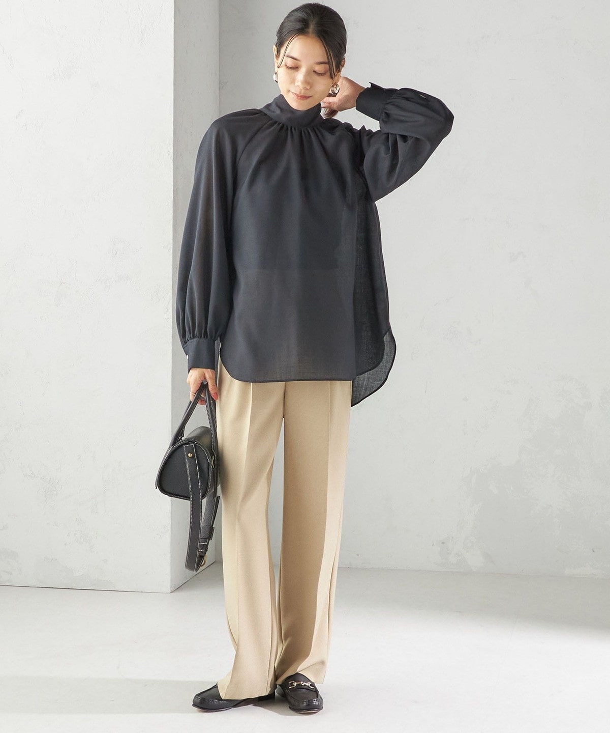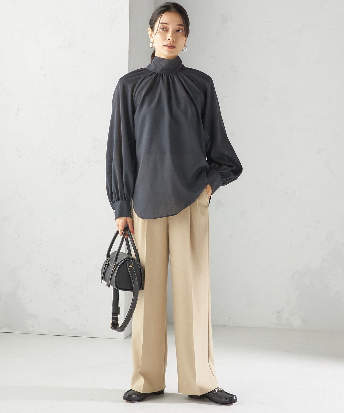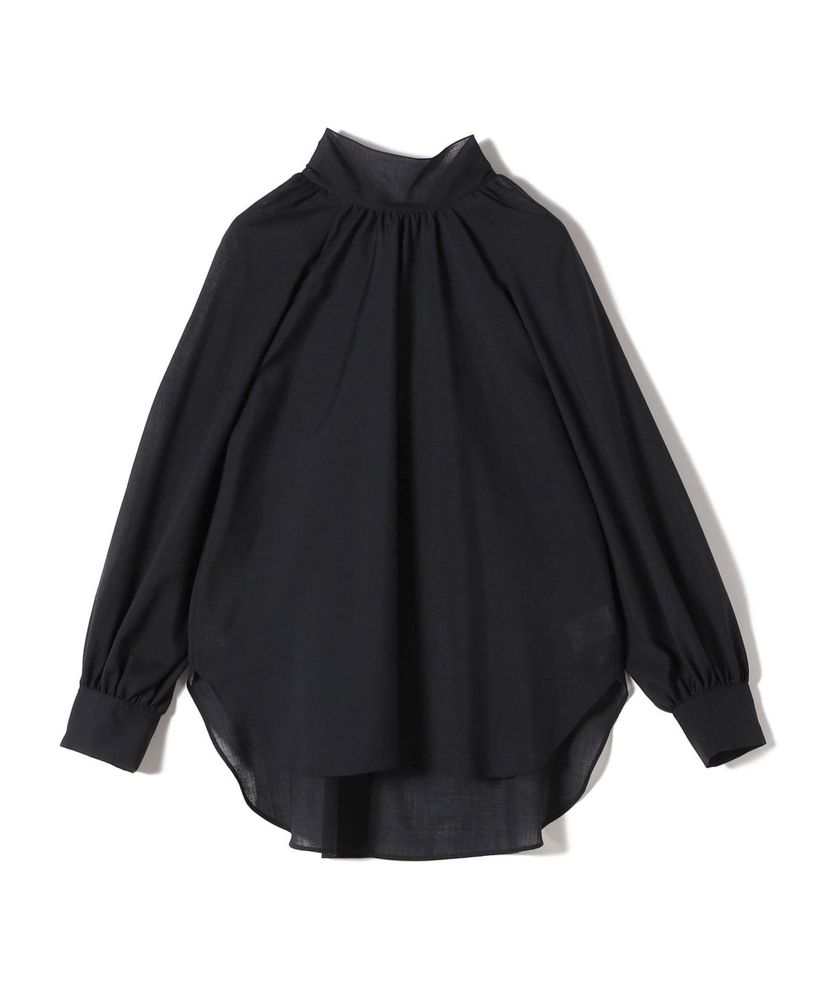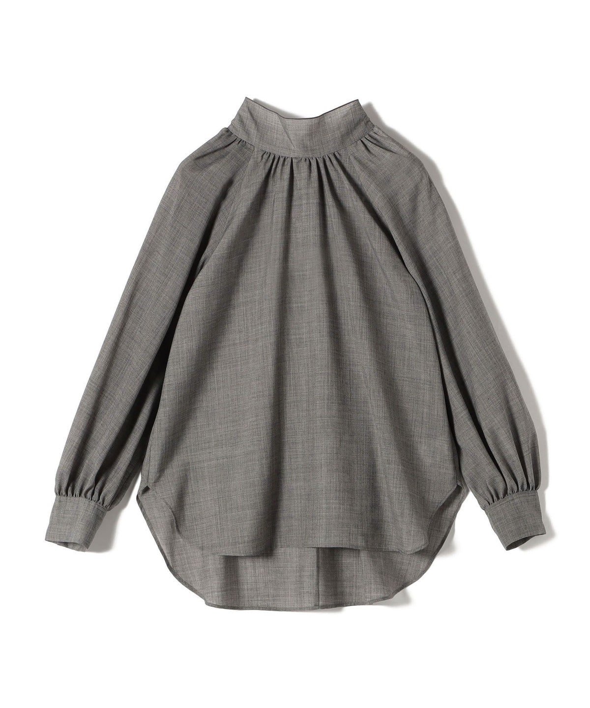 ラグランスリーブは肩回りを華奢に、ネックにたっぷり入れたギャザーは華やかな印象に見せてくれるデザインブラウス。