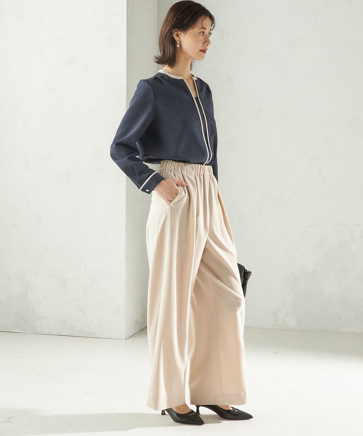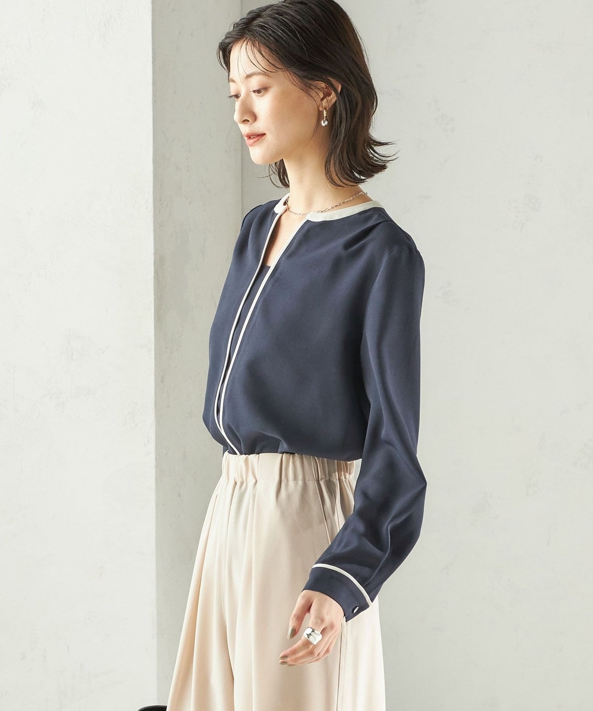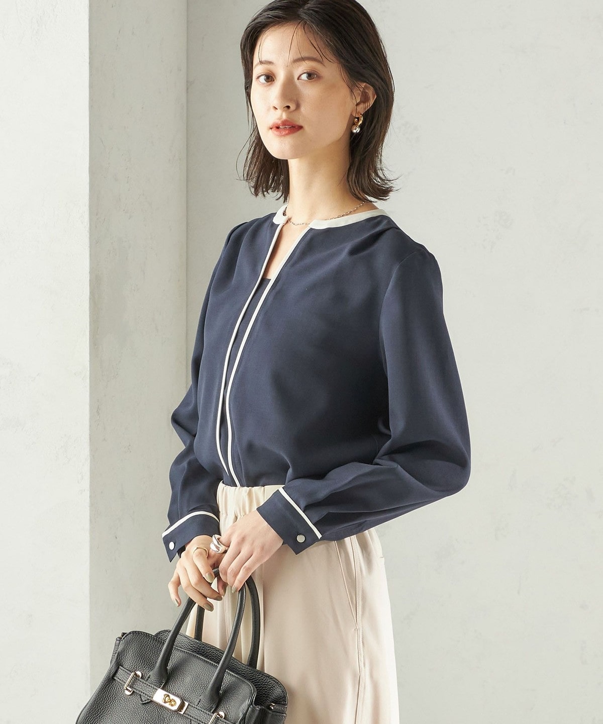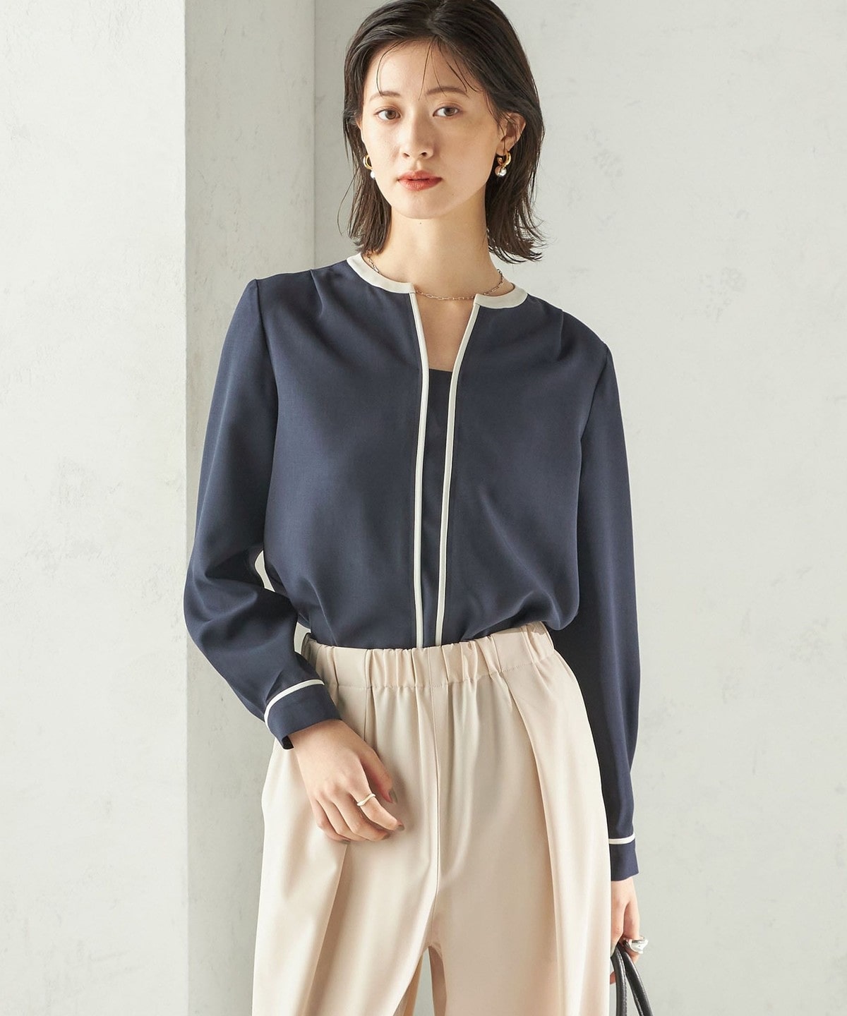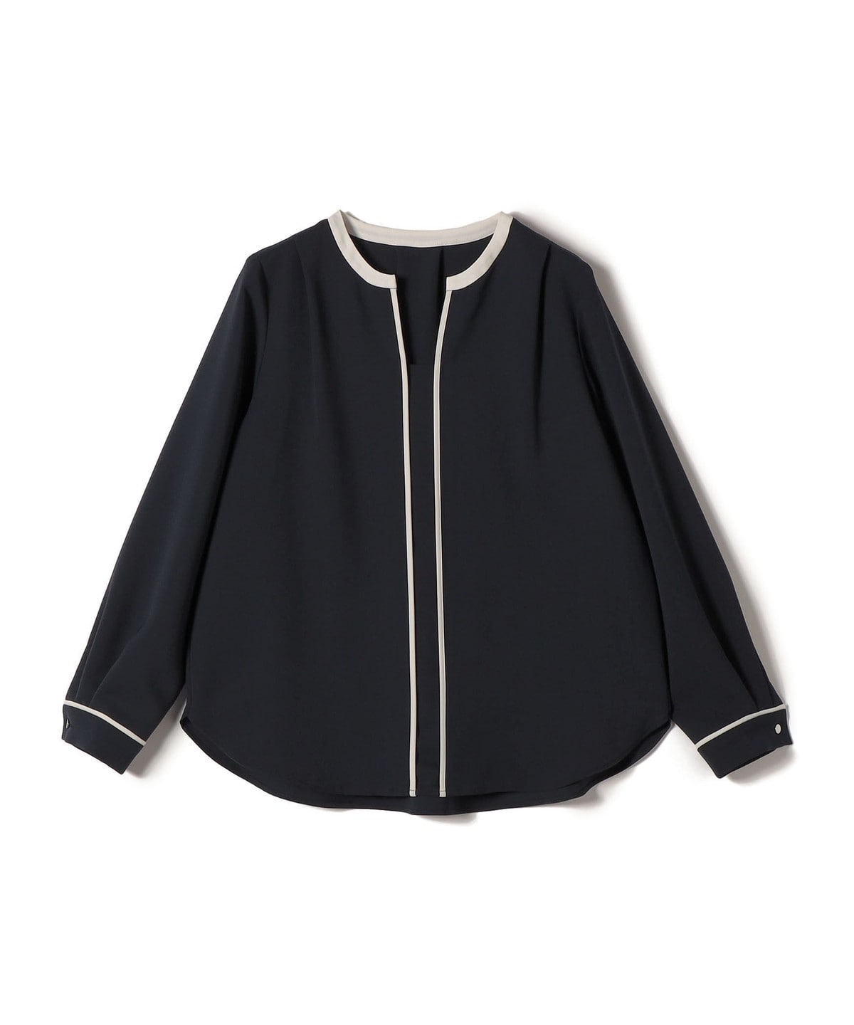 1. 〈手洗い可能〉配色 パイピング キーネック 長袖ブラウス ネイビー