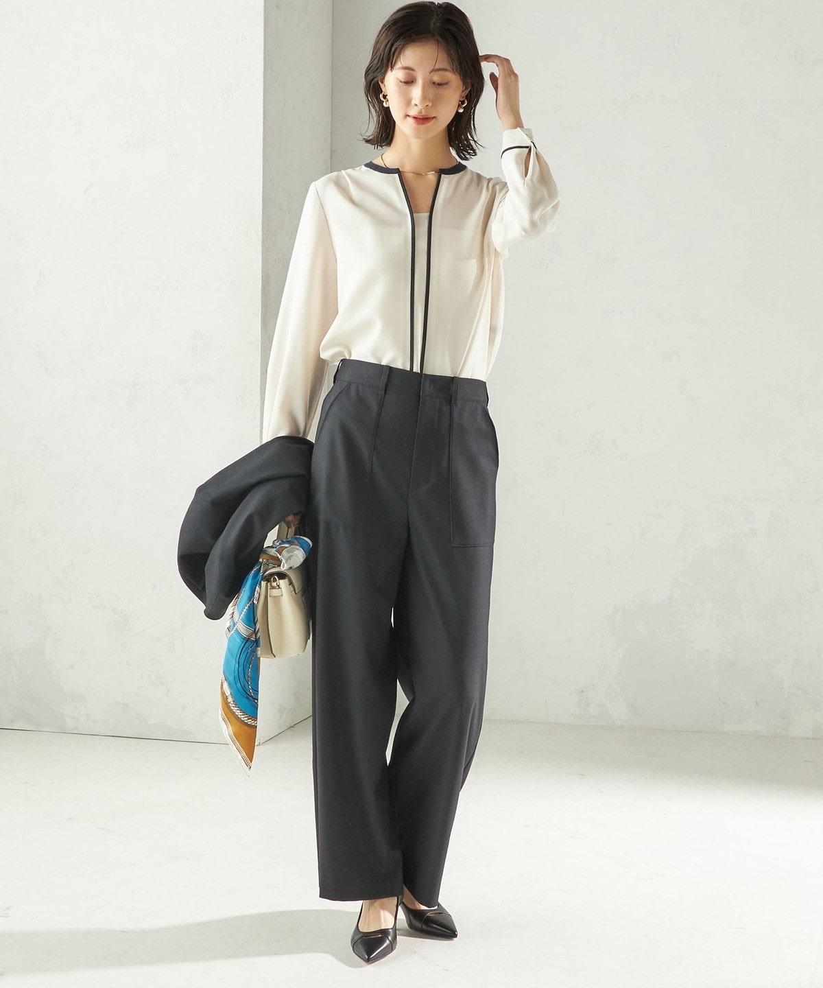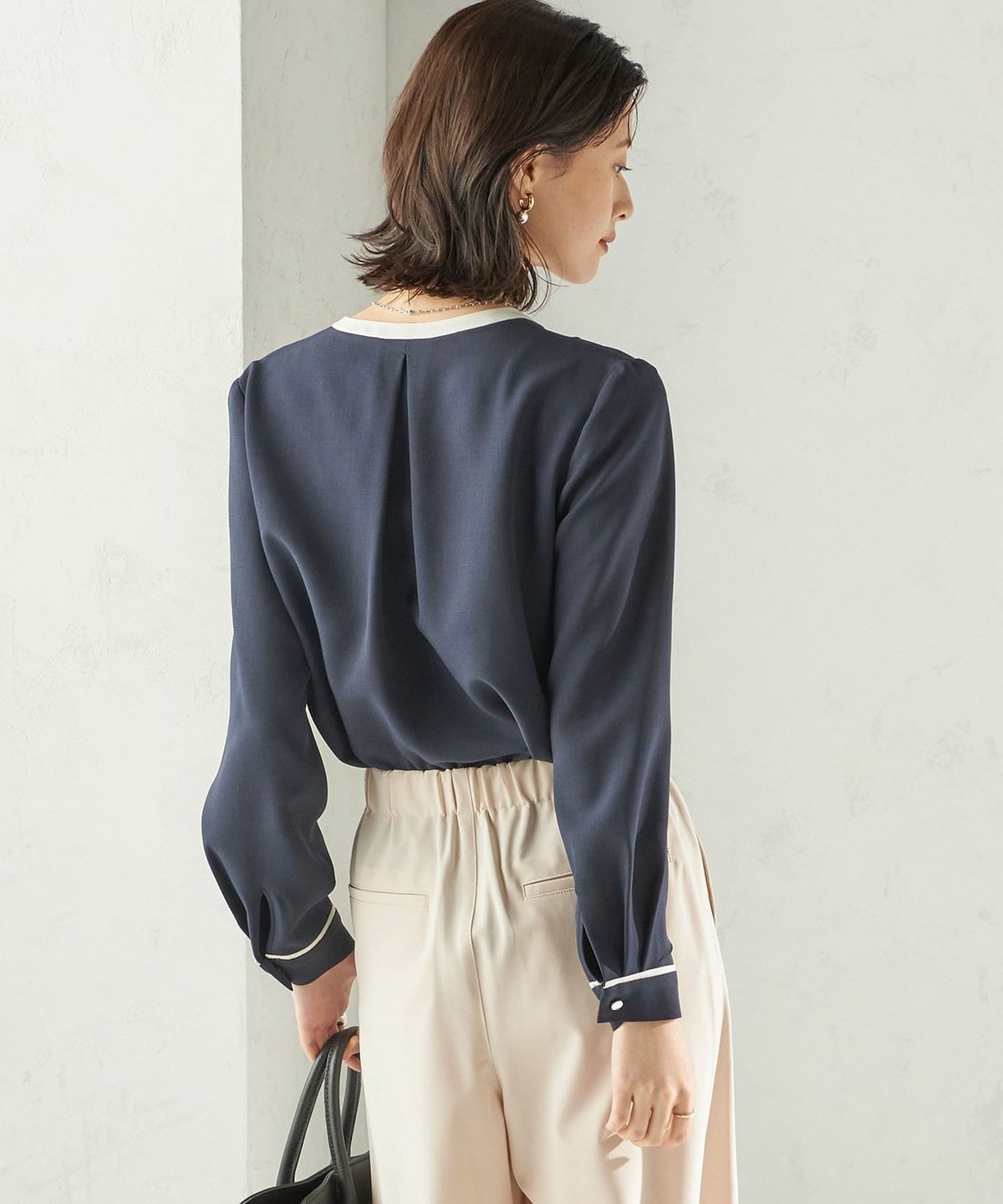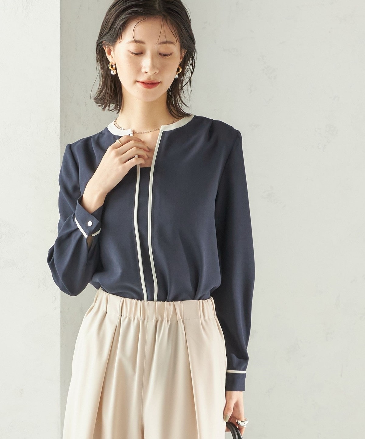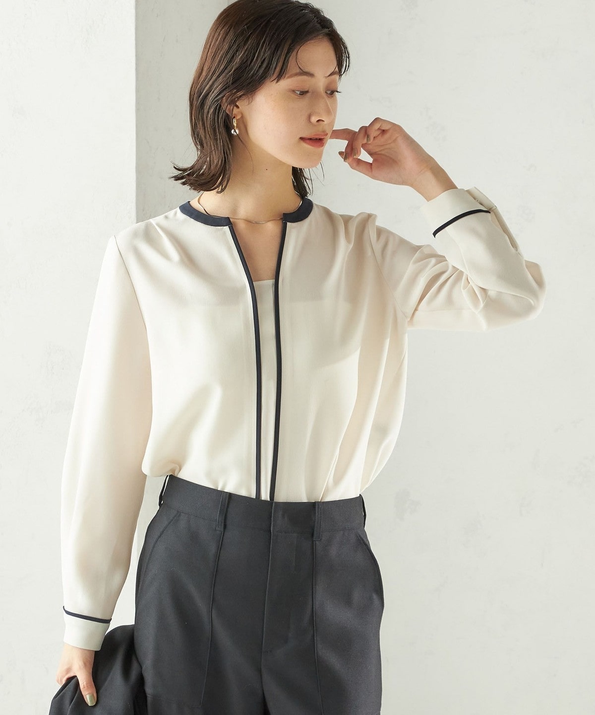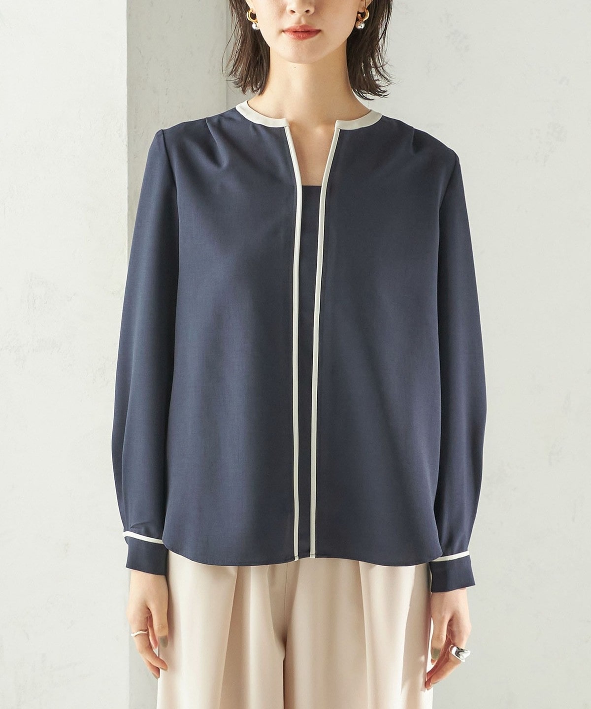 5. 〈手洗い可能〉配色 パイピング キーネック 長袖ブラウス