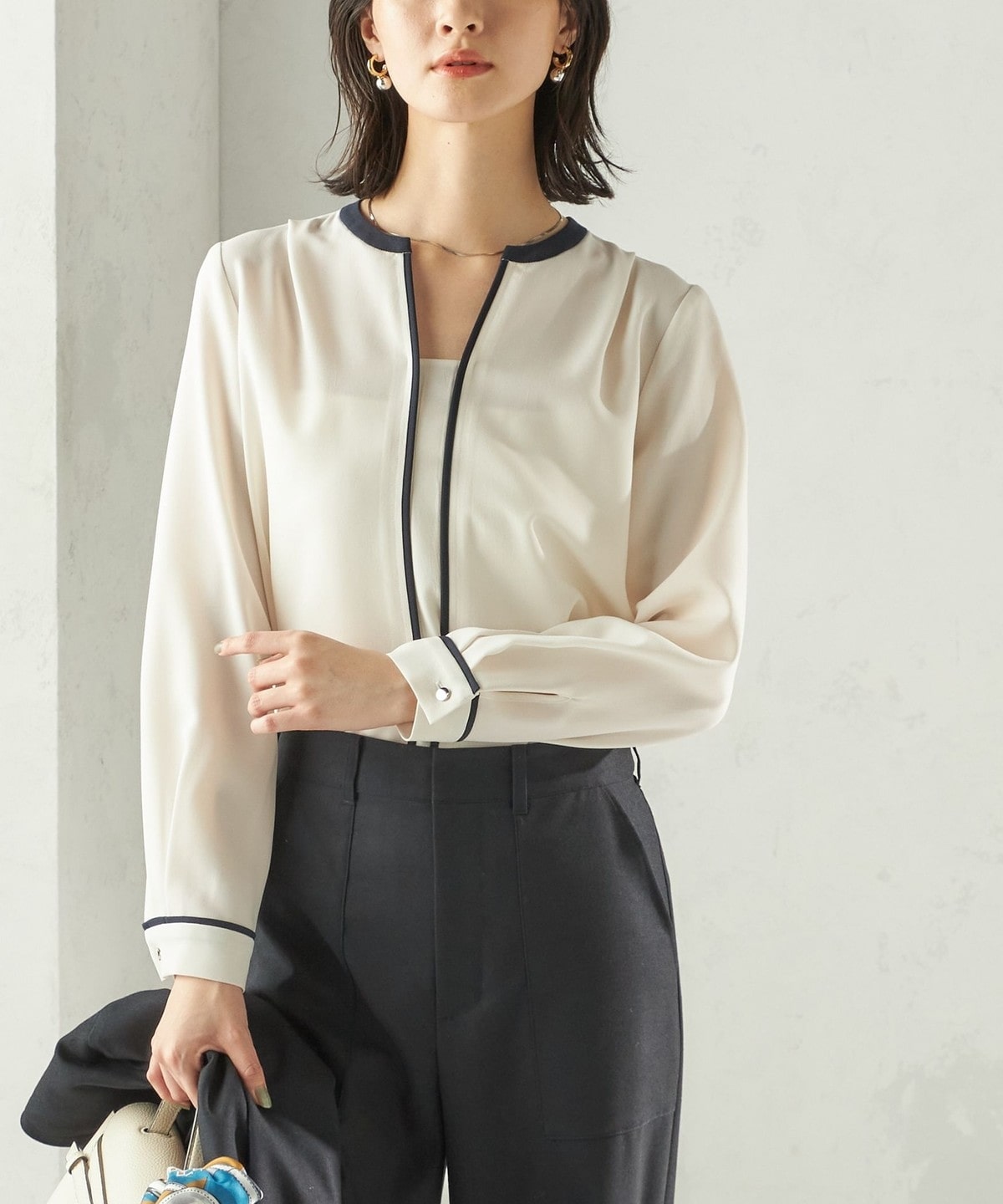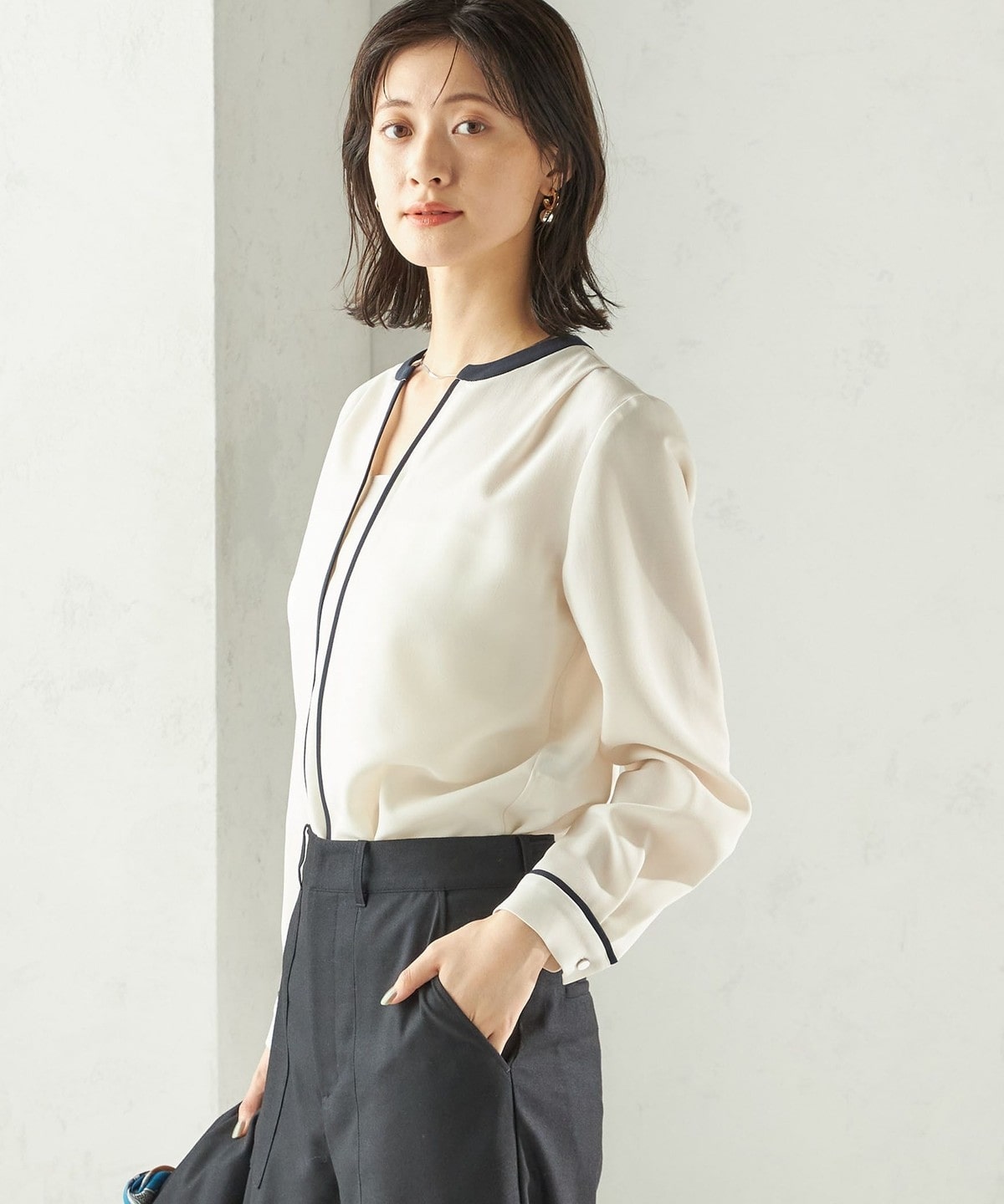 9. 〈手洗い可能〉配色 パイピング キーネック 長袖ブラウス