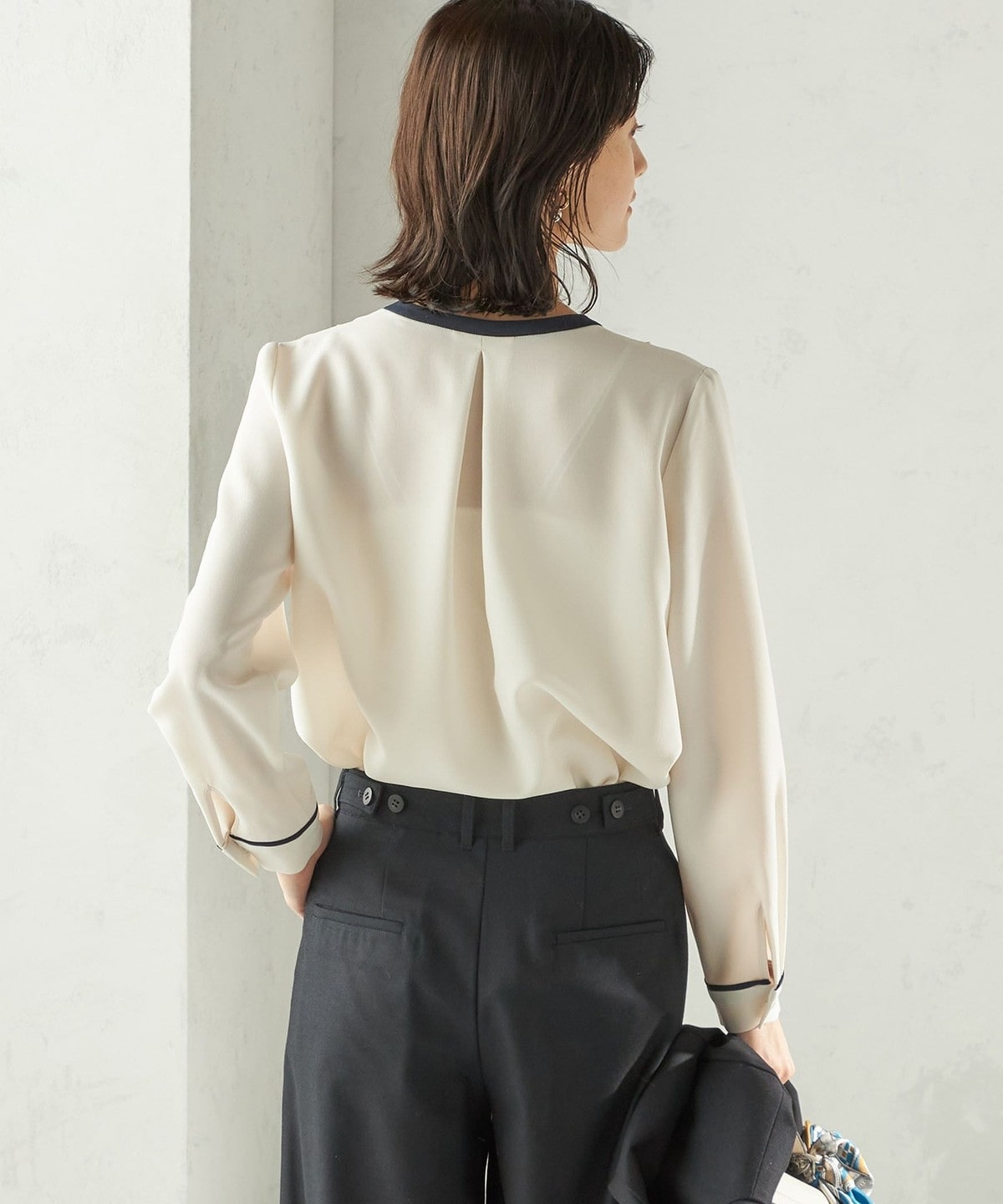 19. 〈手洗い可能〉配色 パイピング キーネック 長袖ブラウス