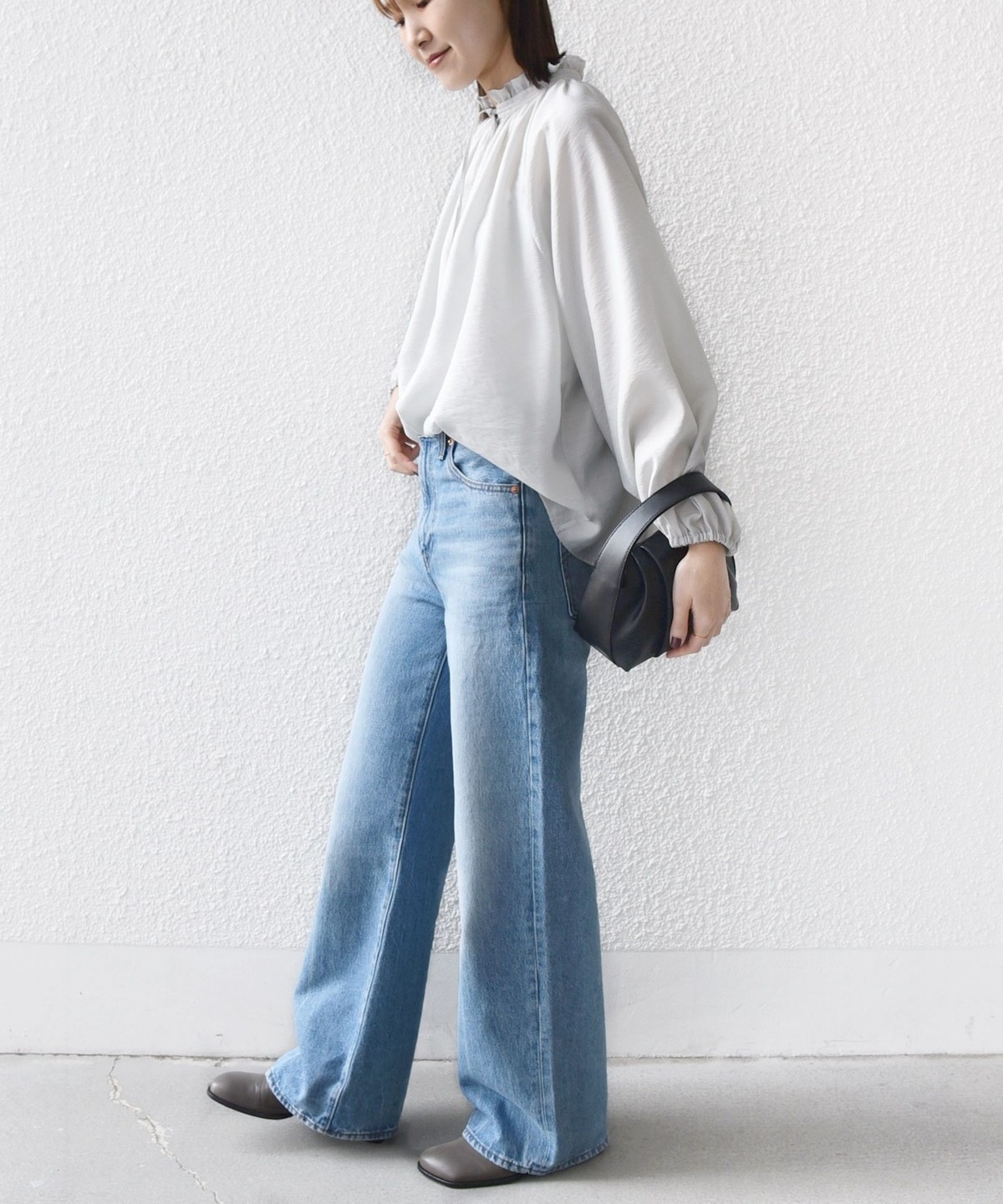 素材に少し表面感があるため、ぺらっと見えず高見えするブラウスです。