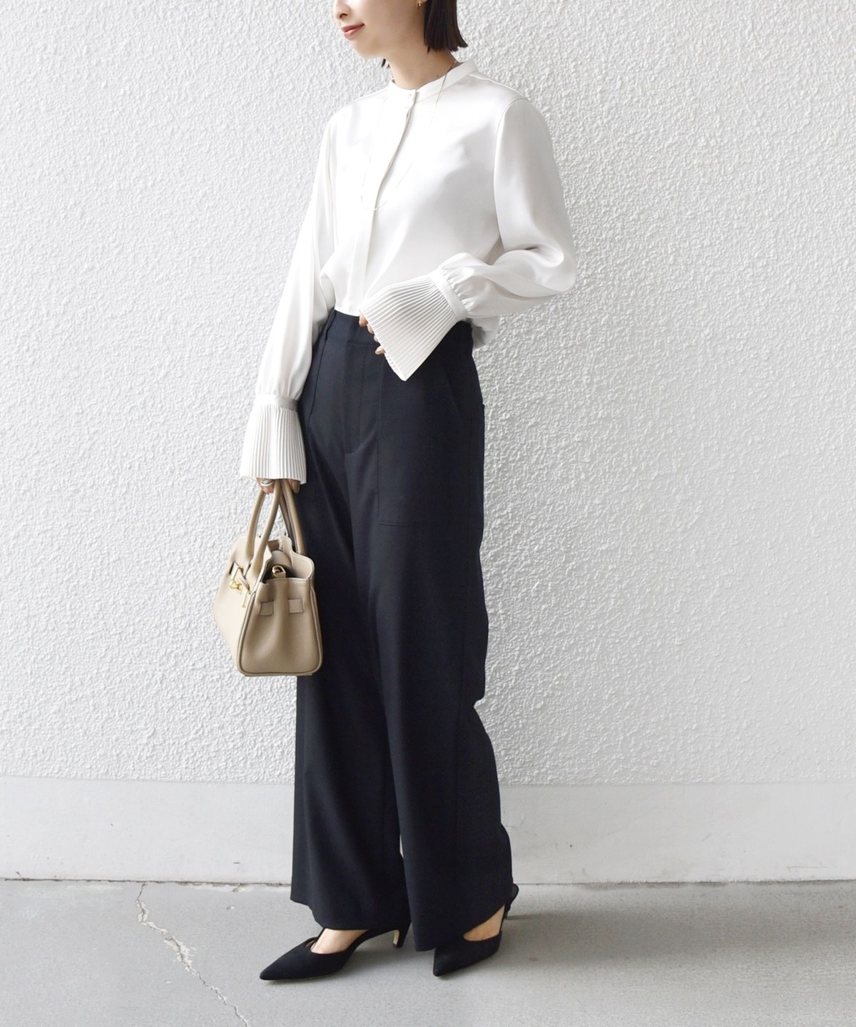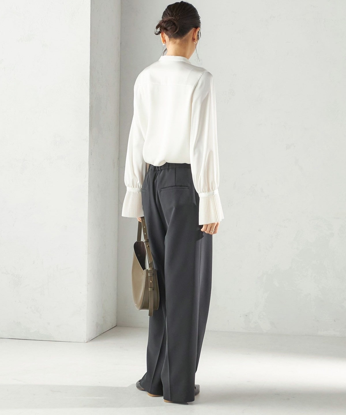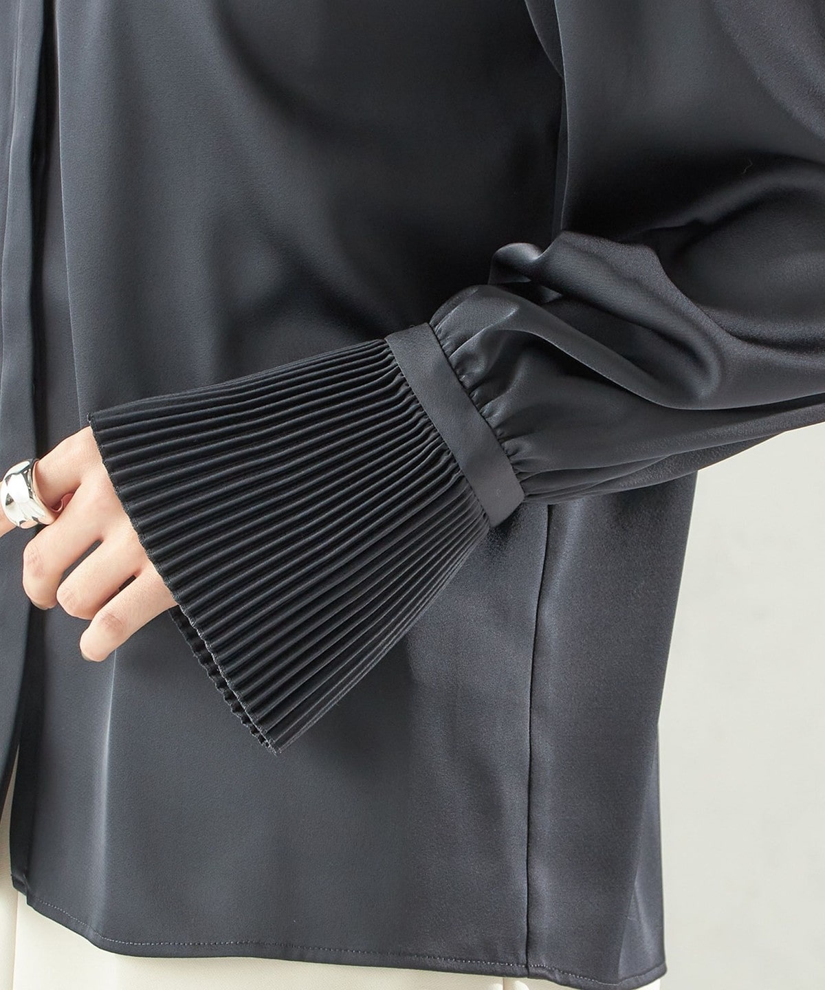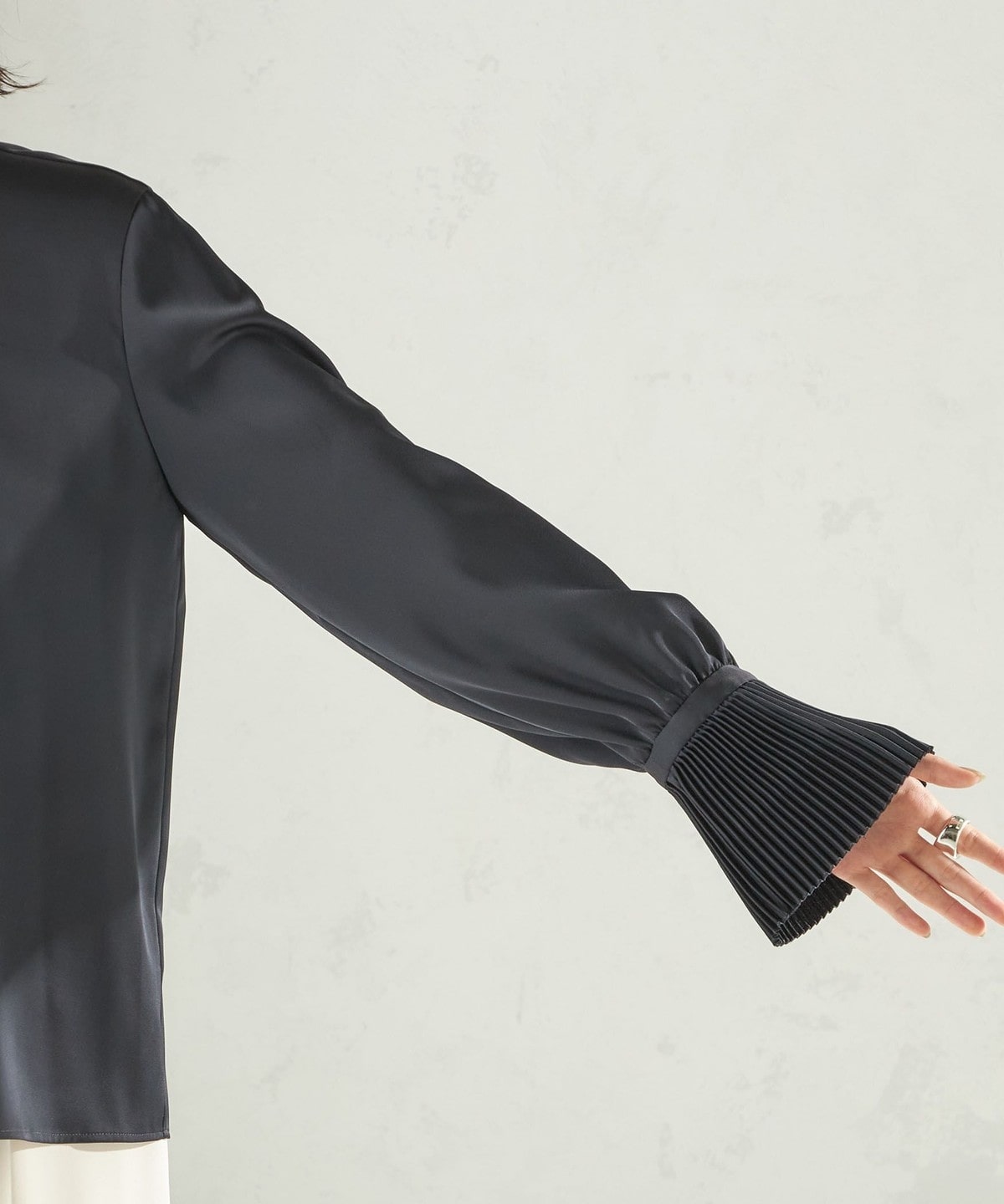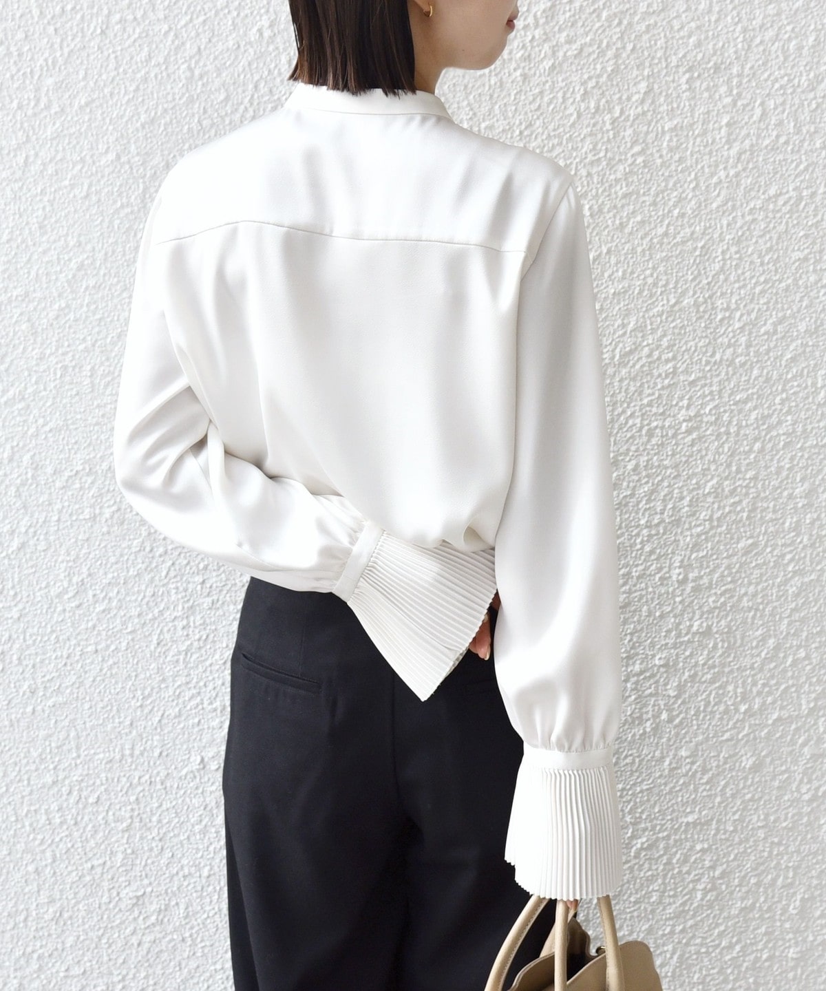 袖口の細やかなプリーツが動くたびに表情を生み、シンプルながらも印象的な一枚です。