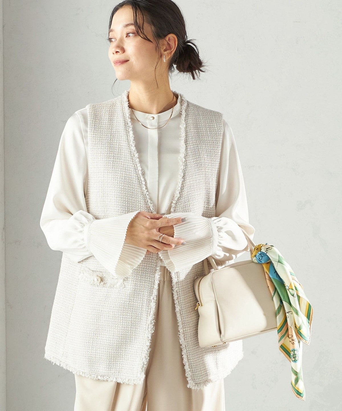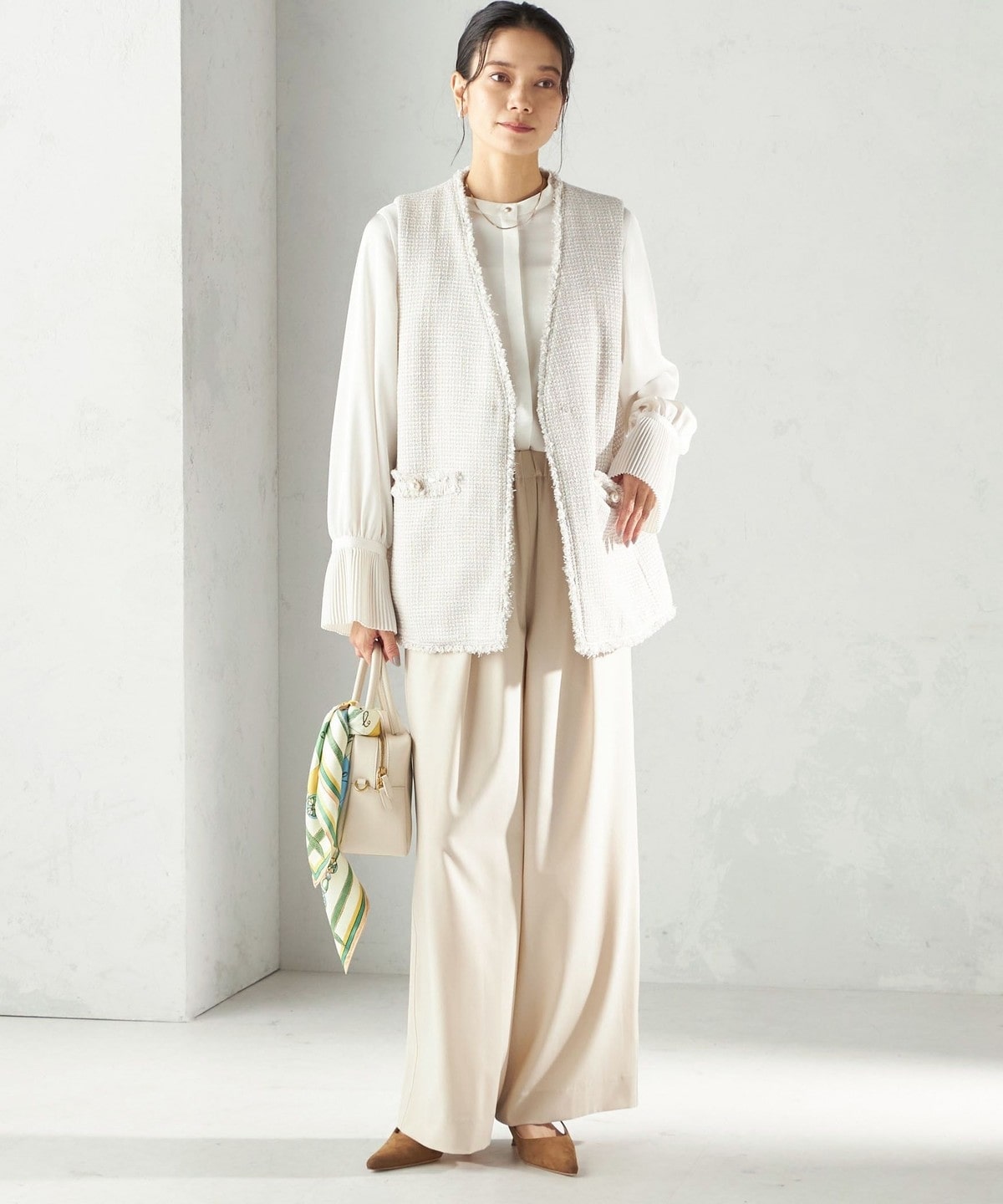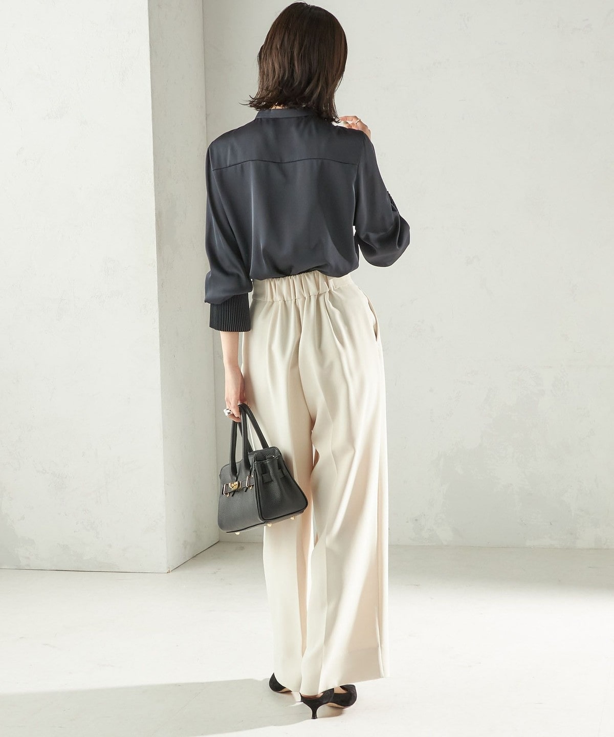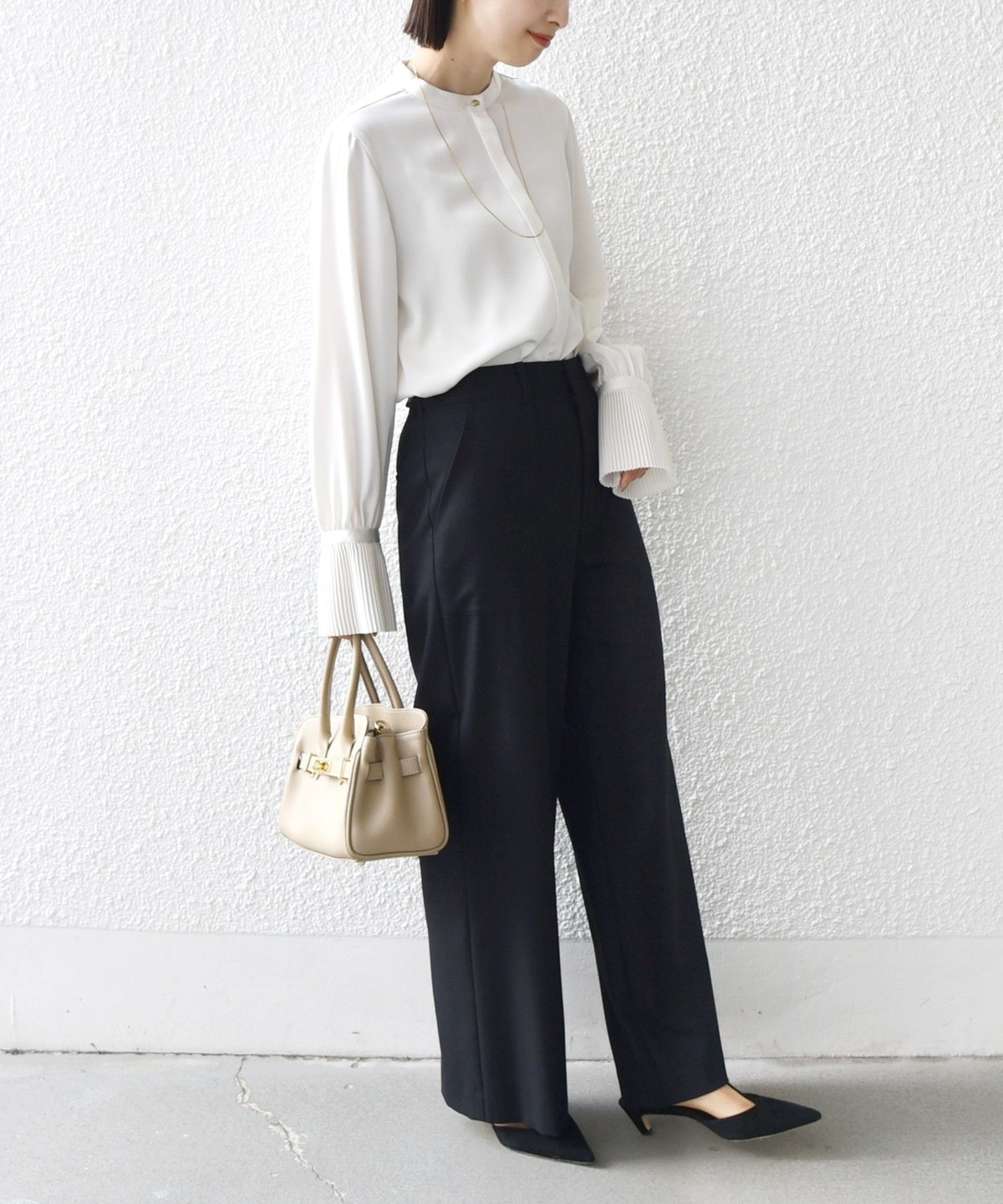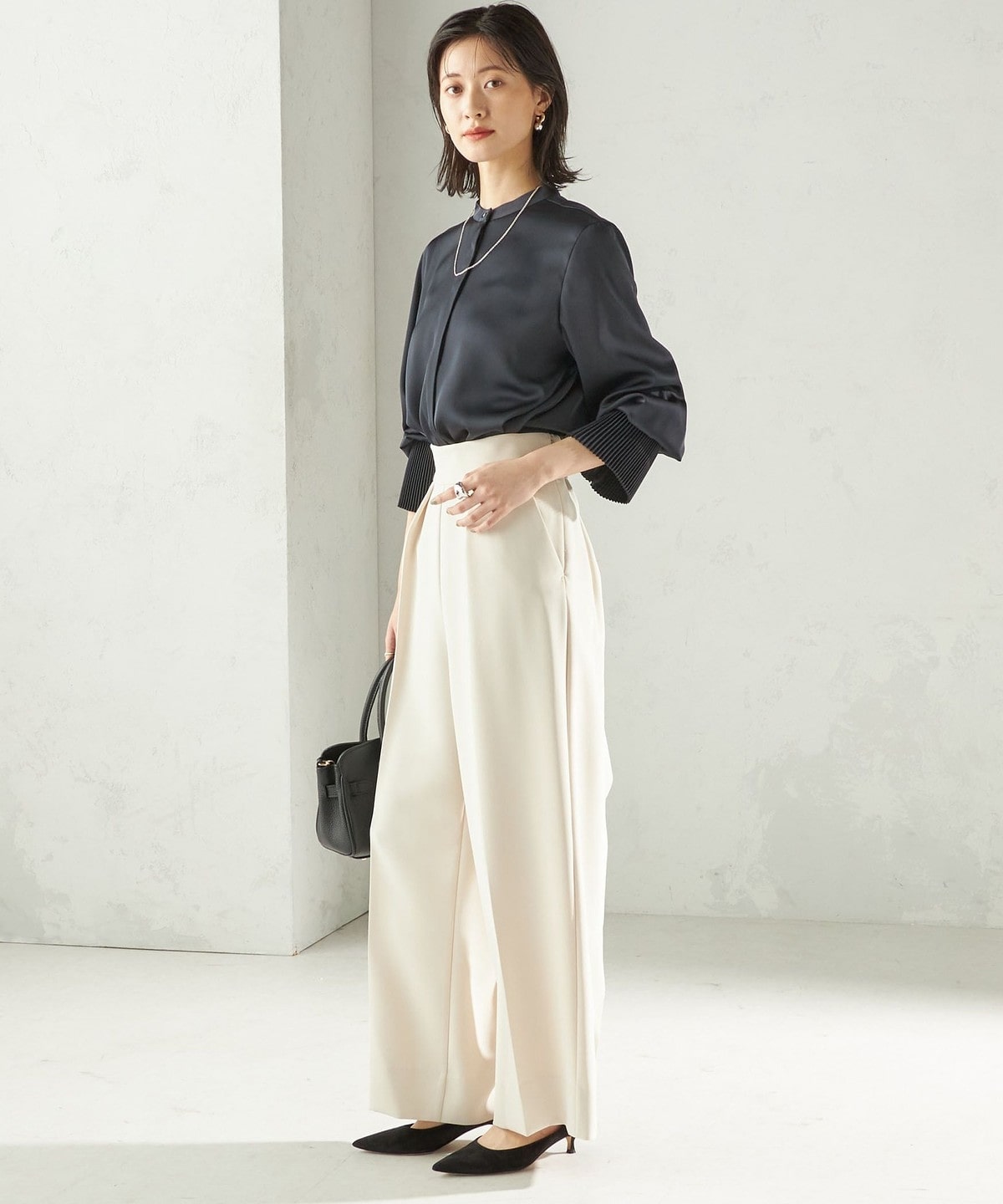 袖口の細やかなプリーツが動くたびに表情を生み、シンプルながらも印象的な一枚です。