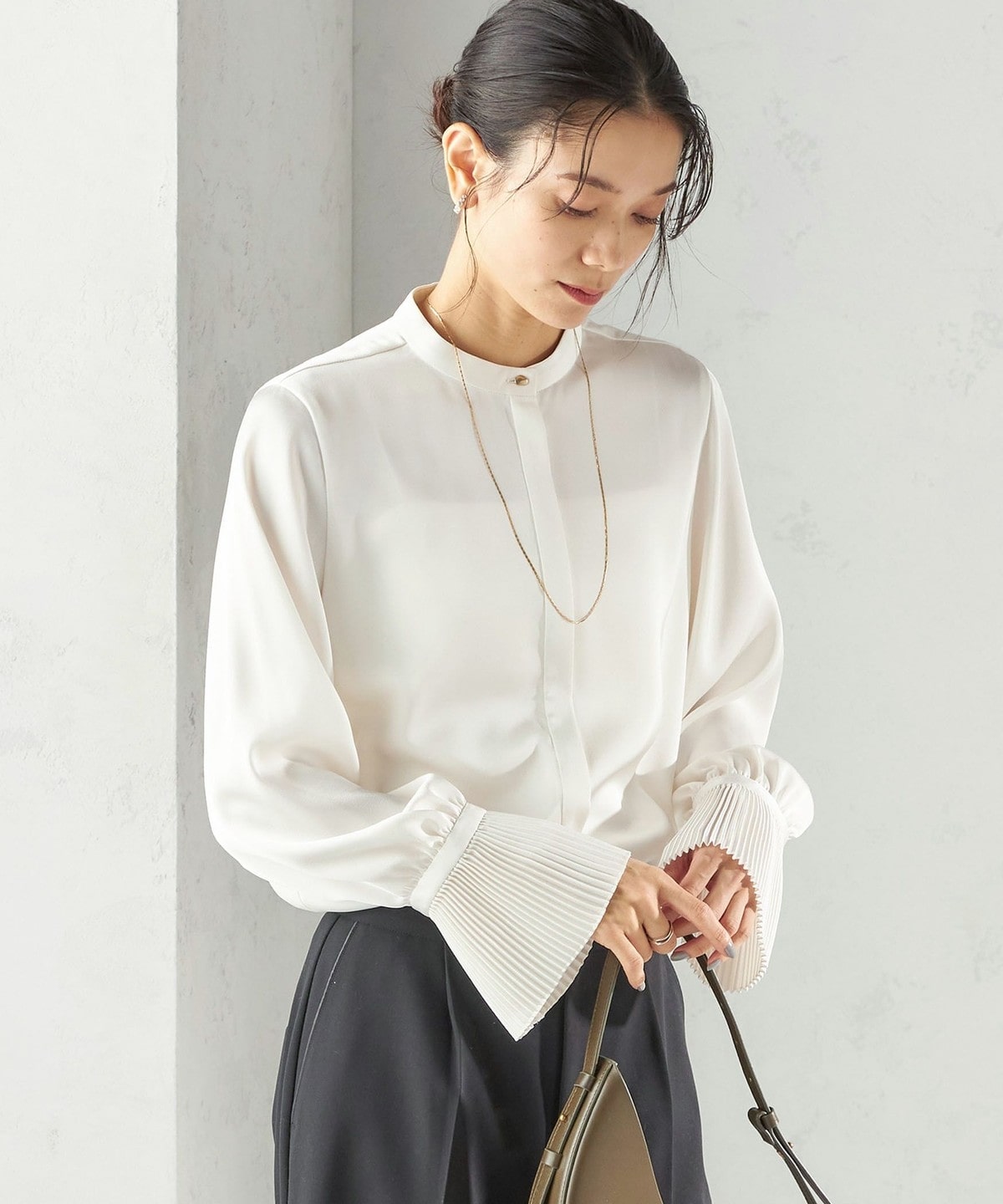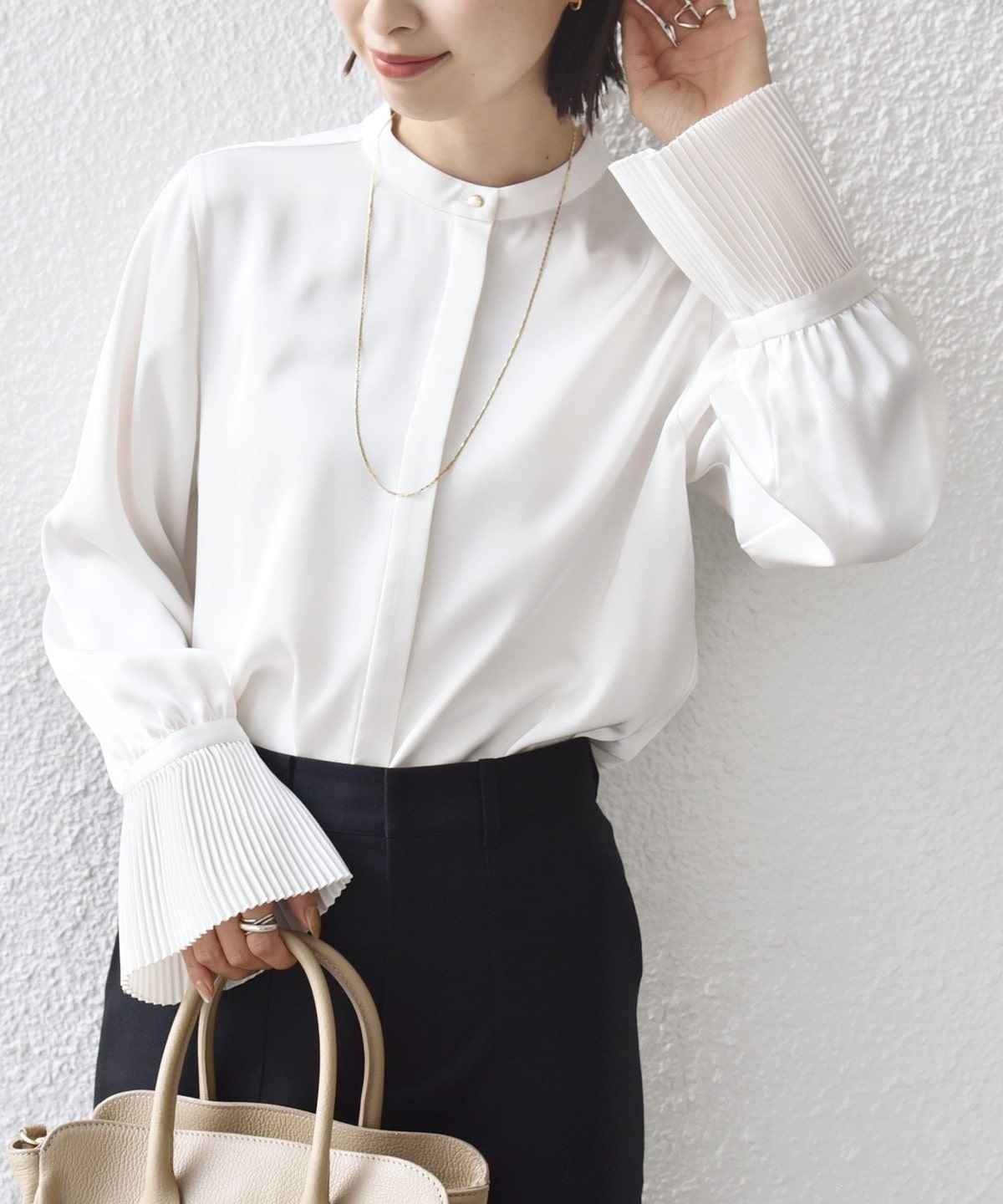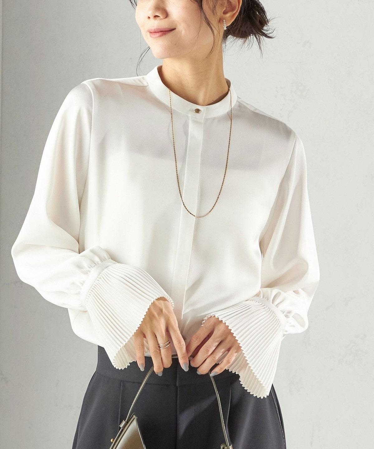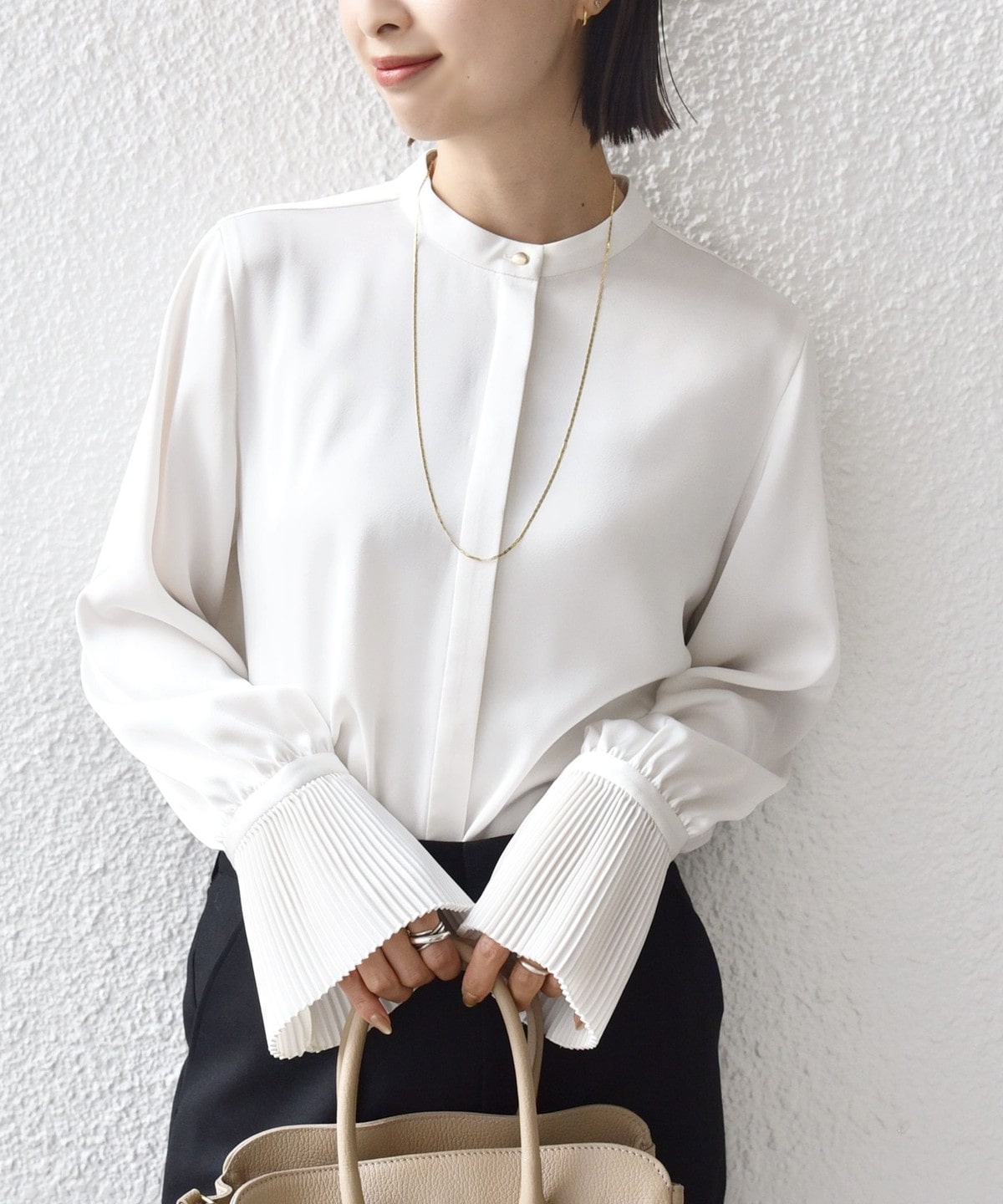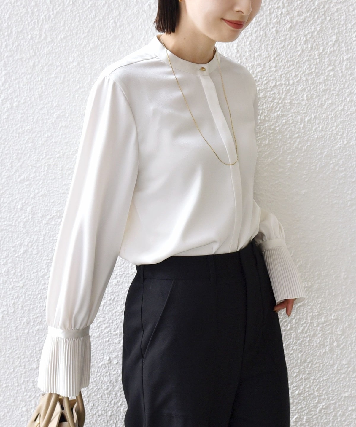 すっきりとしたバンドカラーネックのシャツデザインに袖口にプリーツフリルを施した、シャープでありながら女性らしさをプラスしたブラウス。