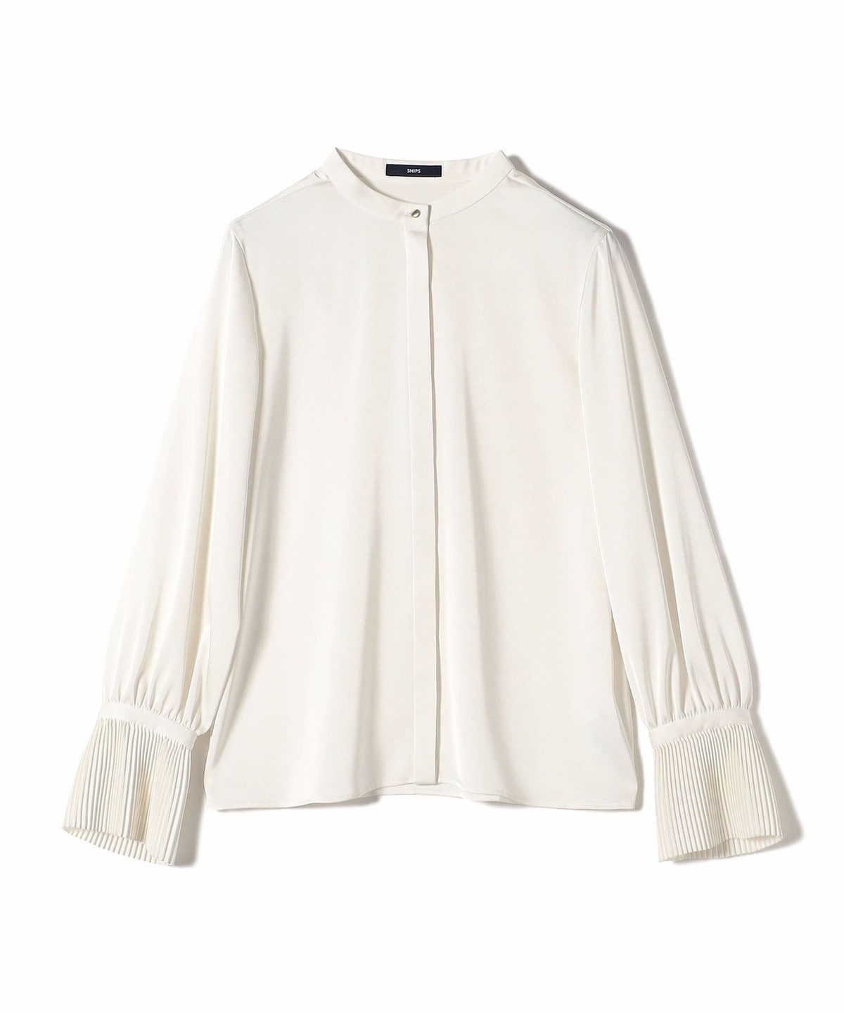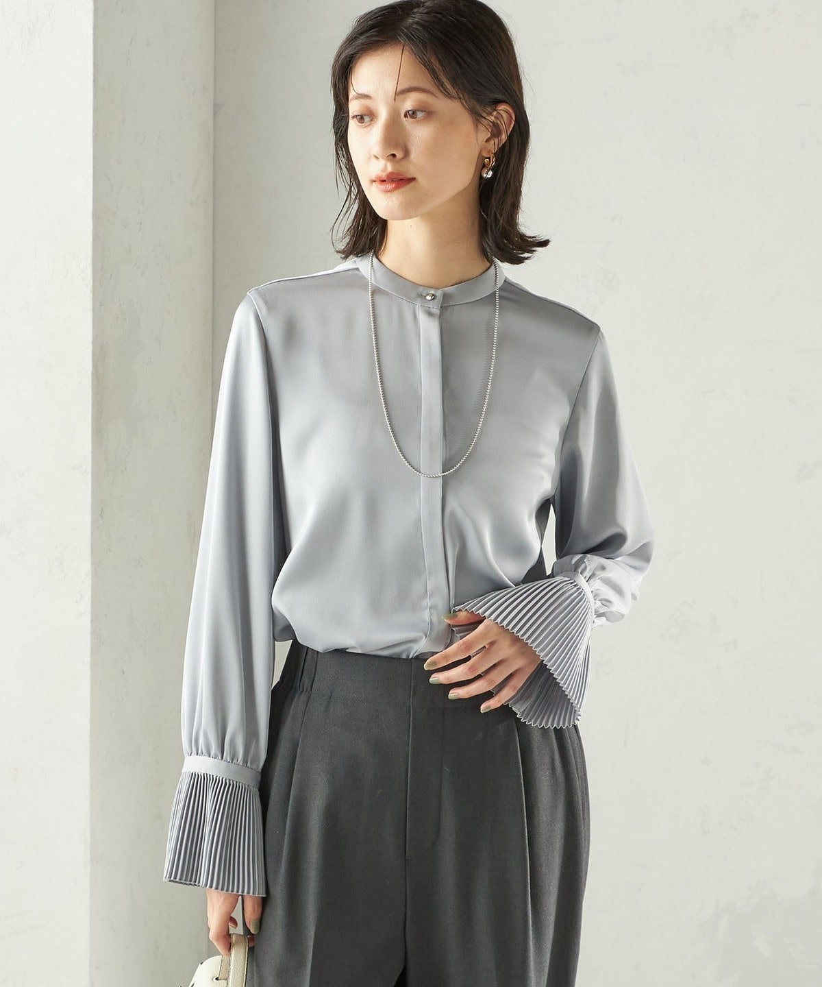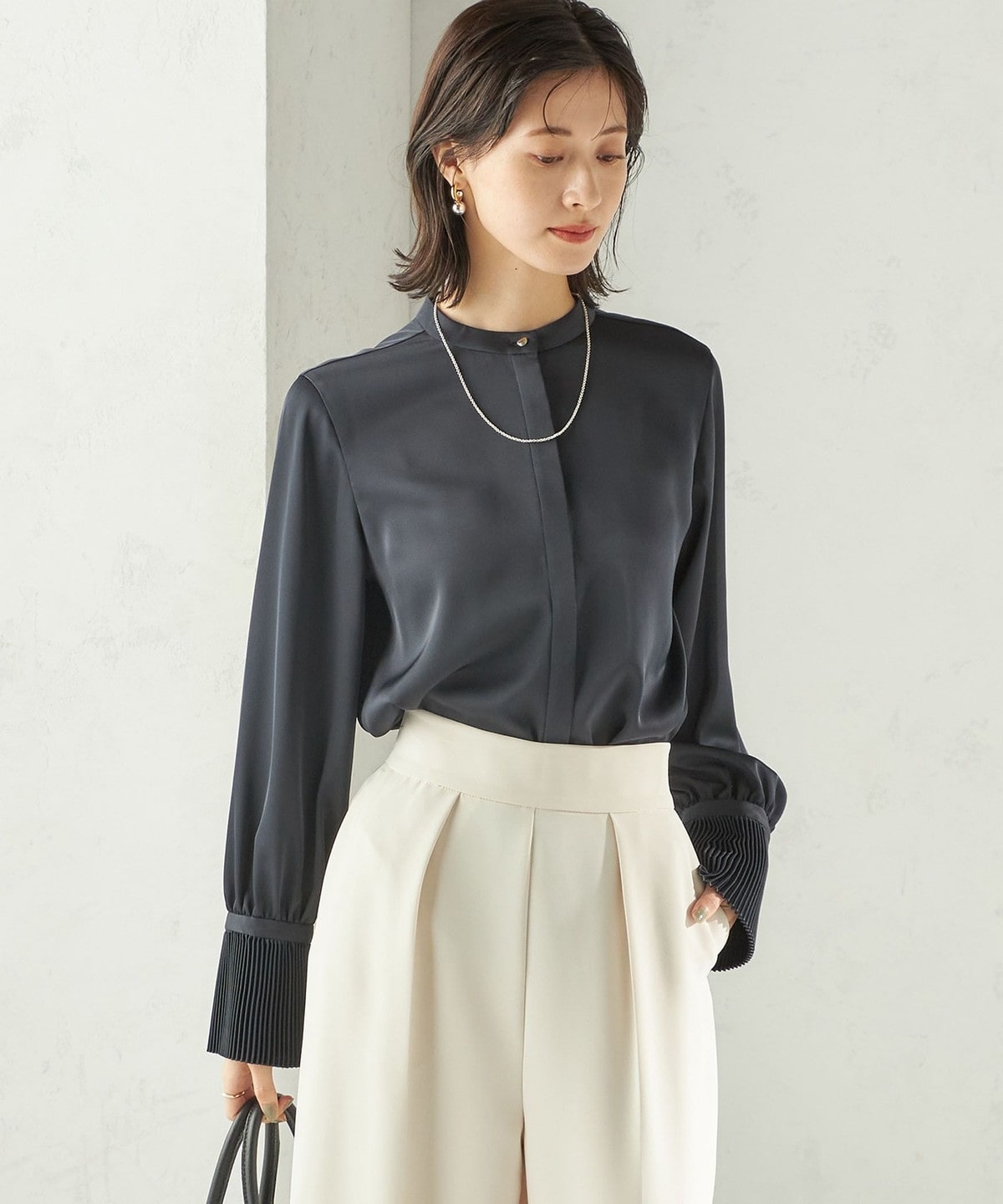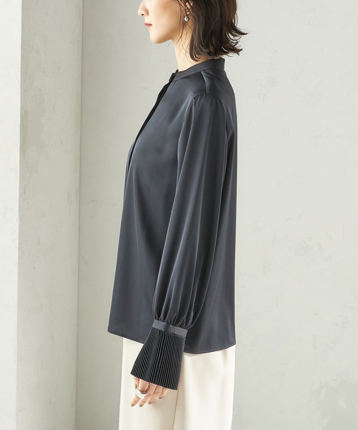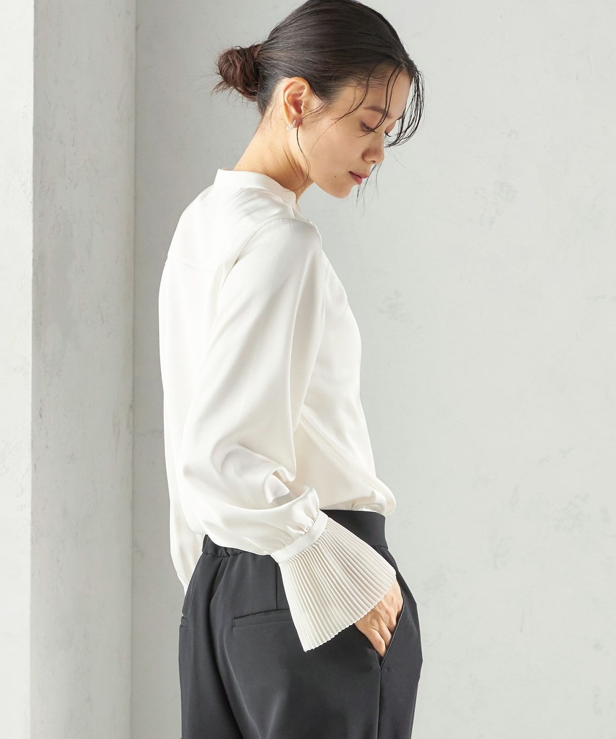 すっきりとしたバンドカラーネックのシャツデザインに袖口にプリーツフリルを施した、シャープでありながら女性らしさをプラスしたブラウス。