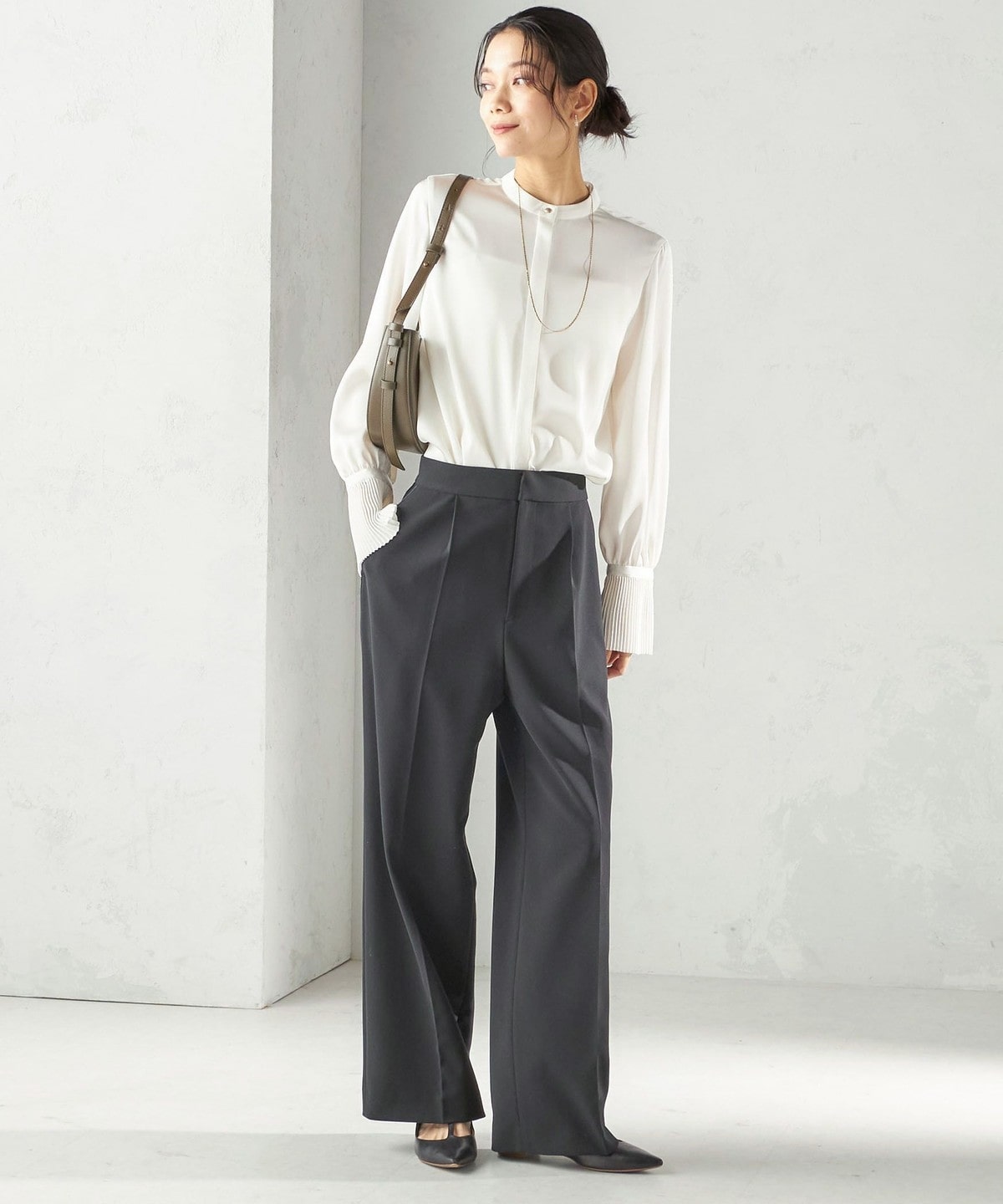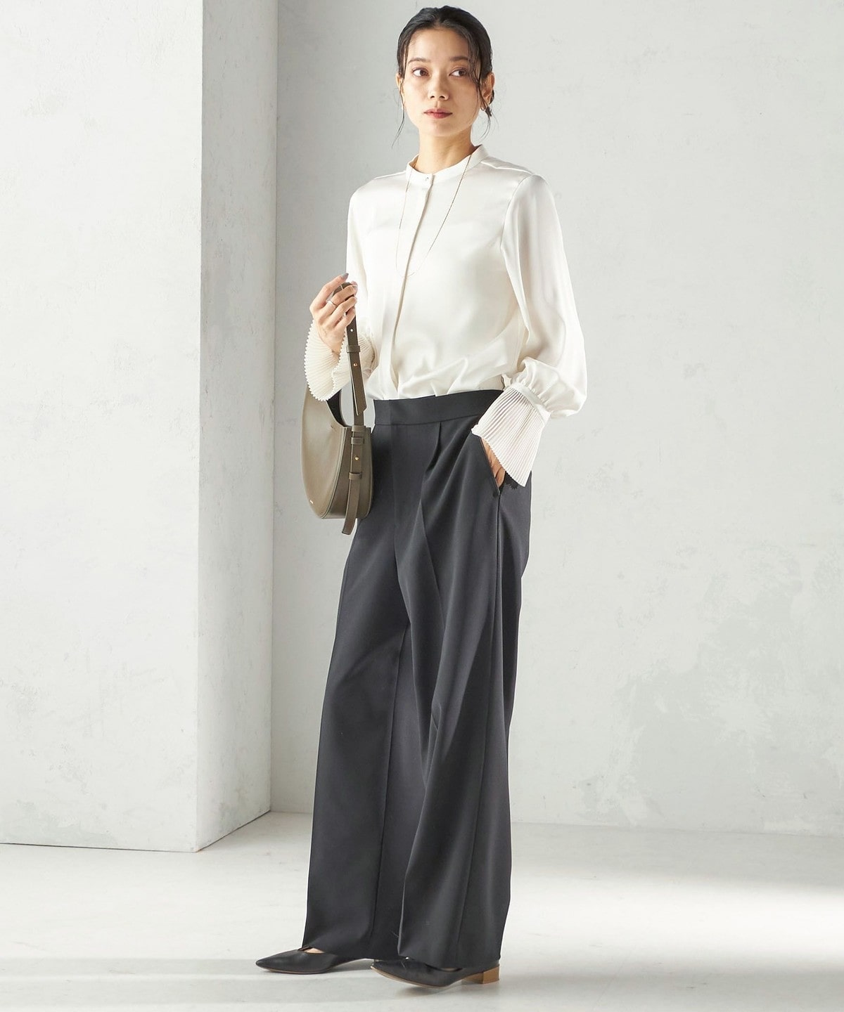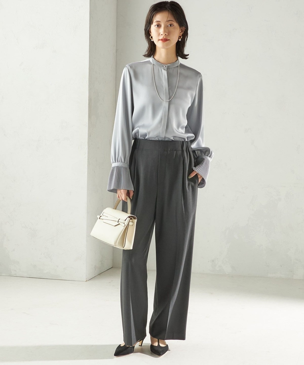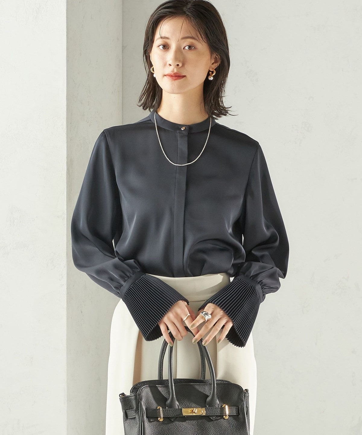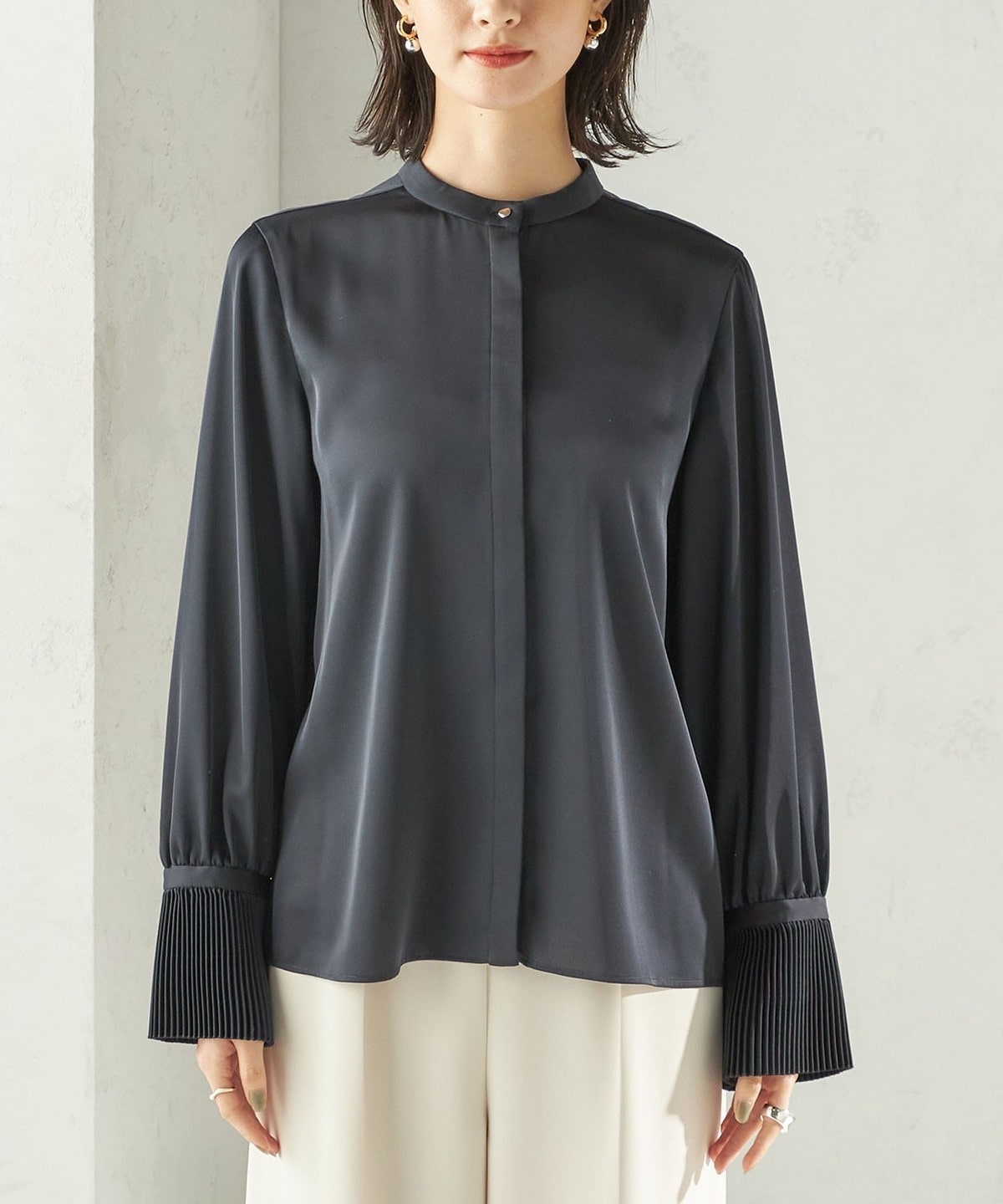 すっきりとしたバンドカラーネックのシャツデザインに袖口にプリーツフリルを施した、シャープでありながら女性らしさをプラスしたブラウス。