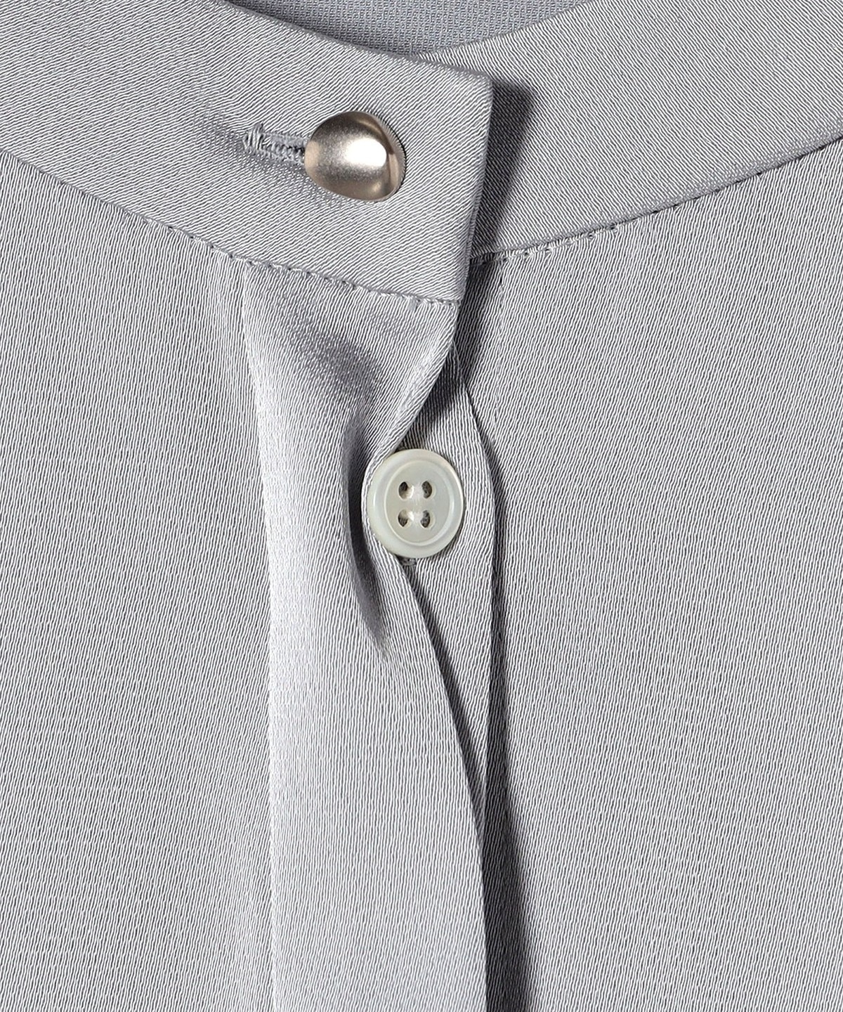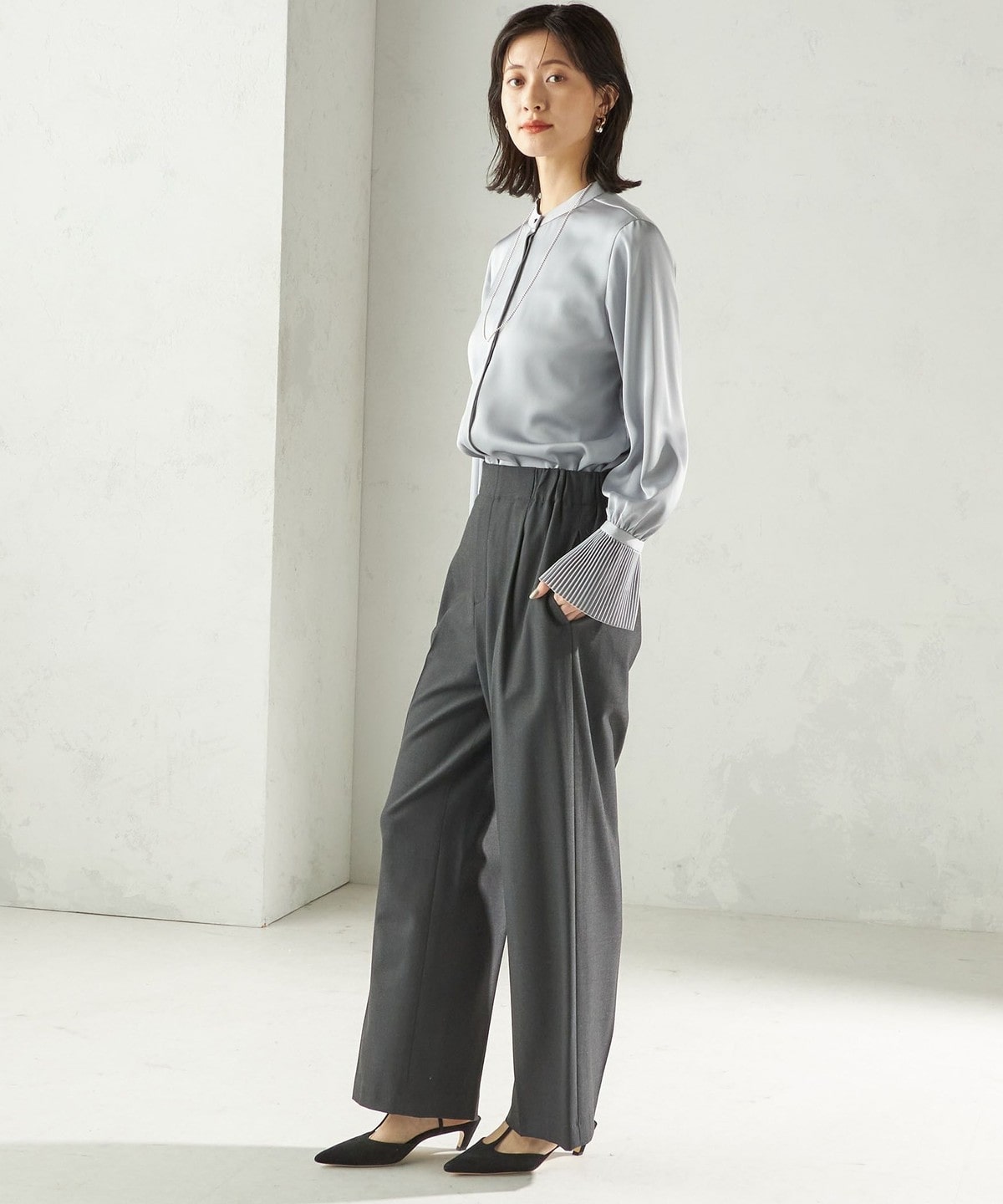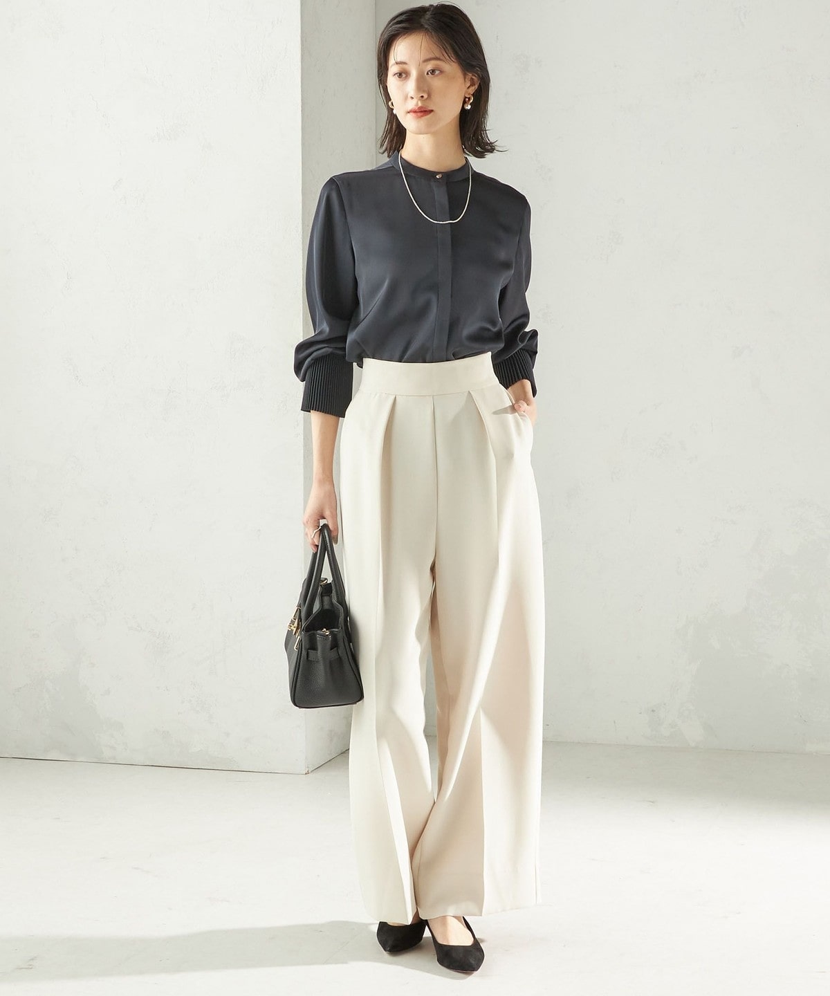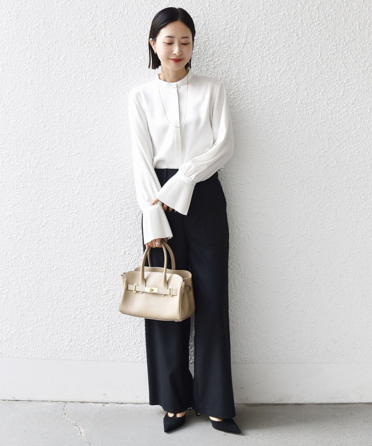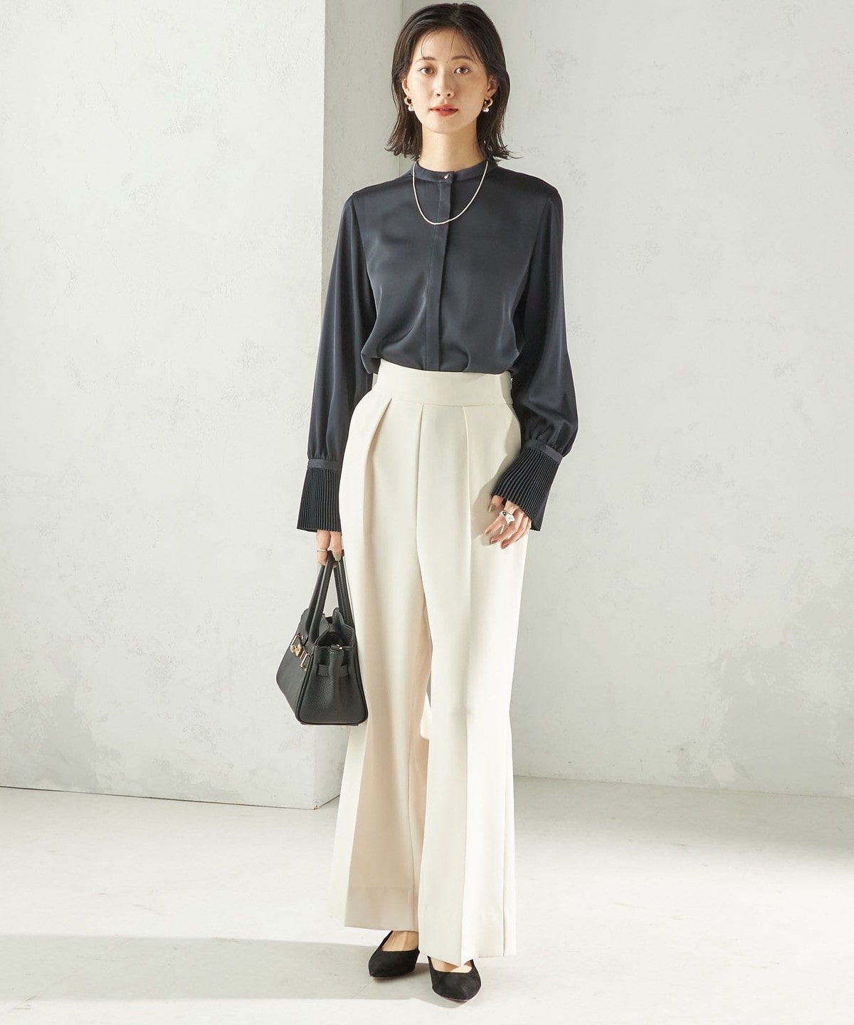 すっきりとしたバンドカラーネックのシャツデザインに袖口にプリーツフリルを施した、シャープでありながら女性らしさをプラスしたブラウス。