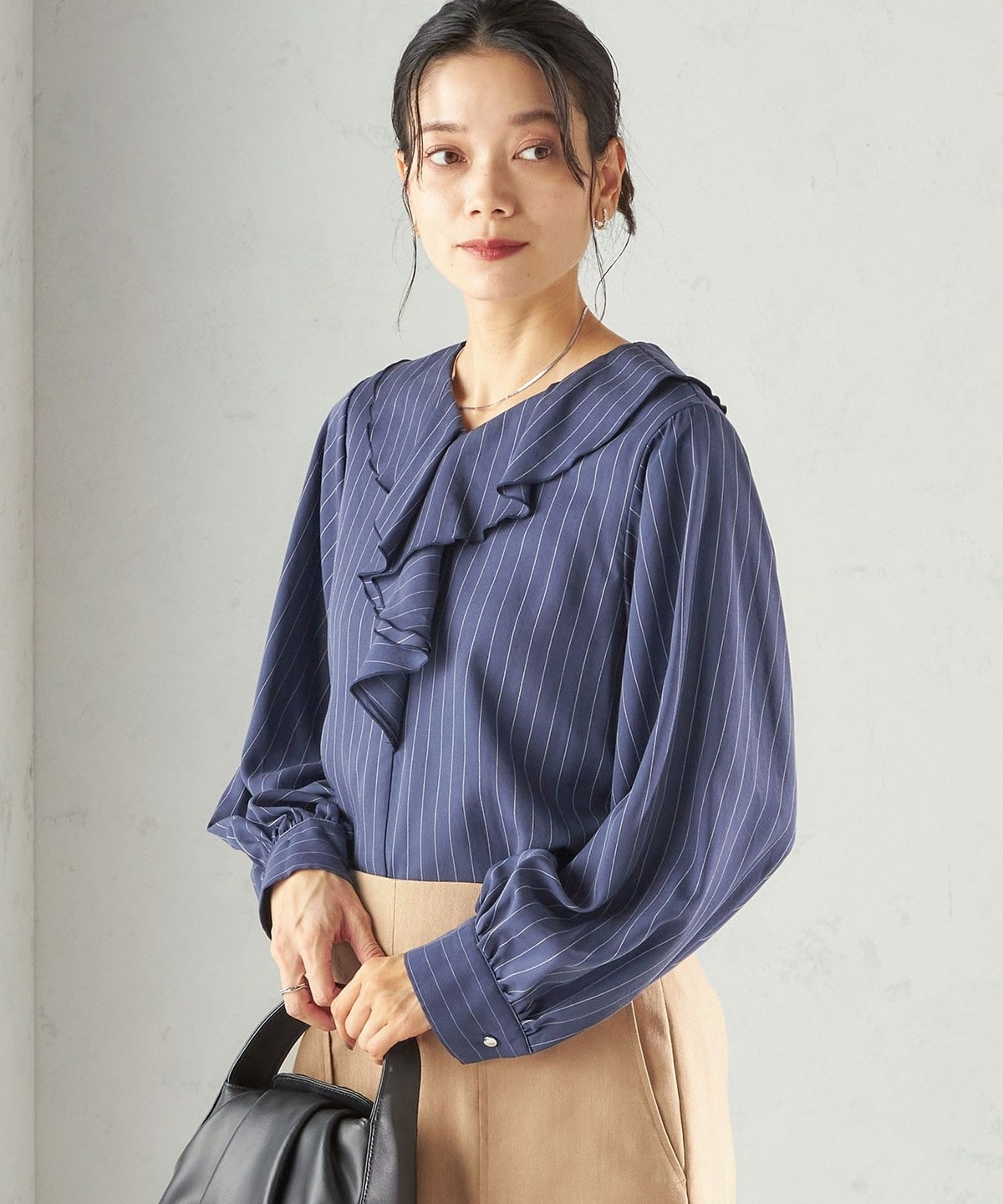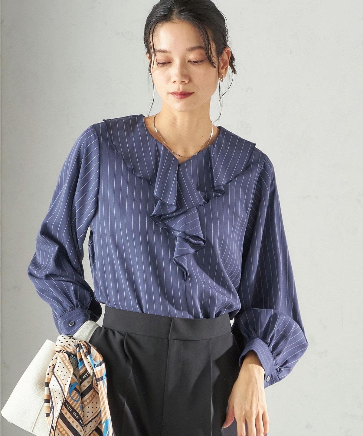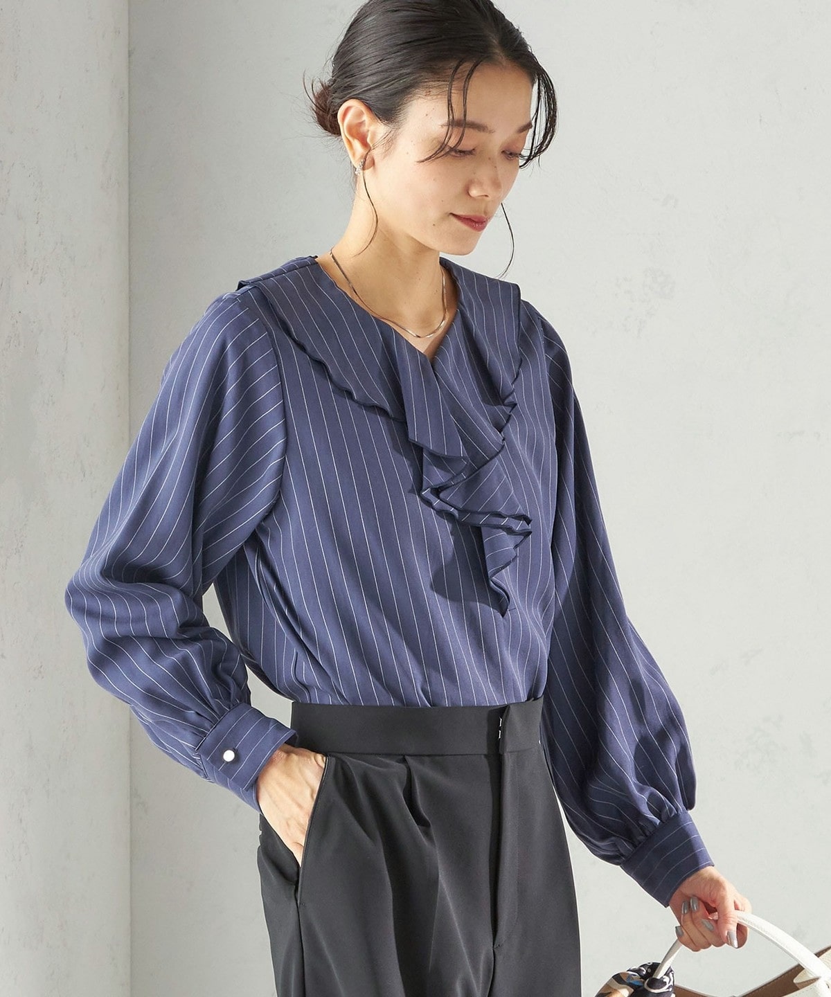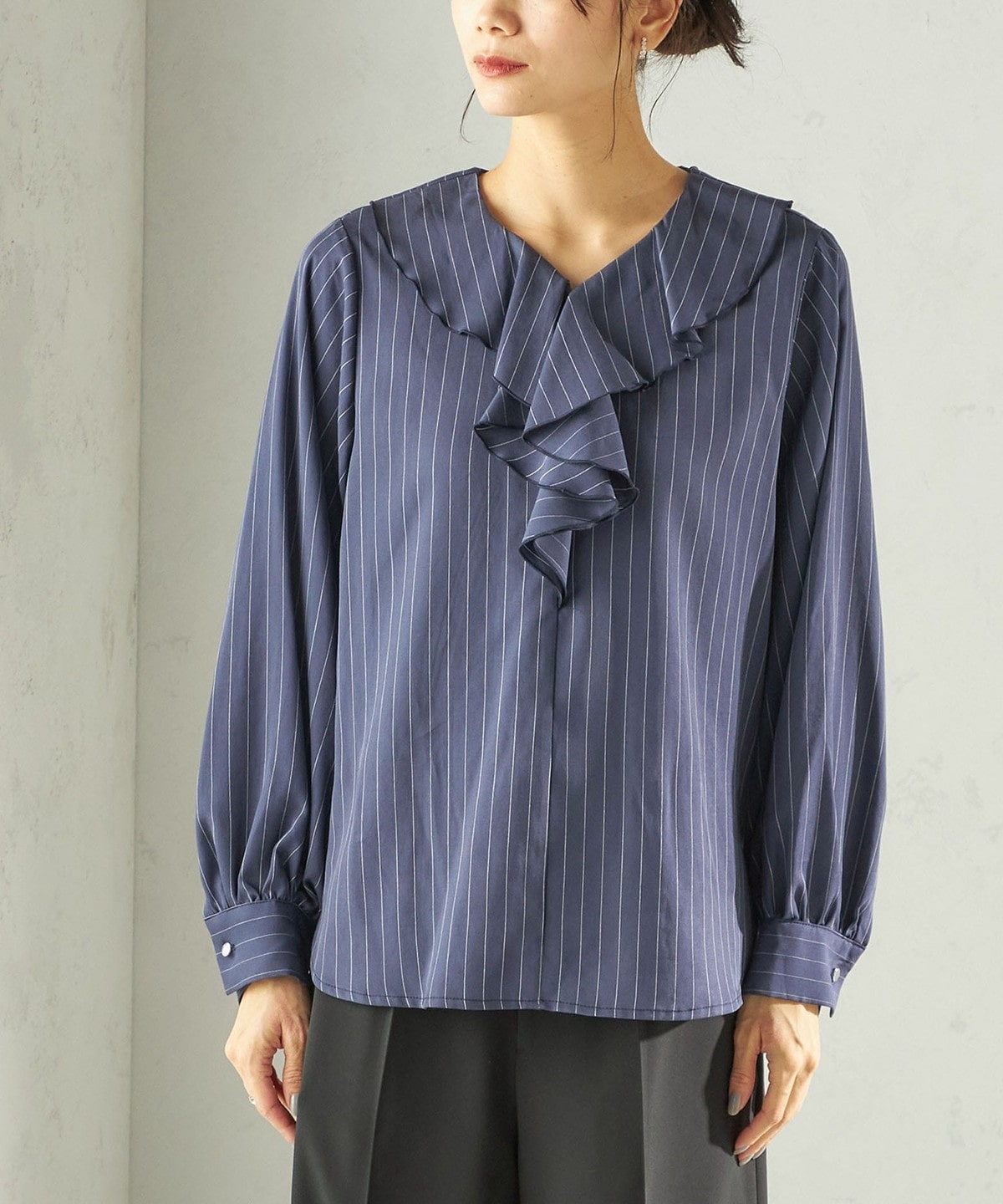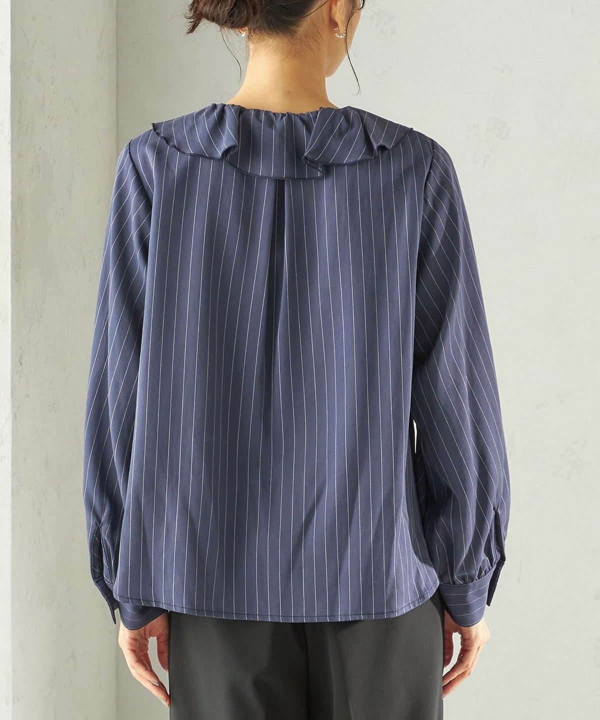 1. 《予約》〈手洗い可能〉フィブリル ストライプ フリル カラー ブラウス ネイビー