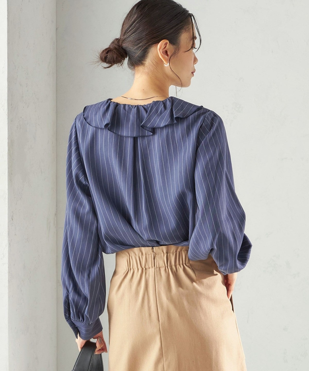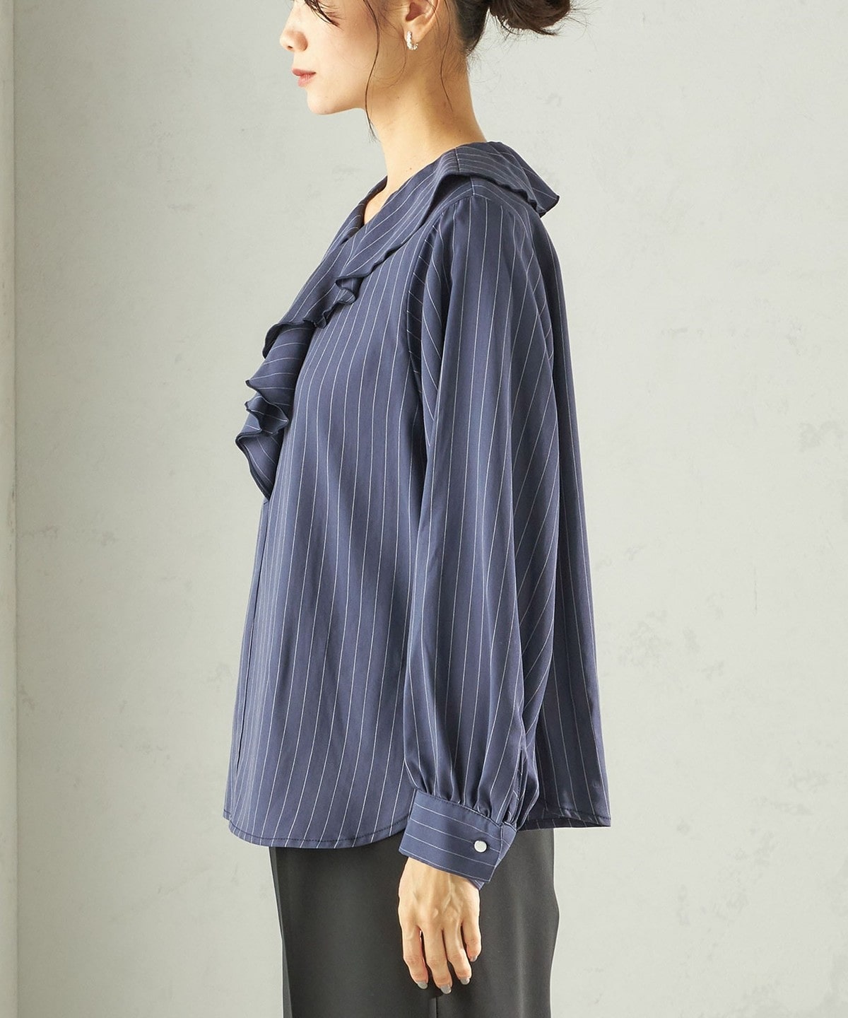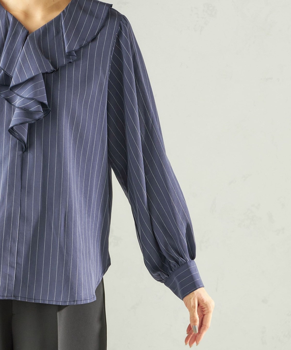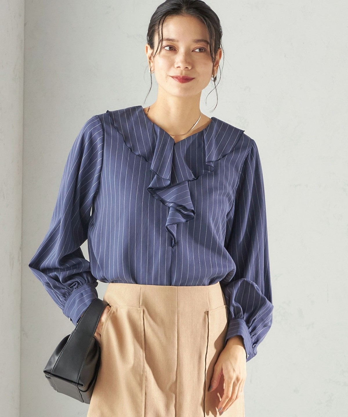 1. 《予約》〈手洗い可能〉フィブリル ストライプ フリル カラー ブラウス ネイビー