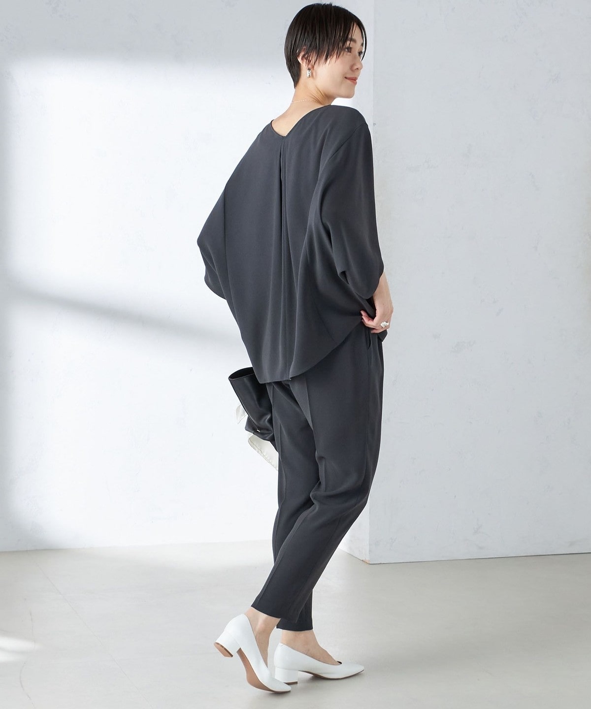 後身頃にはタックを入れ動きを出し、Vネックの襟ぐりで後ろ姿も雰囲気たっぷりに仕上げました。