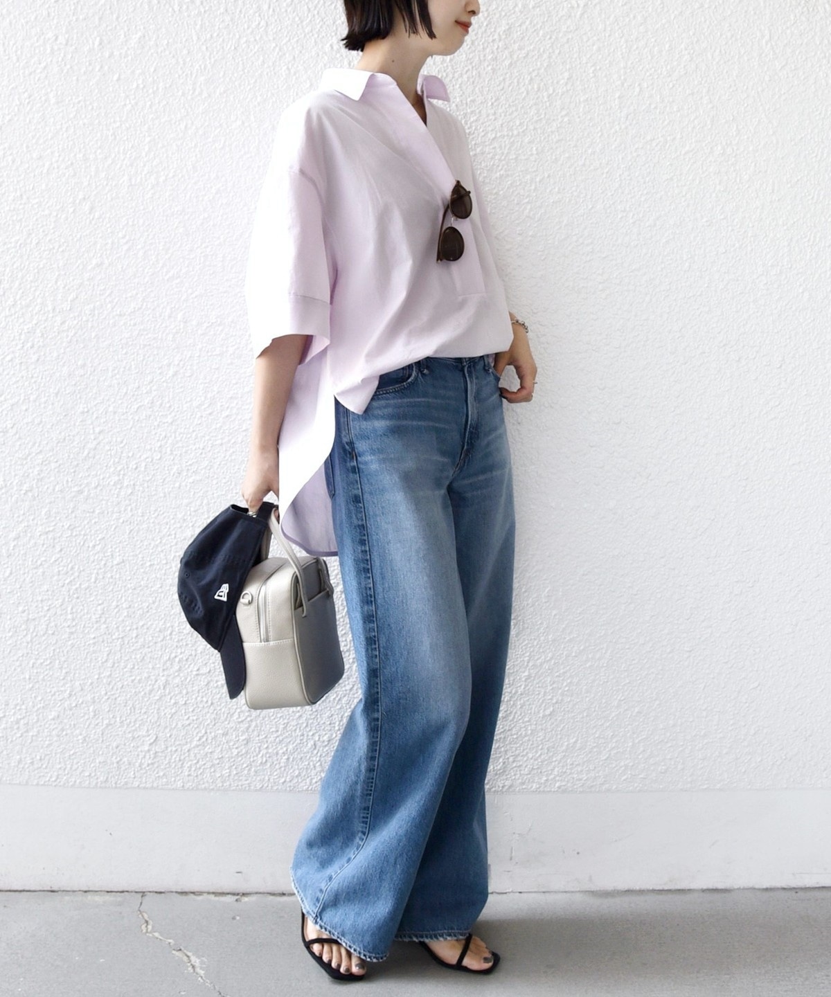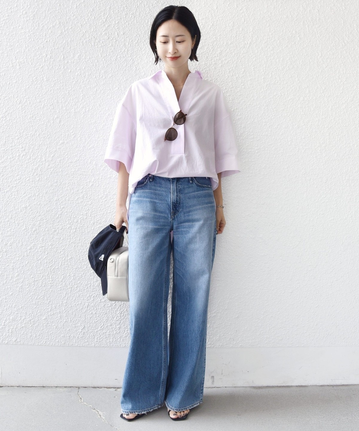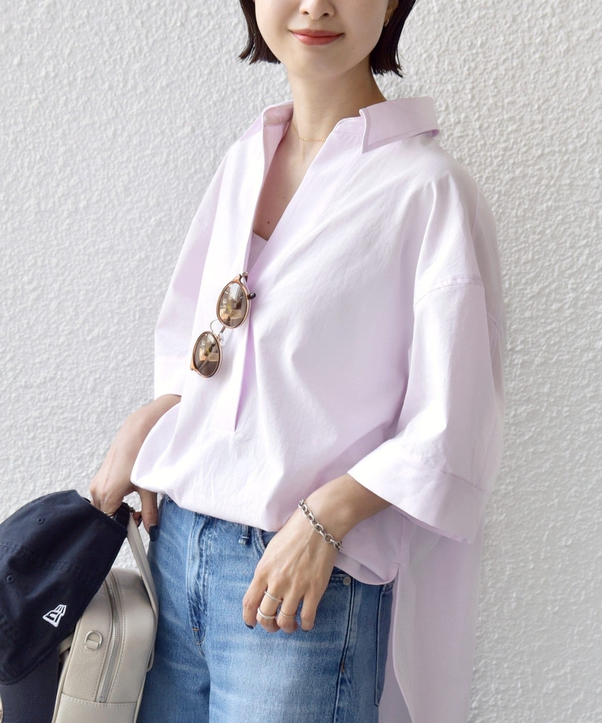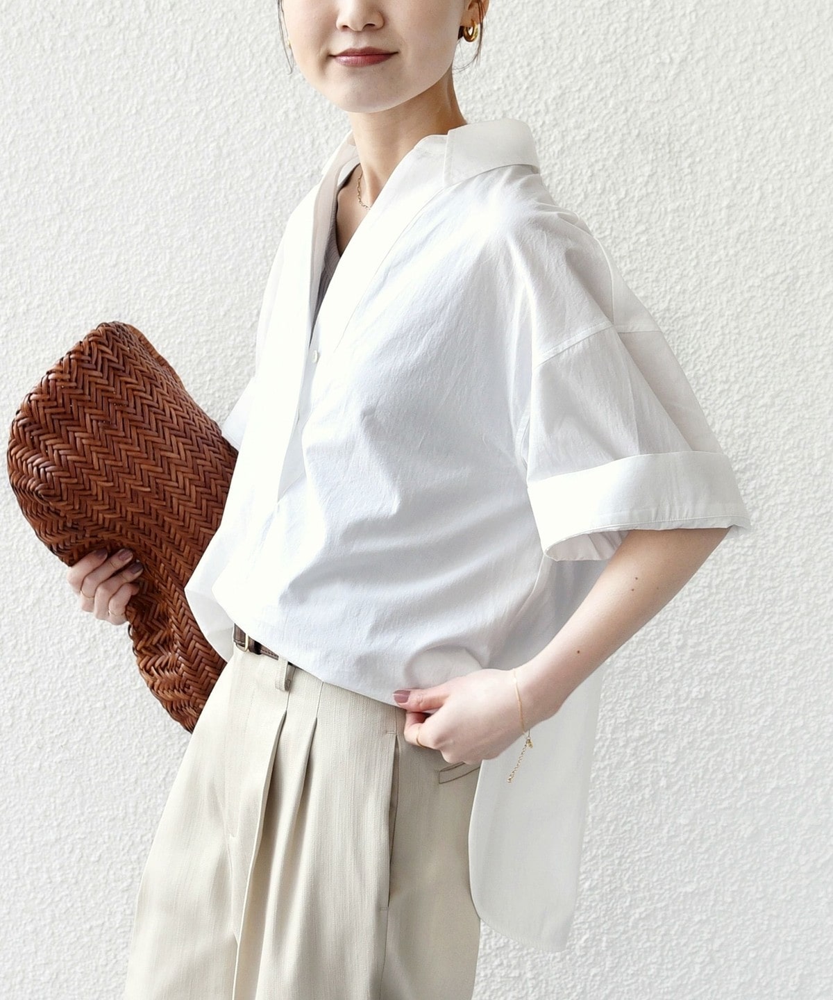 首もとは深めに開いたVネックでインナーとのレイヤードも楽しめる仕様にし大人の抜け感をプラスしました。
