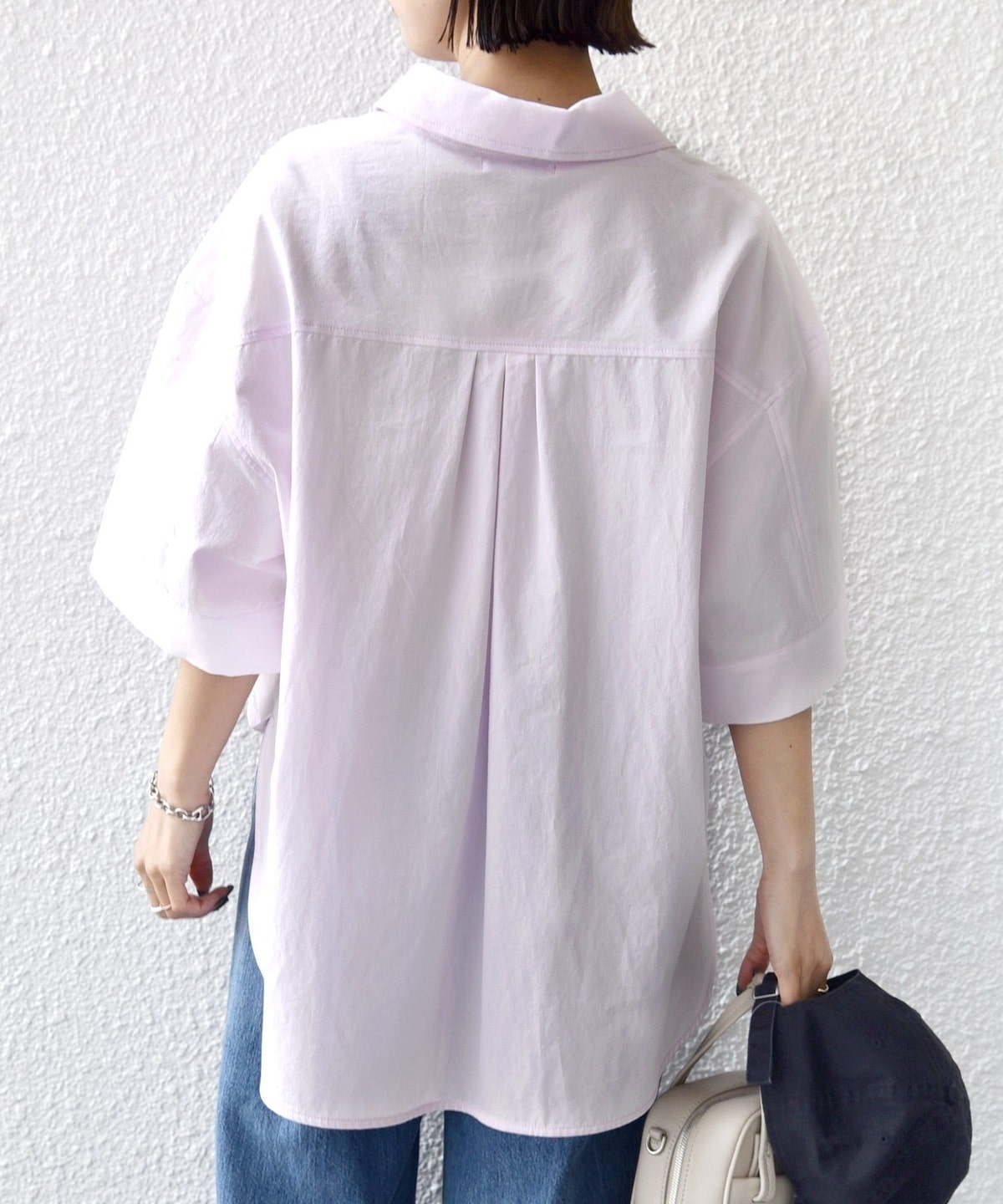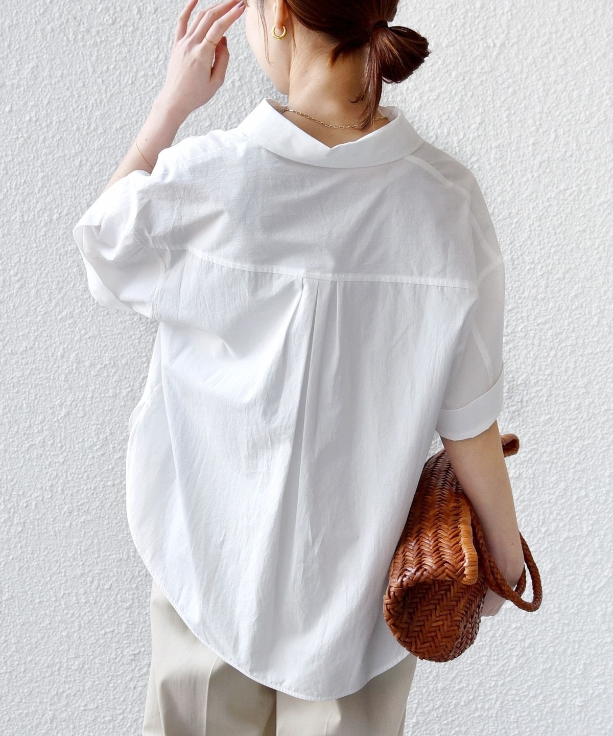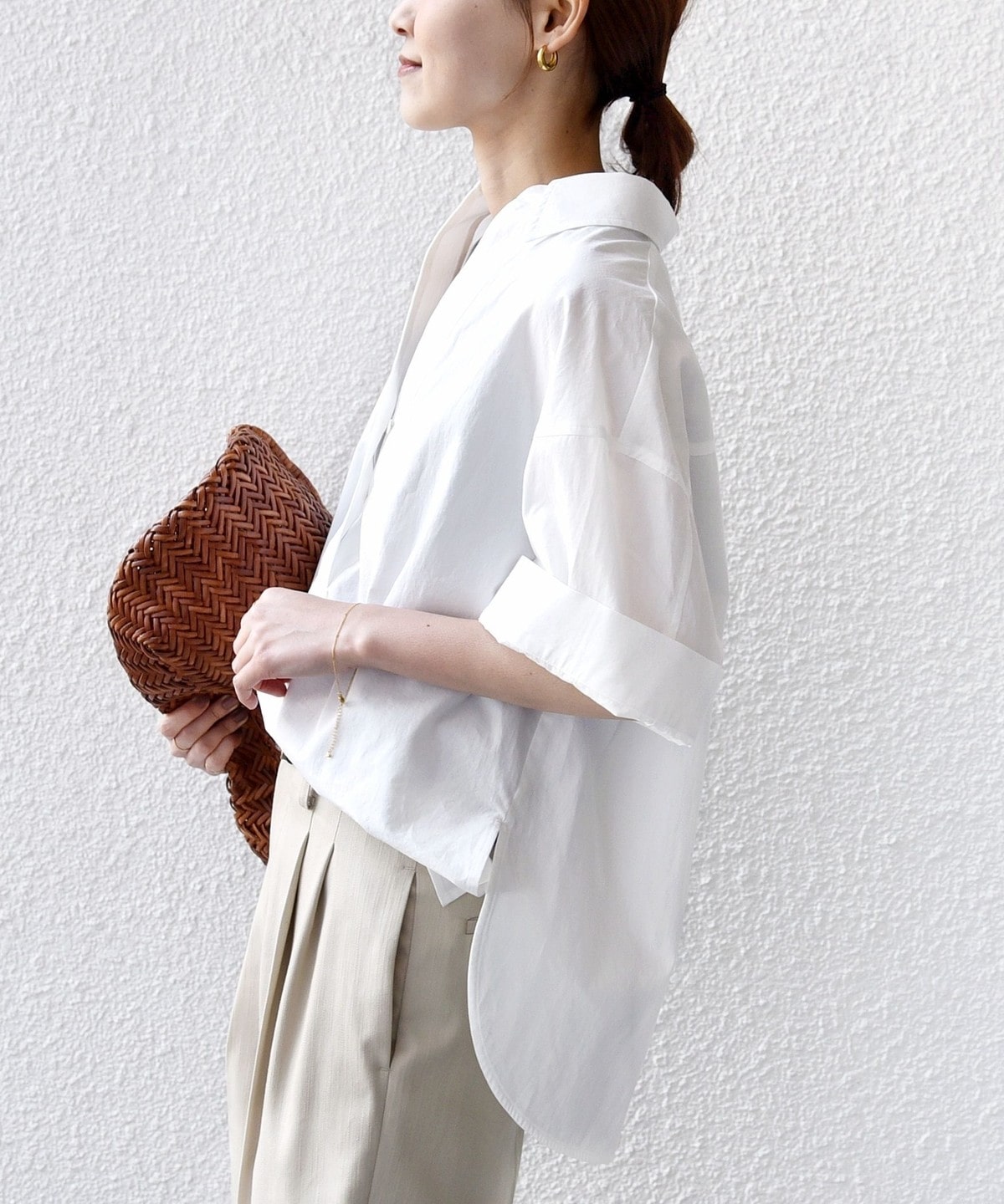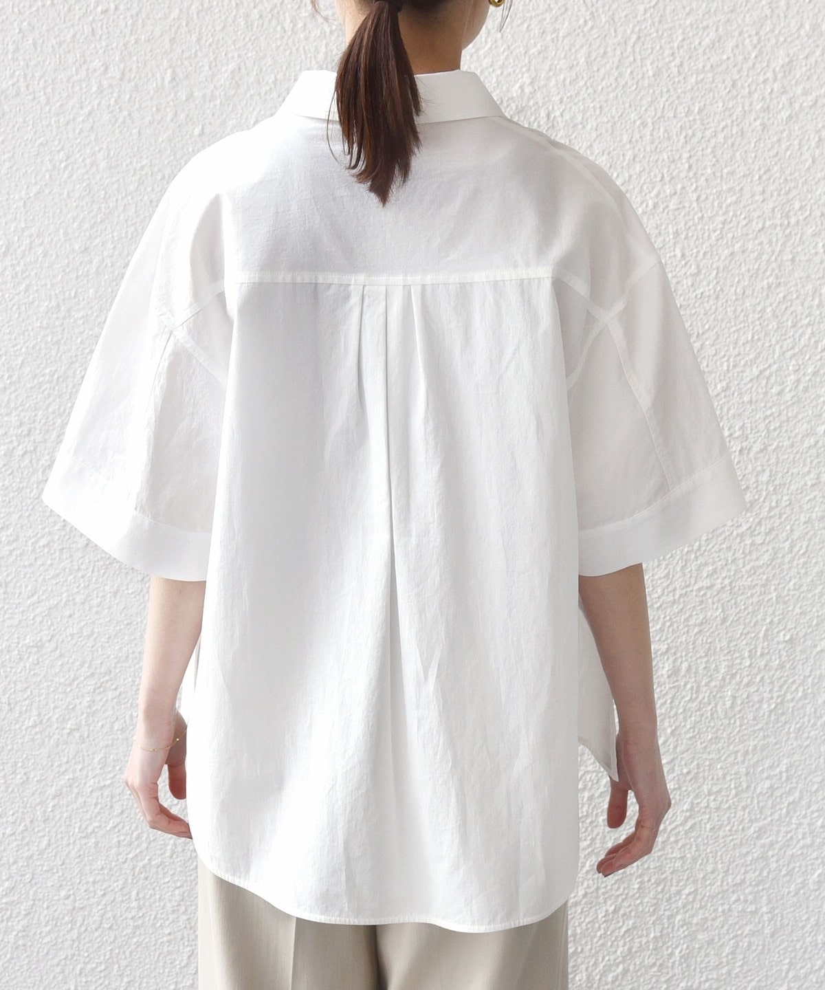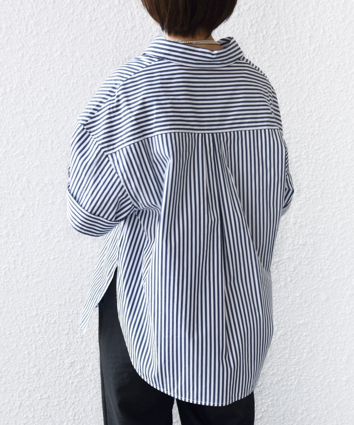 着丈に前後差があるので後ろは安心感のある長さに、前はワイドパンツやタイトスカートを合わせた際にインしなくても着ていただけるようにしています。