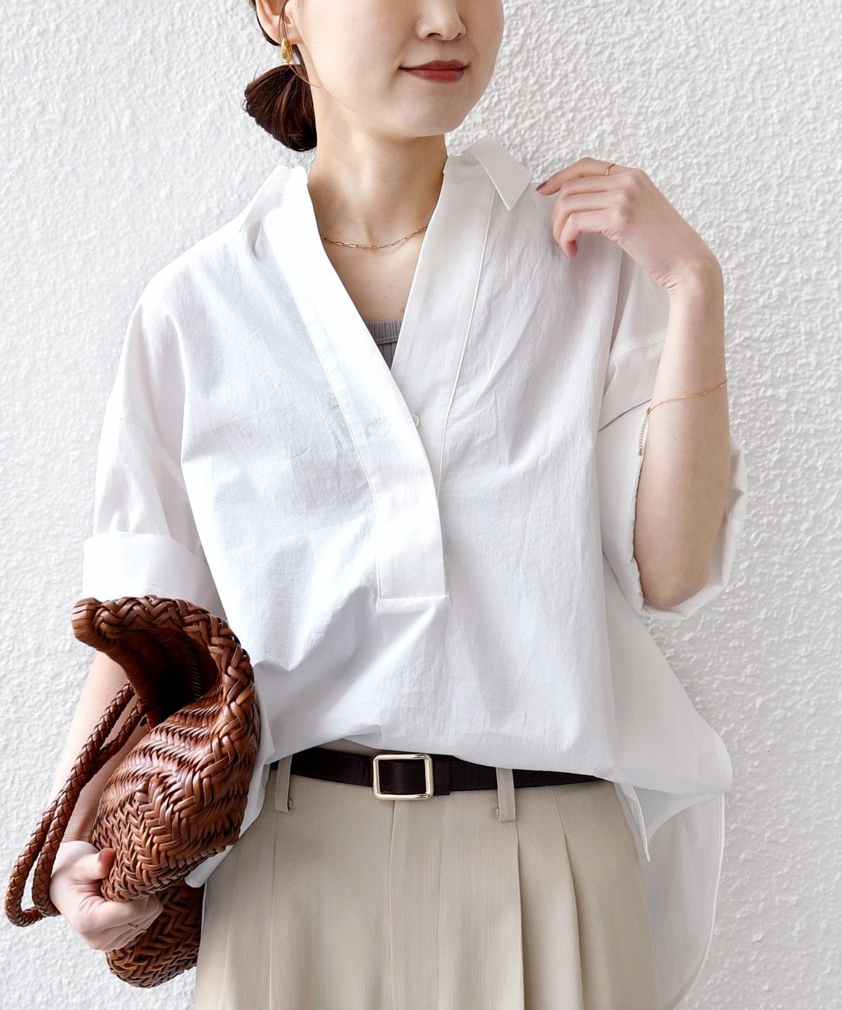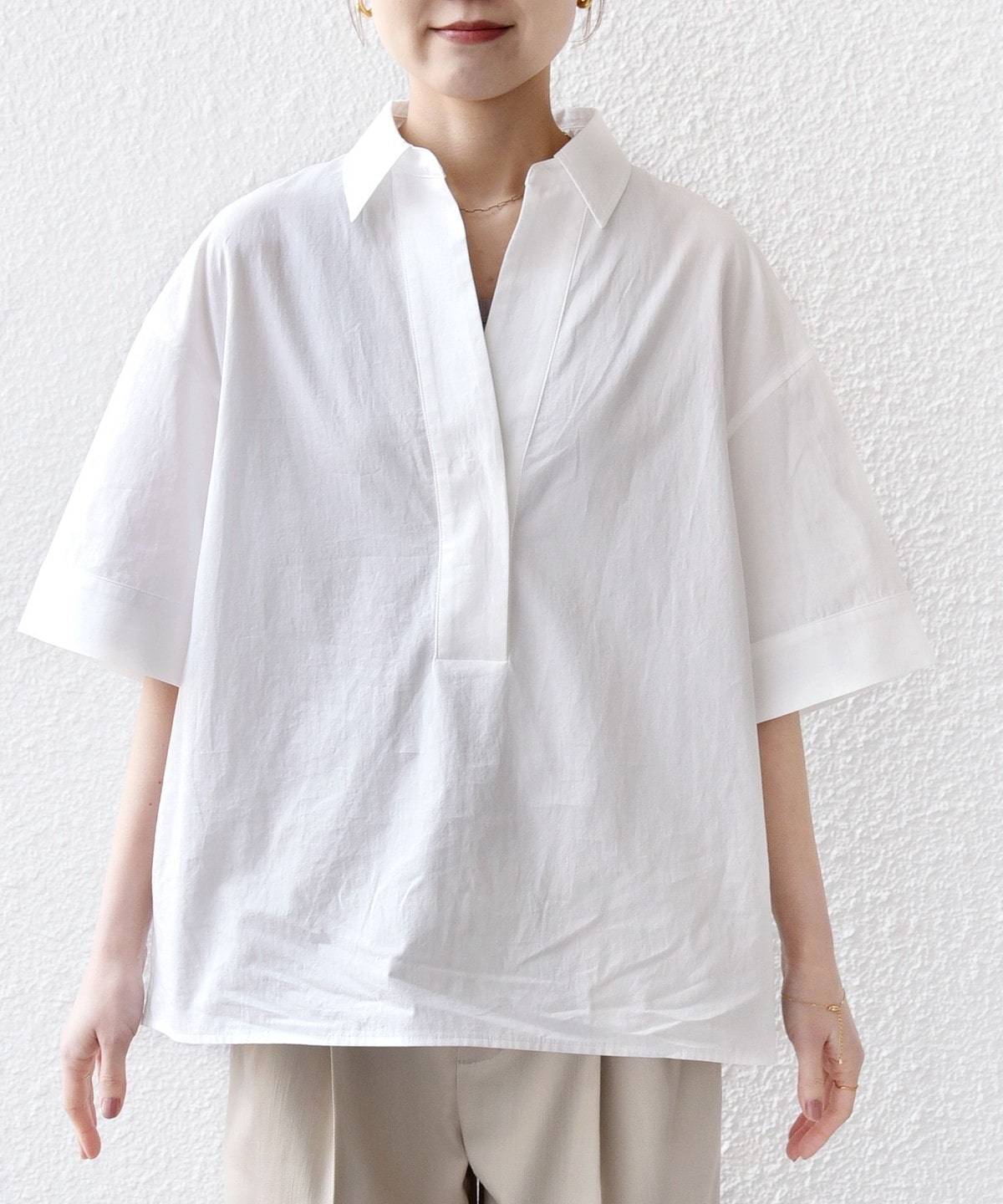 着回しやすさと着映えの両方を兼ね備えた人気のスキッパーシャツです。