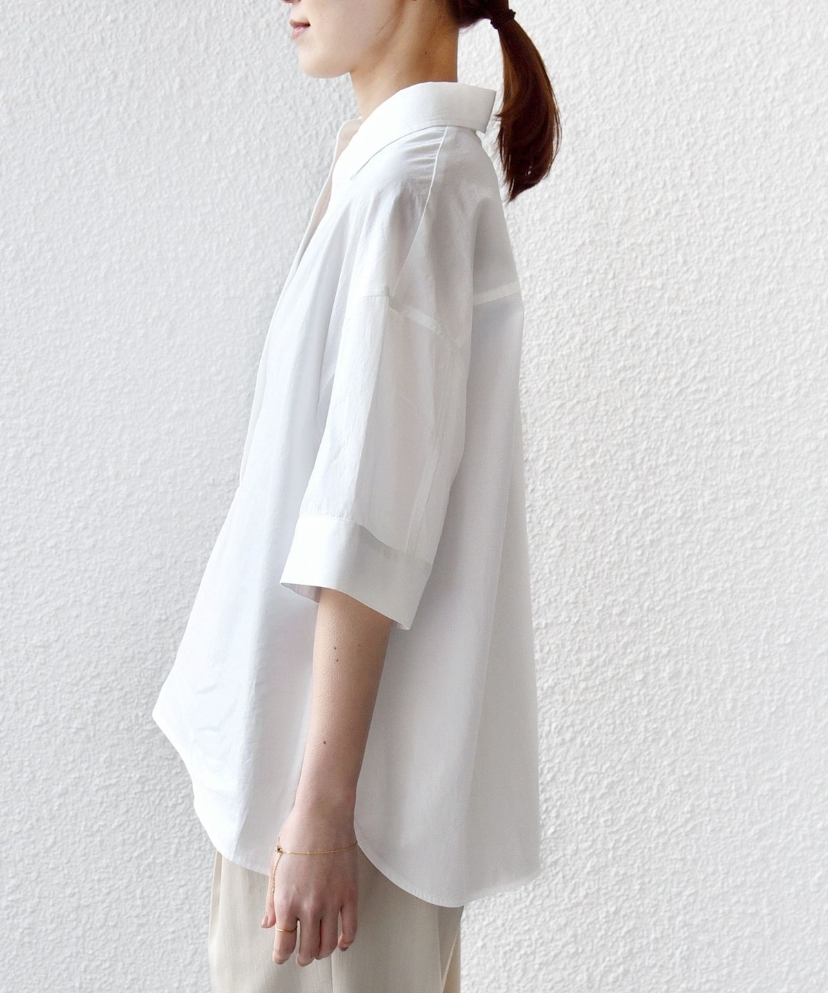 素材は程よいハリ感がありつつも、身体に馴染む生地ですのできちんとした印象でオンオフ兼用で着ていただけるシャツにしました。