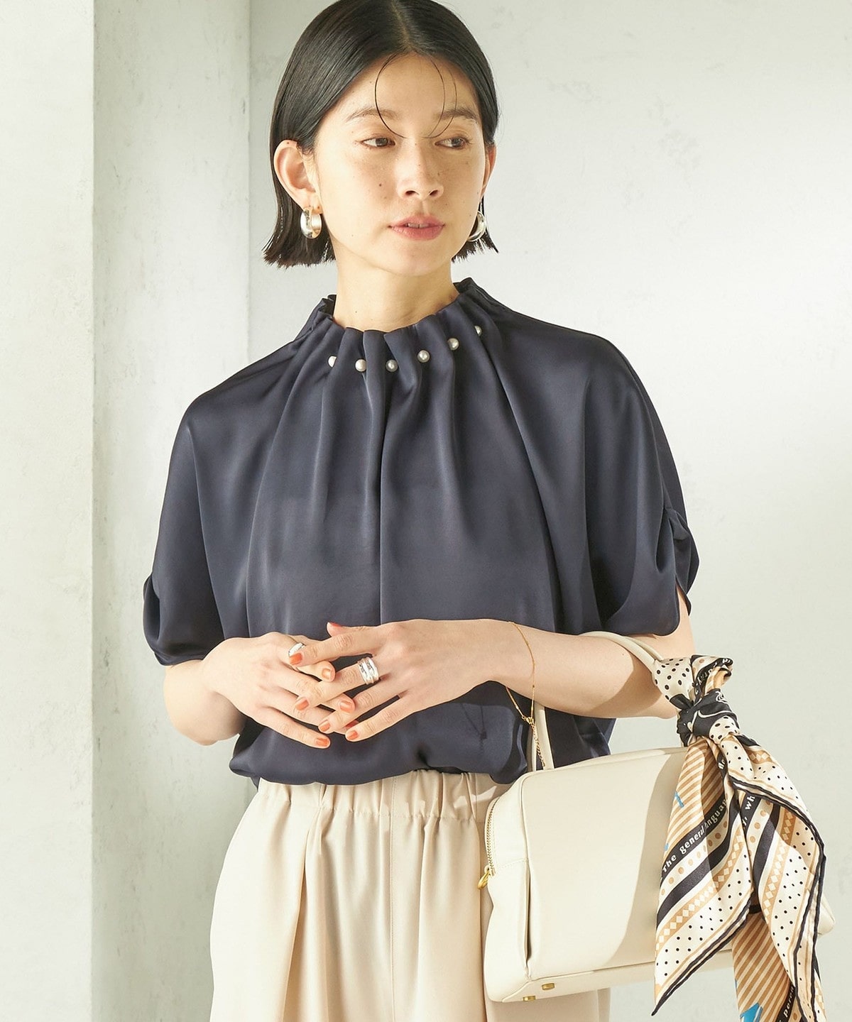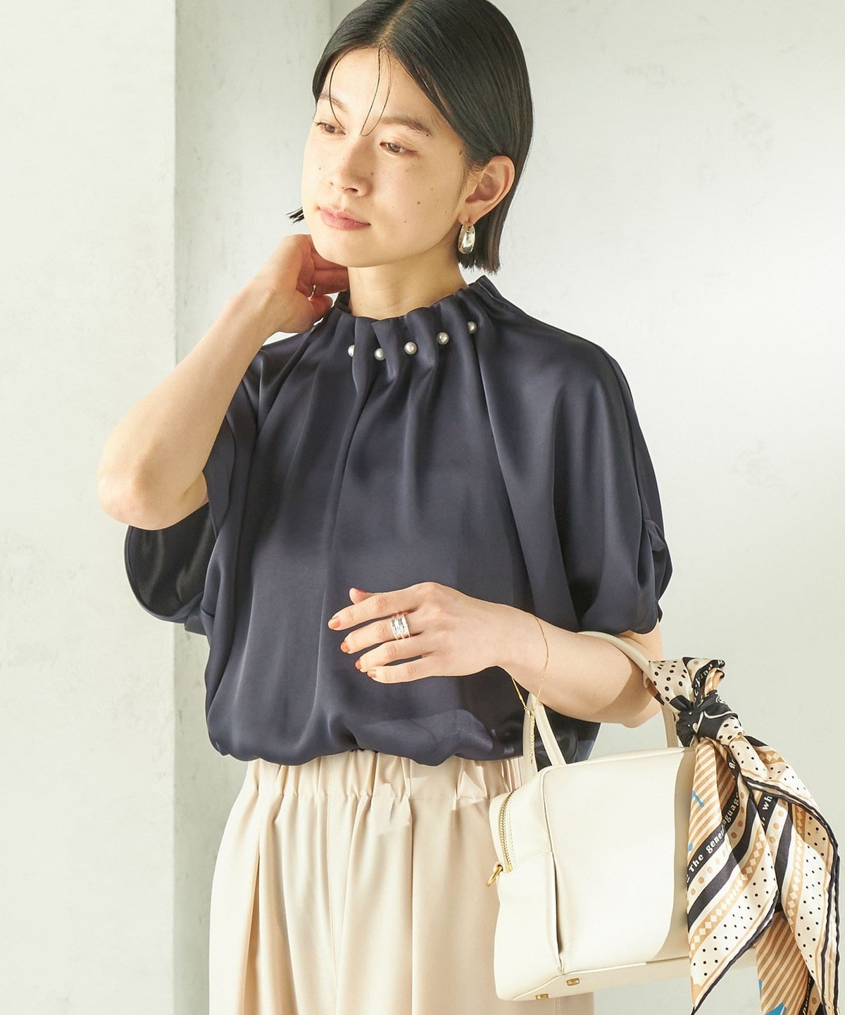 4. 《予約》【一部WEB限定】〈手洗い可能〉パール モチーフ ネック ギャザー ドルマン ブラウス ネイビー