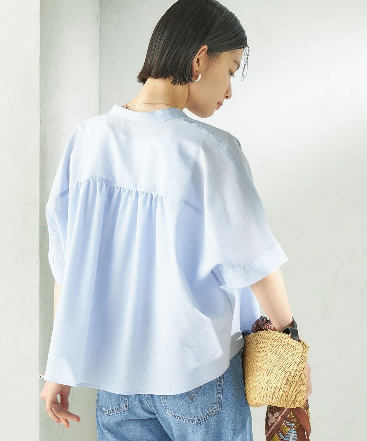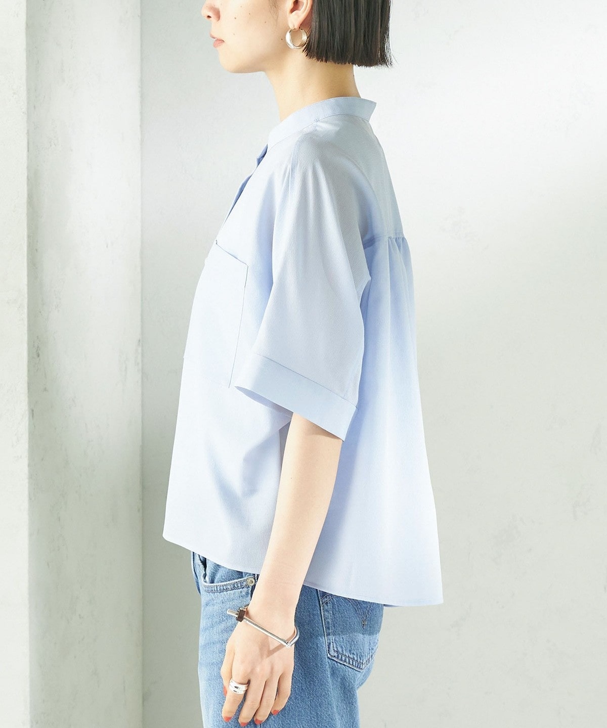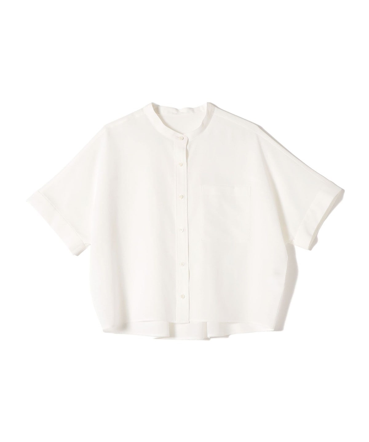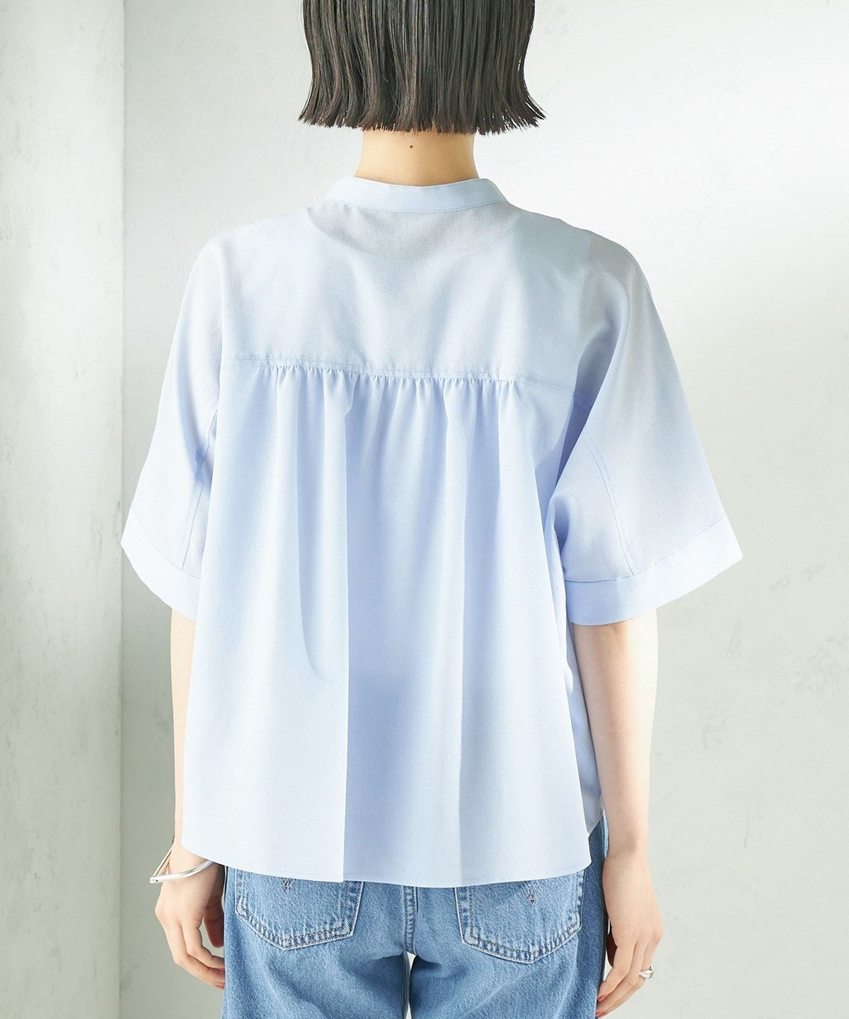 バンドカラーでカジュアルすぎず、洗練された印象に。