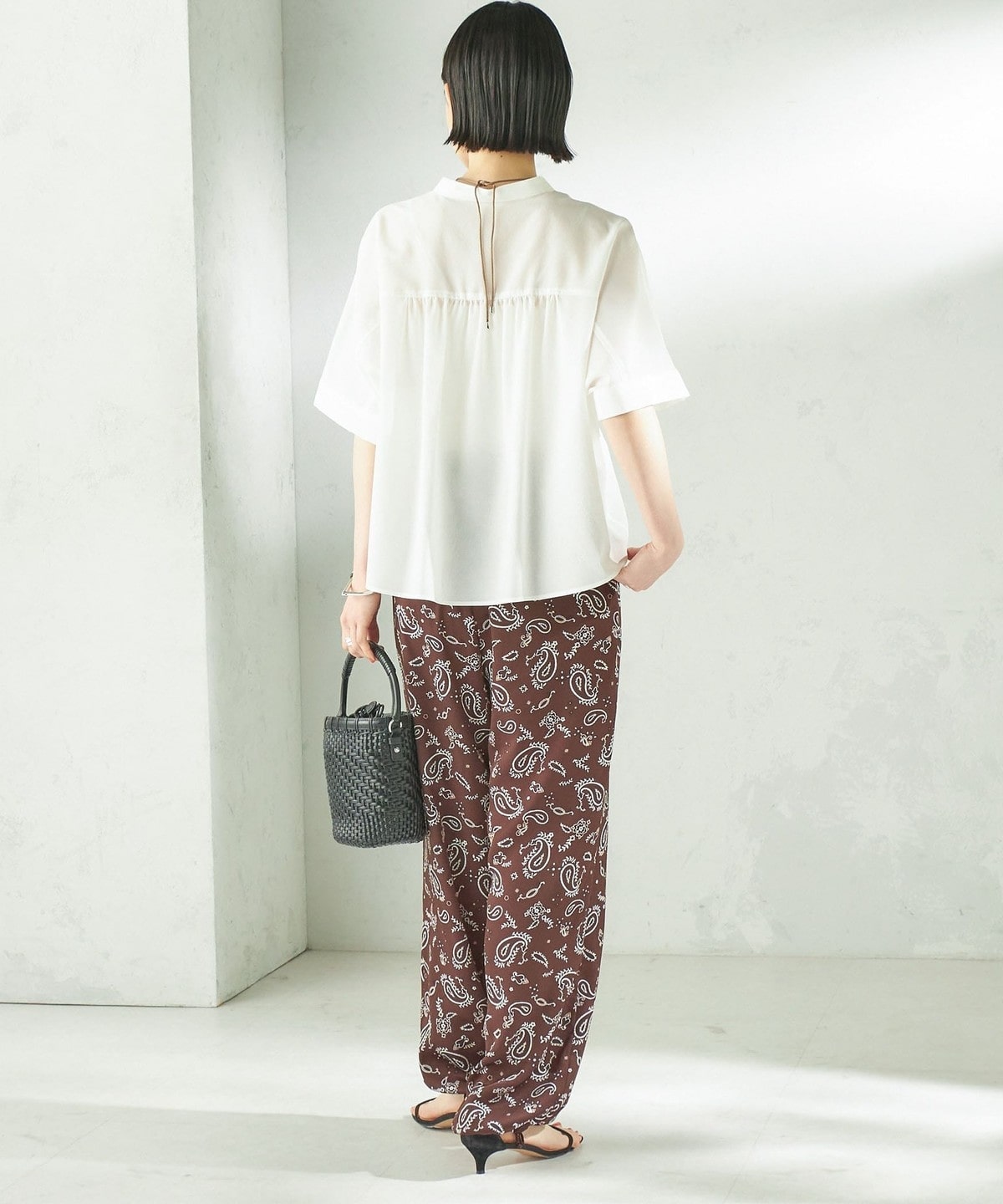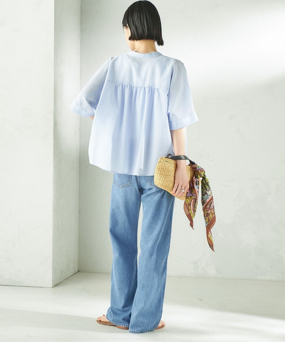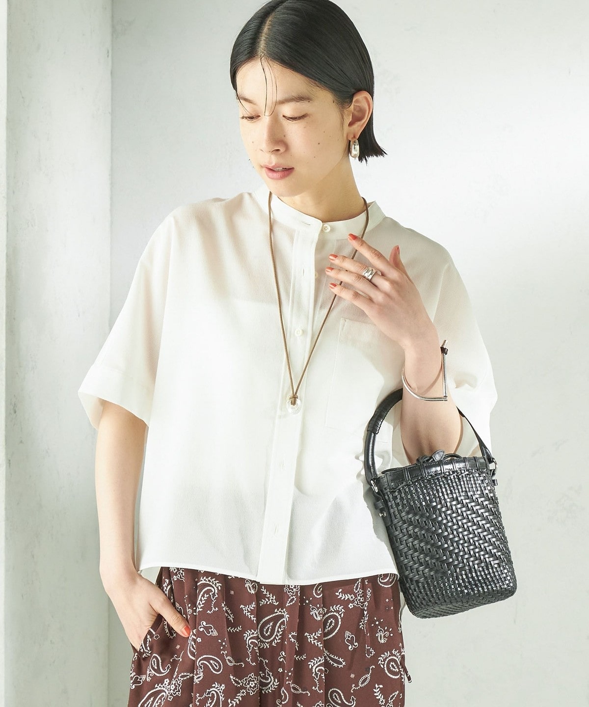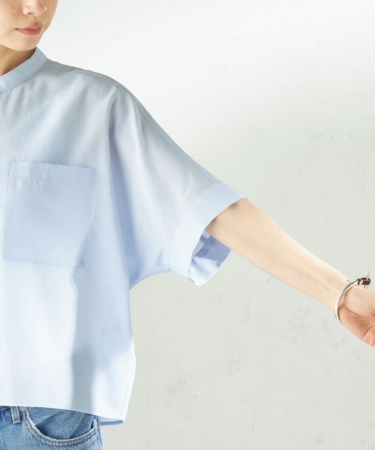 バンドカラーでカジュアルすぎず、洗練された印象に。