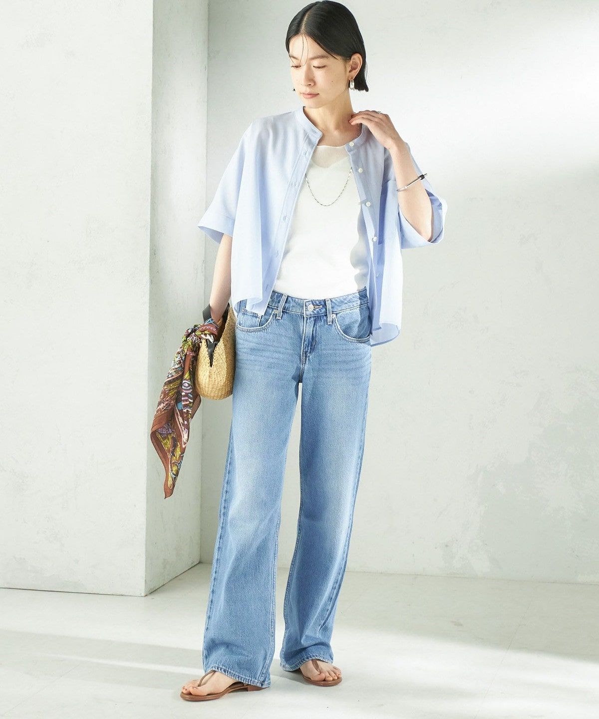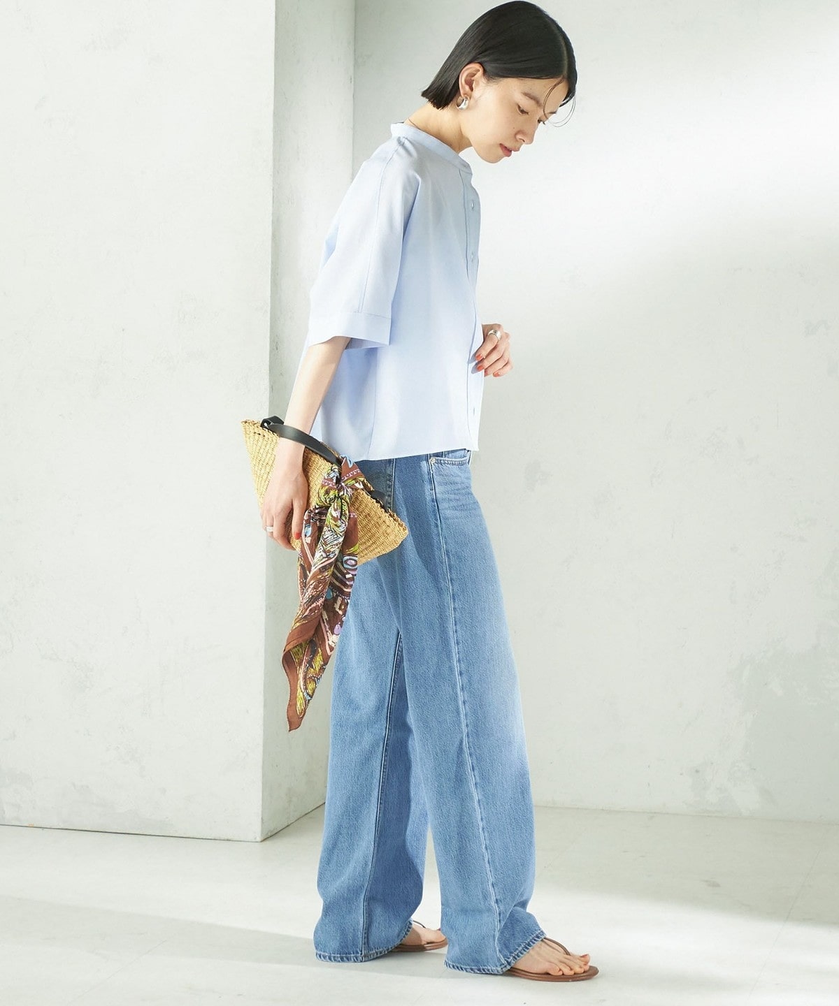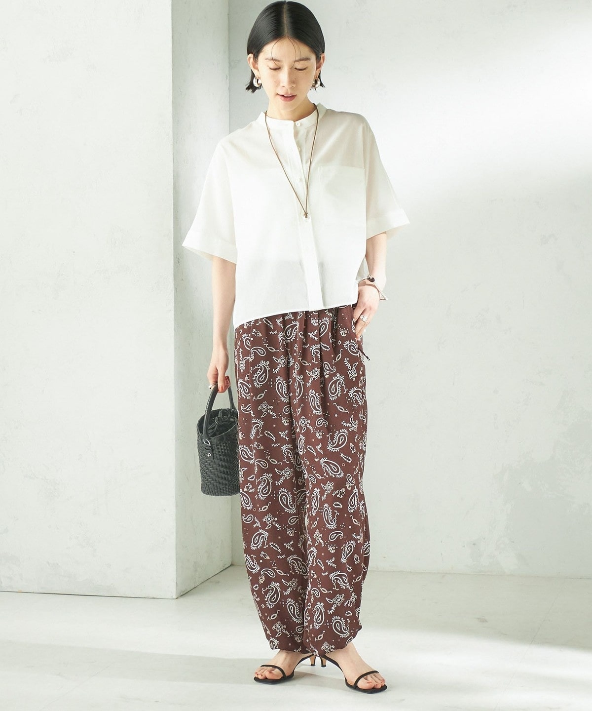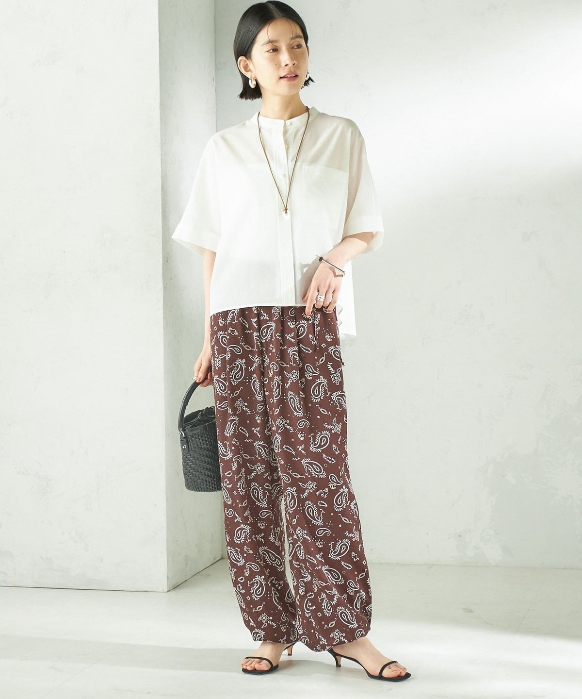 バンドカラーでカジュアルすぎず、洗練された印象に。