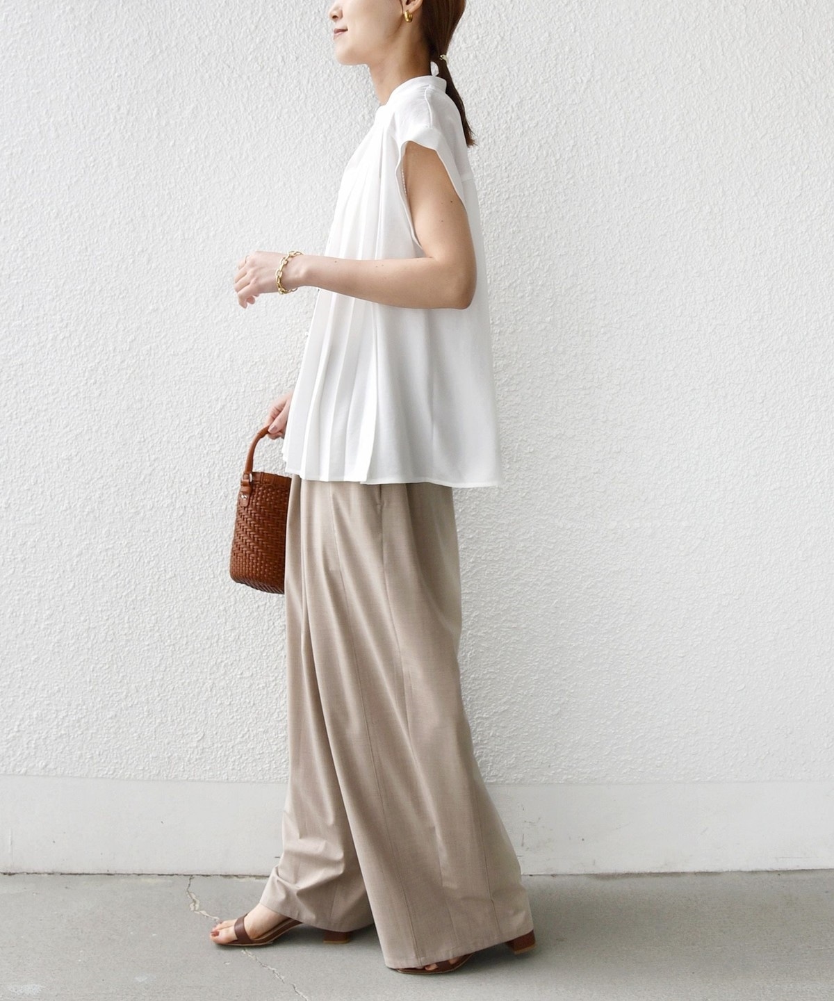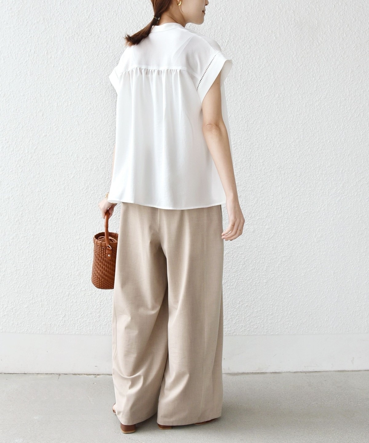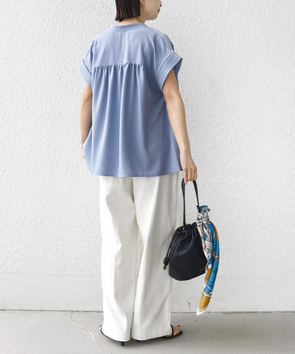 パンツはデニムやカーゴパンツなどのカジュアルボトムからきれいめなワイドパンツ、すっきしたパンツなどを合わせていただける為、オンオフ兼用で着ていただけるブラウスです。